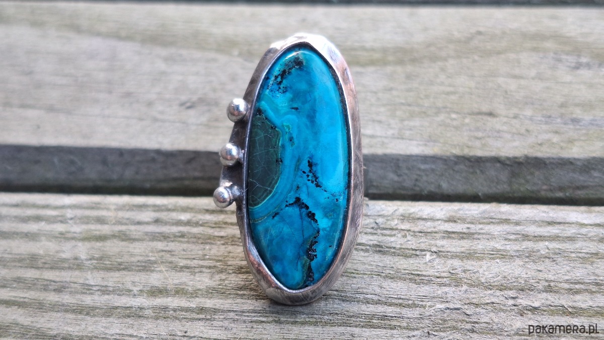 Pierścionek wykonany z miedzi, cyny i chryzokoli z azurytem. Wymiary ok. 3.5 na 1.5 cm. Regulowany. Nie jest ciężki.