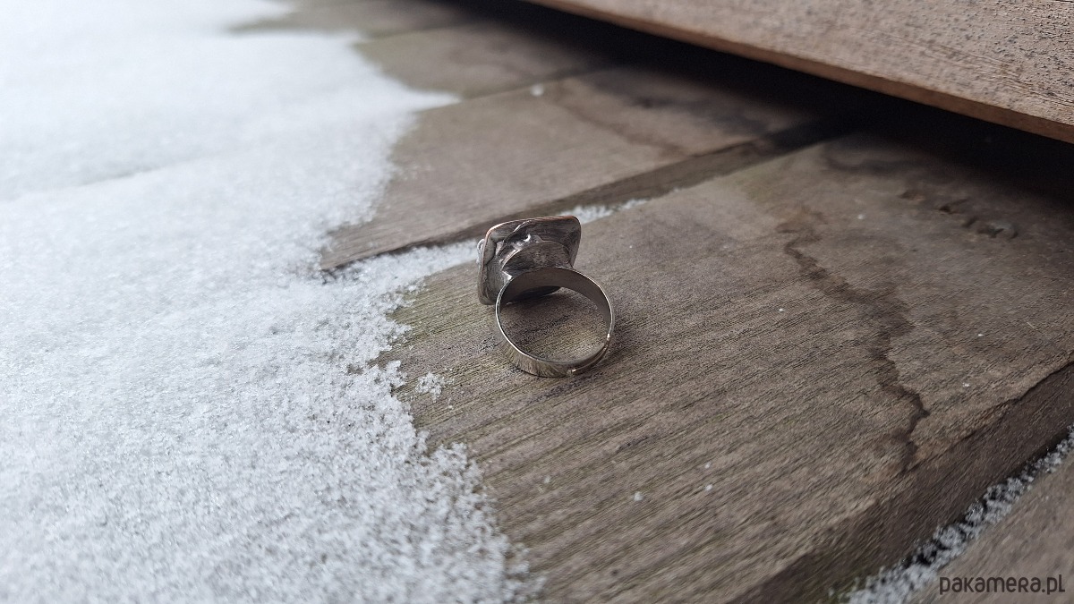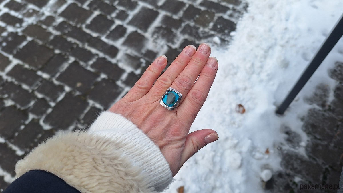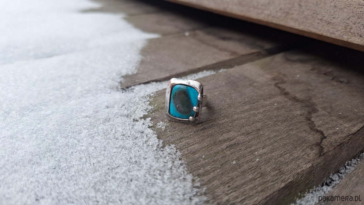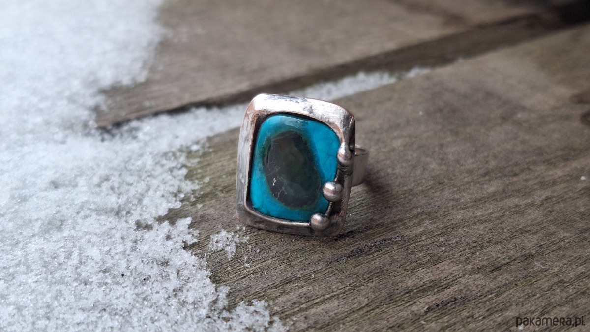 Pierścionek wykonany z miedzi, cyny i chryzokoli z azurytem. Wymiary ok. 1.8 na 1.5 cm. Regulowany. Nie jest ciężki.