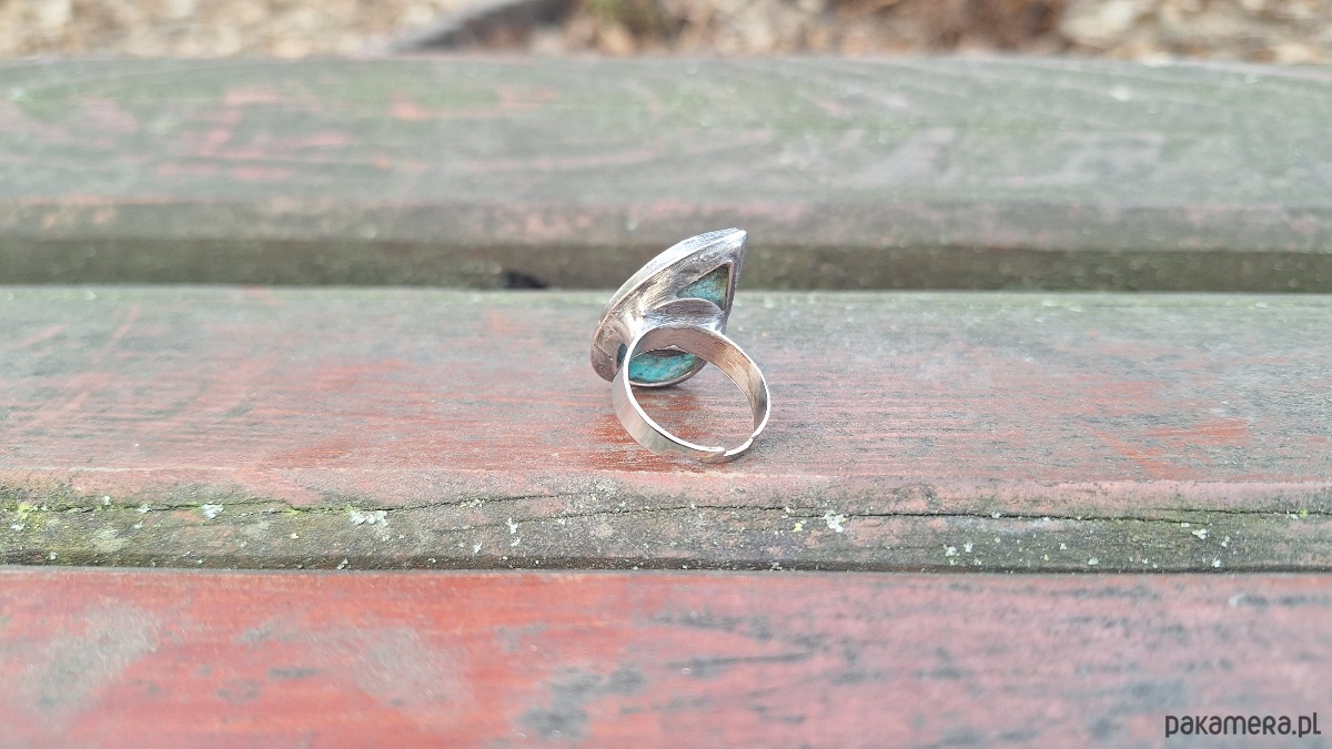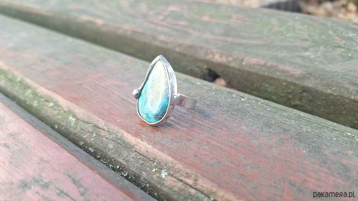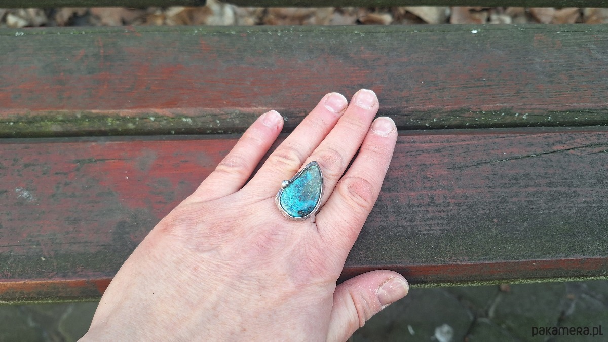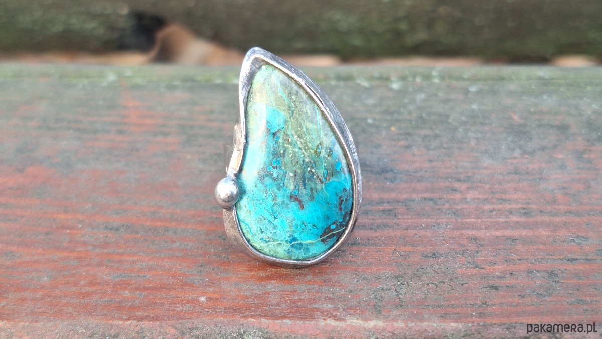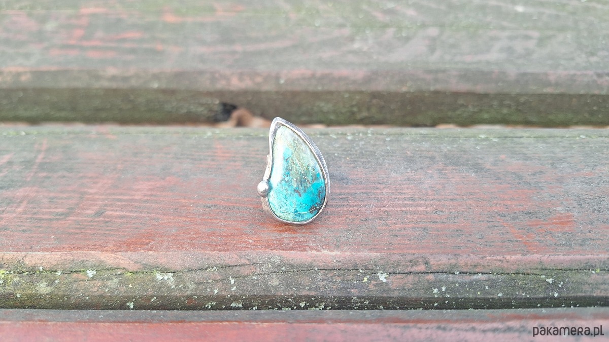 Pierścionek wykonany z miedzi, cyny i chryzokoli z azurytem. Wymiary ok. 2.8 na 1.7 cm. Regulowany. Nie jest ciężki.