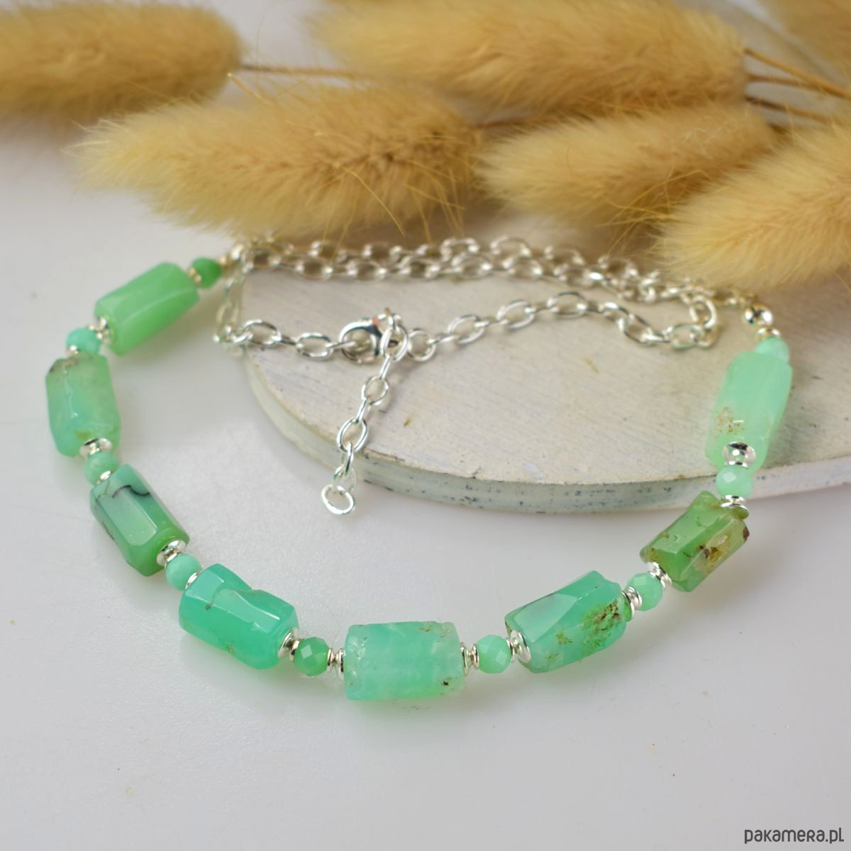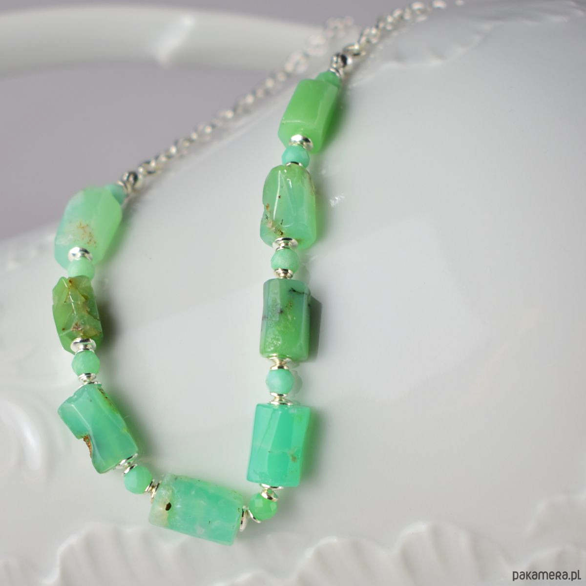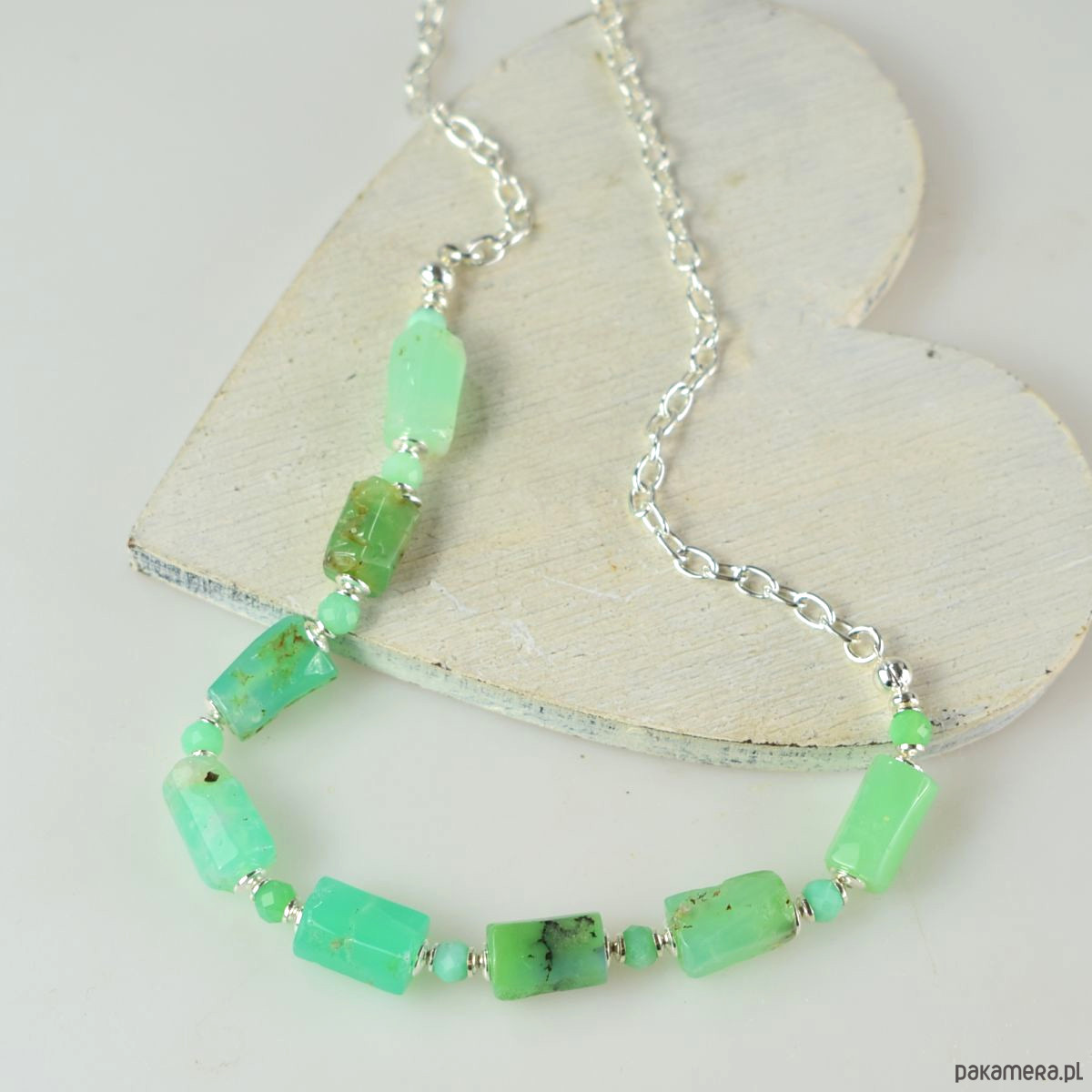 Naszyjnik wykonany w całości ze srebra (próba 925) z chryzoprazem. Długość regulowana do maksymalnie 45 cm.. Biżuteria zostanie ozdobnie zapakowana.