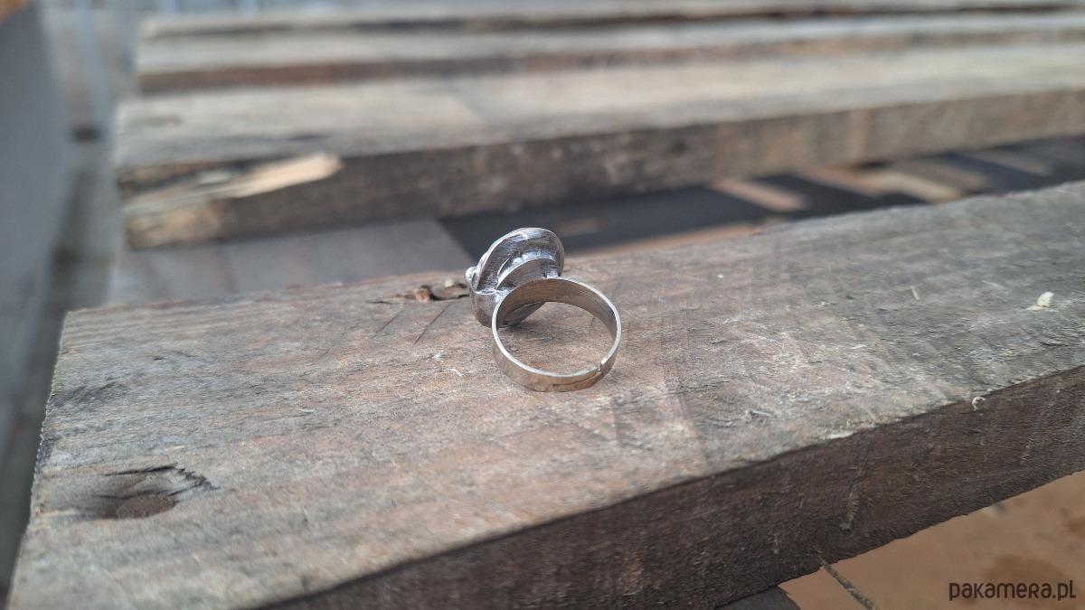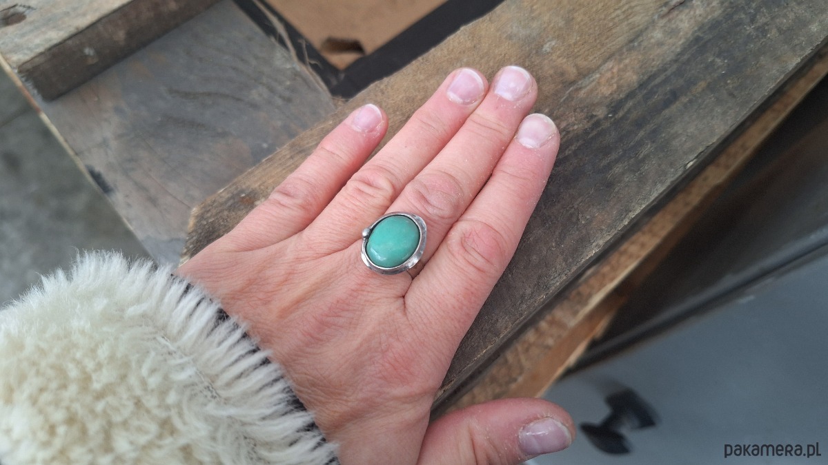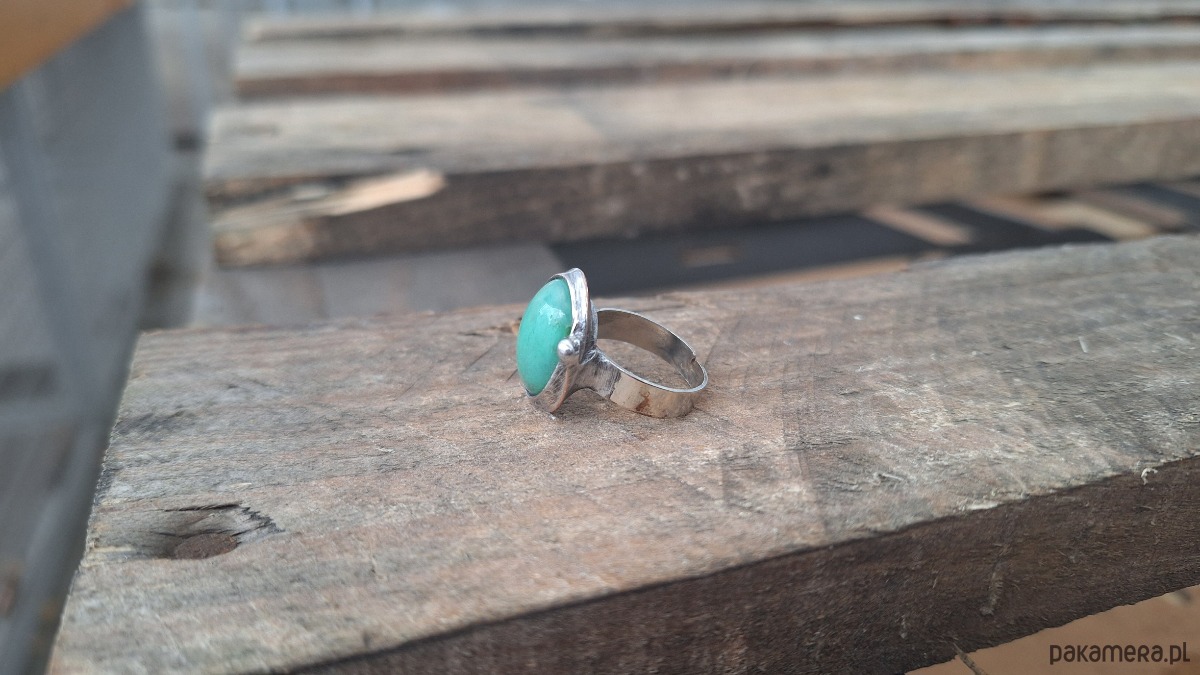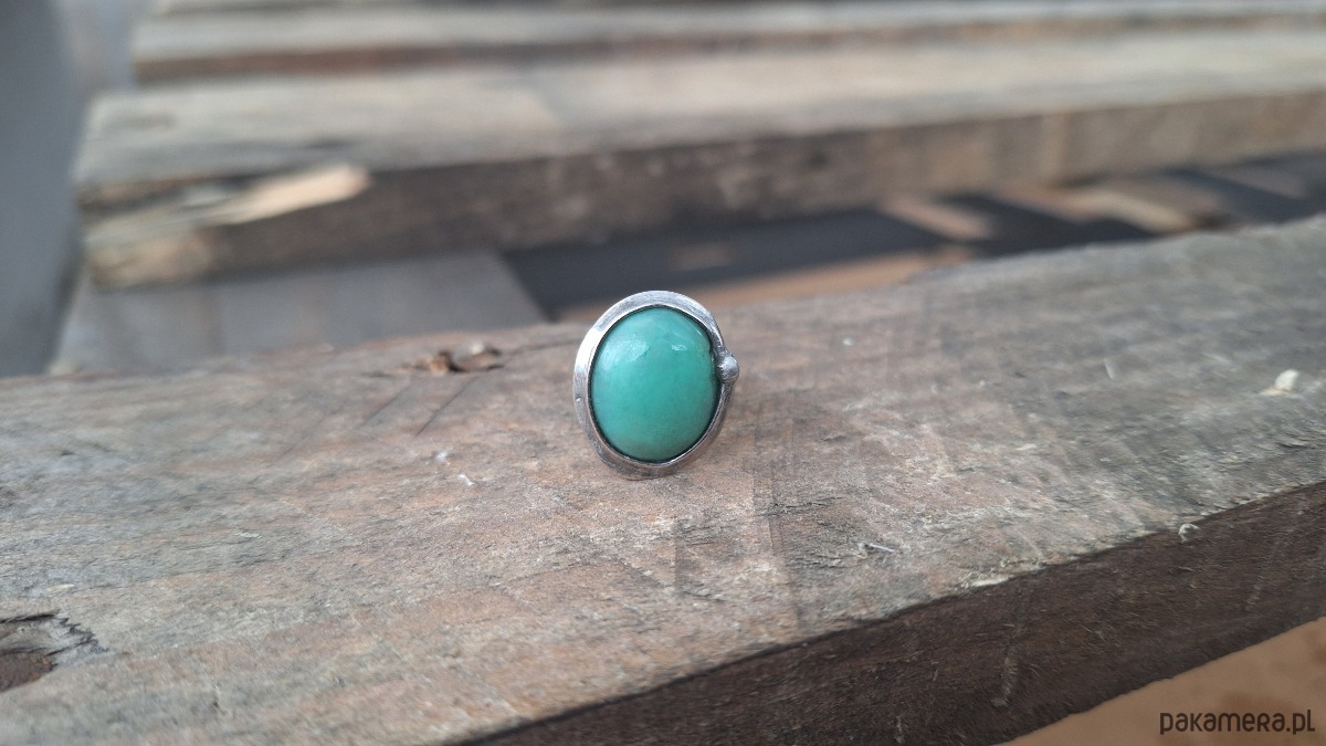 Pierścionek wykonany z miedzi, cyny i naturalnego chryzoprazu. Wymiary ok. 1.8 na 1.5 cm. Regulowany. Nie jest ciężki.