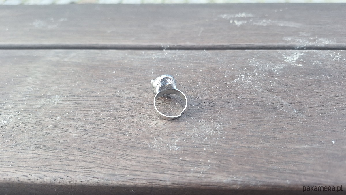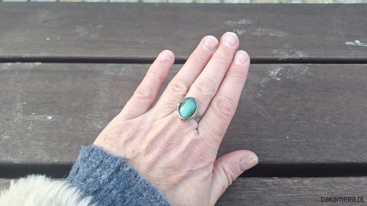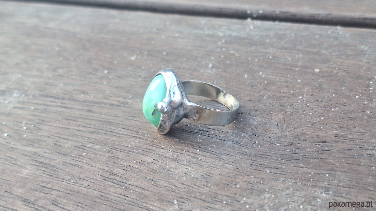 Pierścionek wykonany z miedzi, cyny i naturalnego chryzoprazu. Wymiary ok. 1.7 na 1.3 cm. Regulowany. Nie jest ciężki.