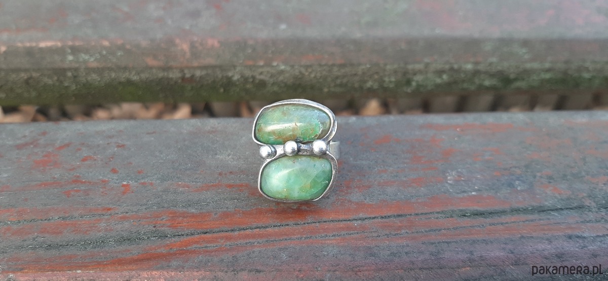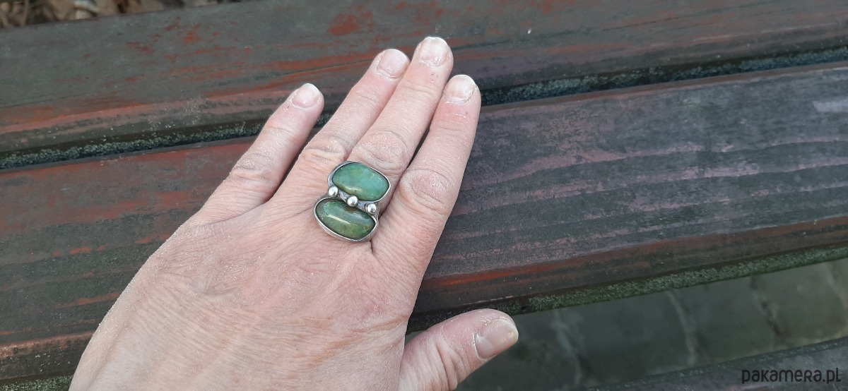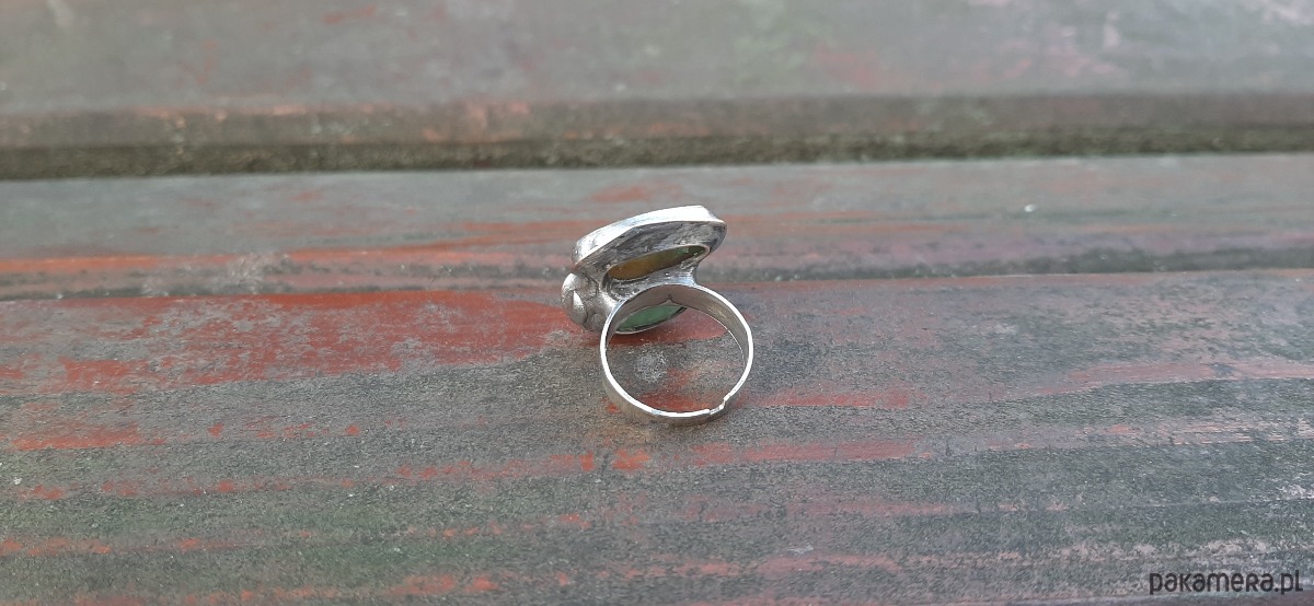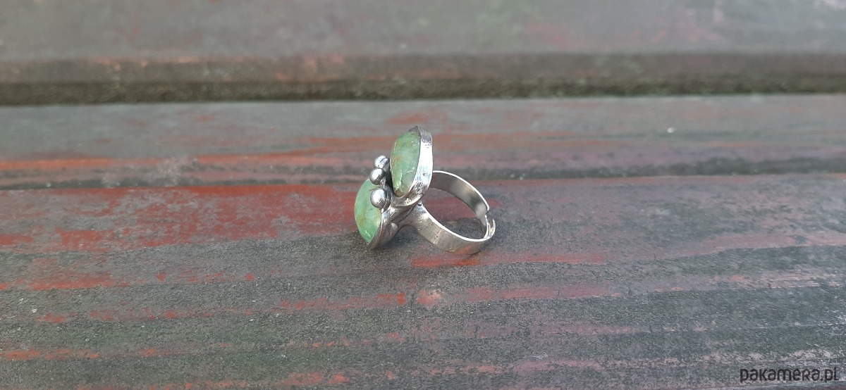 Pierścionek wykonany z miedzi, cyny i naturalnego chryzoprazu. Wymiary ok. 2.2 na 2 cm. Regulowany. Nie jest ciężki.
