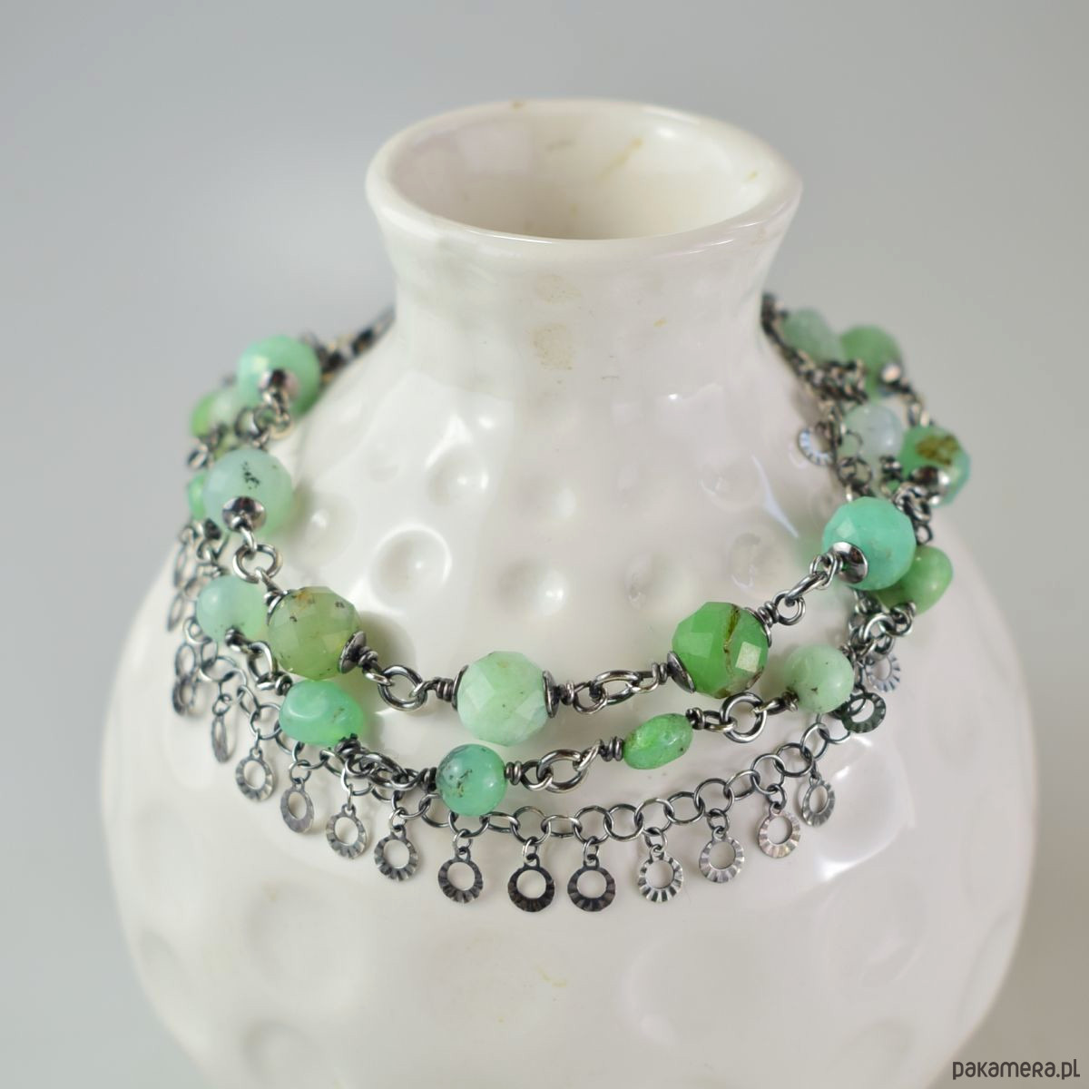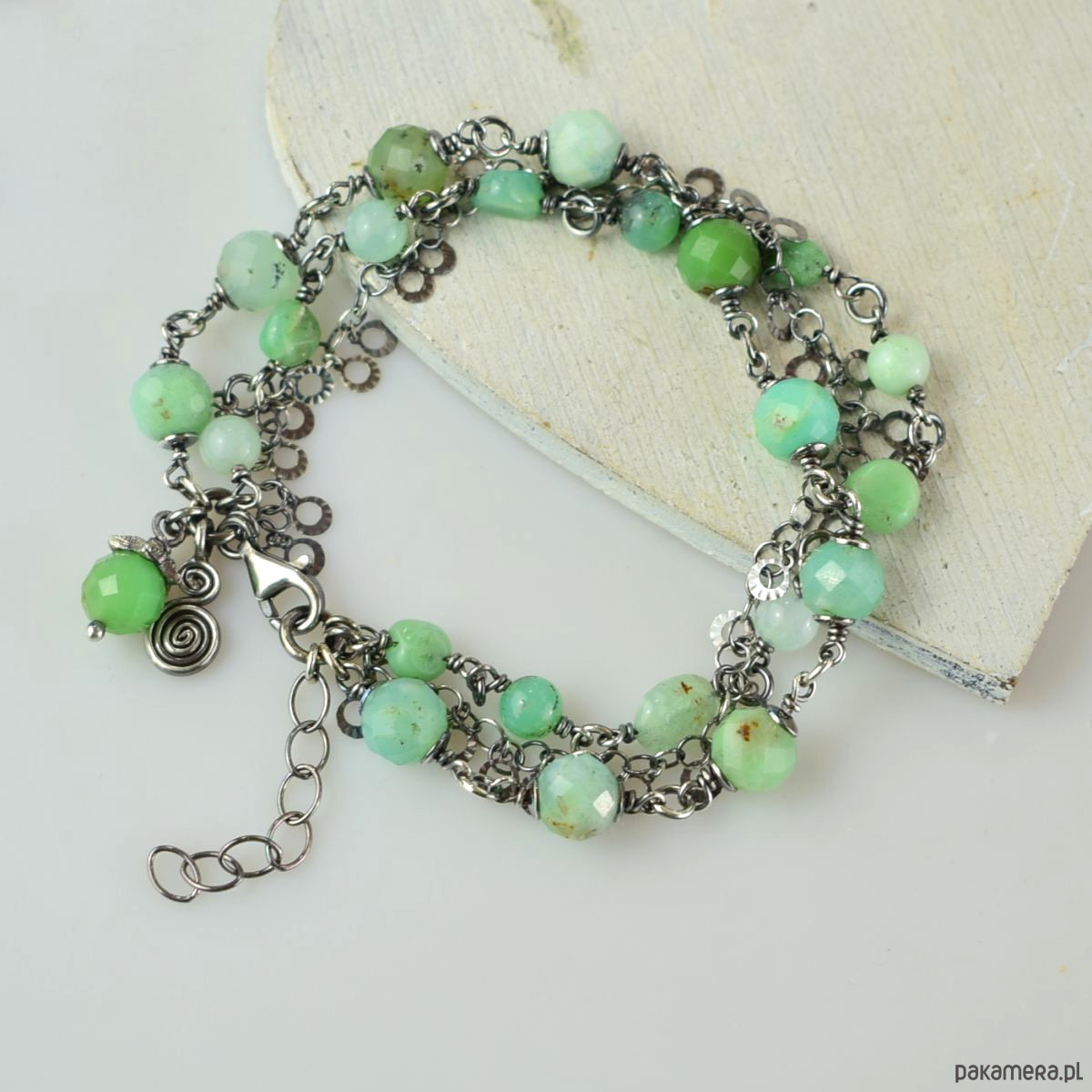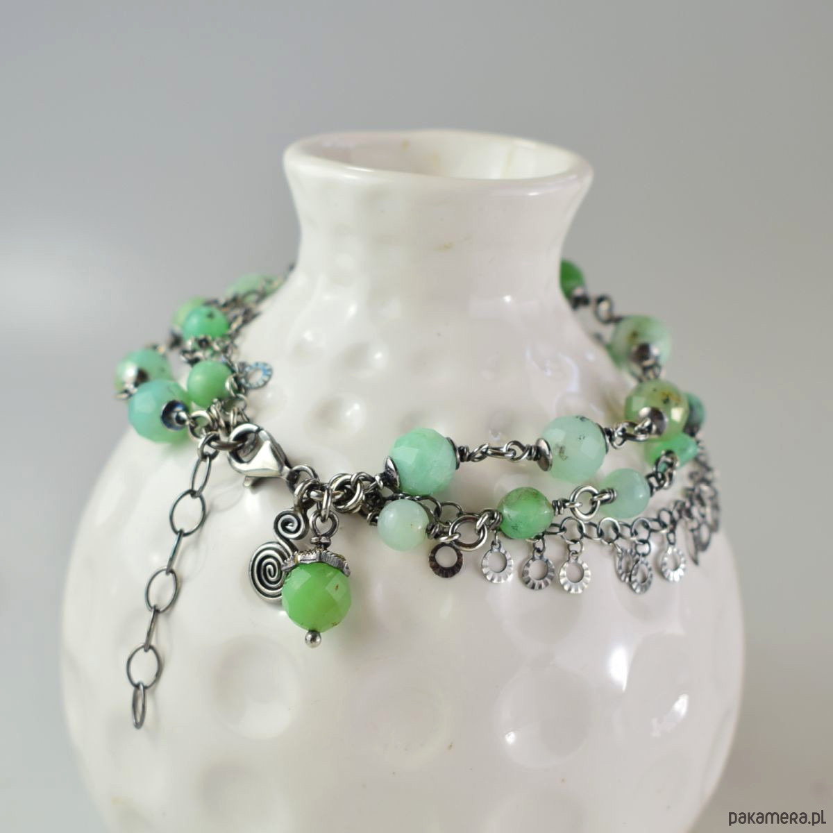 Bransoletka wykonana w całości ze srebra (próba 925) z chryzoprazem. Całość została zoksydowana (przyciemniona) i wypolerowana. Długość regulowana 20,5 - 24 cm. Biżuteria zostanie ozdobnie zapakowana.