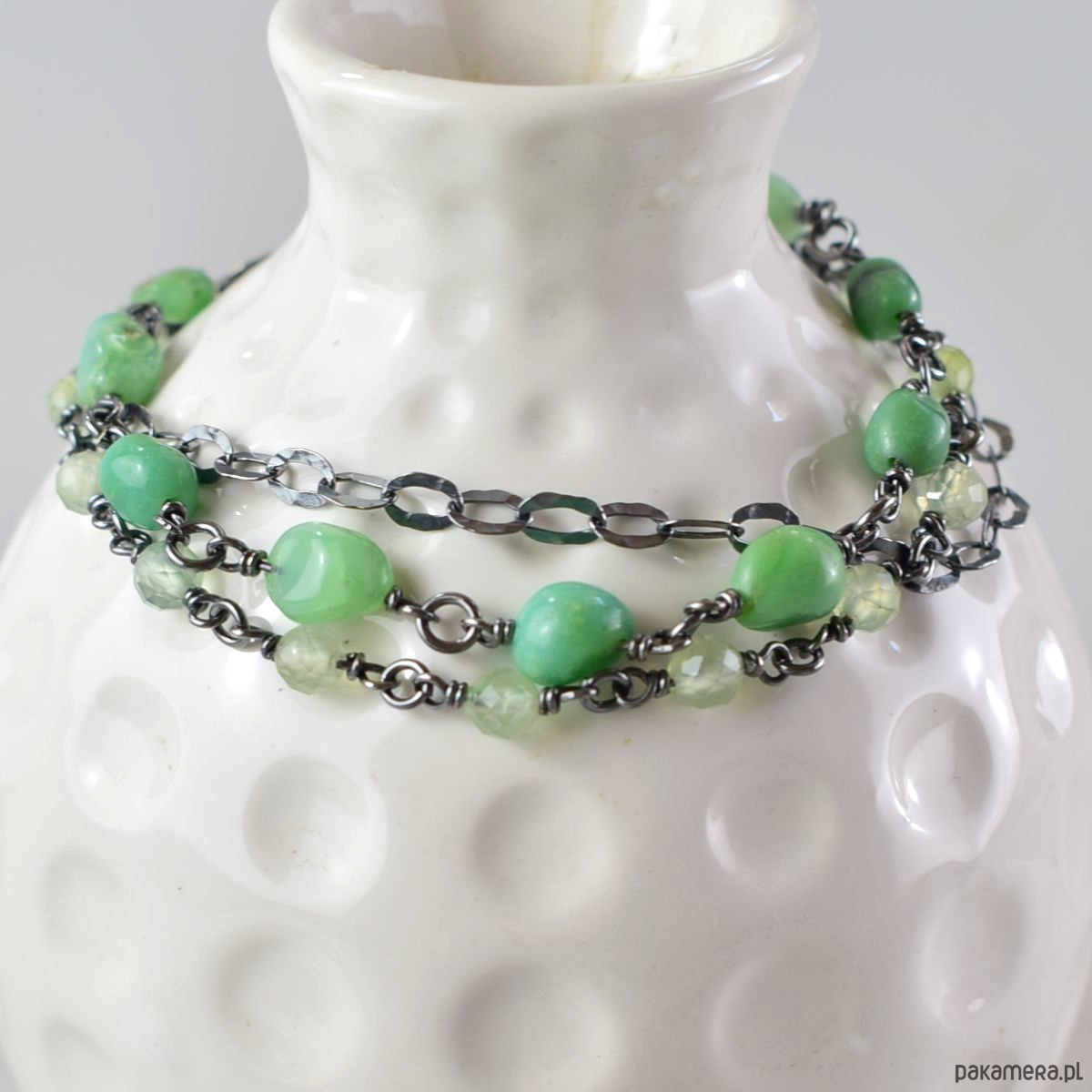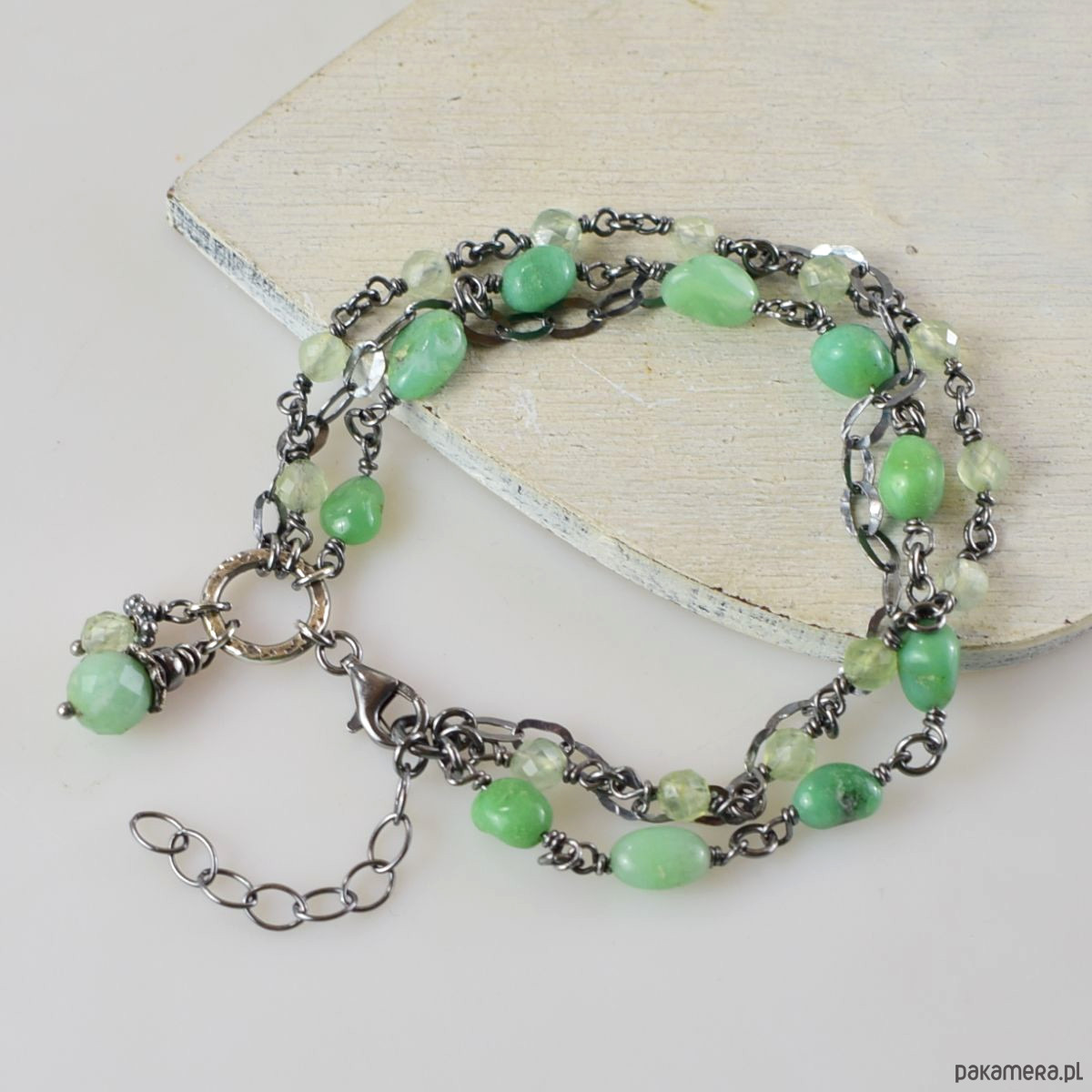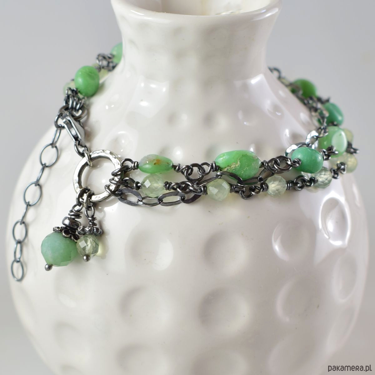 Bransoletka wykonana w całości ze srebra (próba 925) z chryzoprazem i frenitem. Całość została zoksydowana (przyciemniona) i wypolerowana. Długość regulowana 21 - 25 cm. Biżuteria zostanie ozdobnie zapakowana.