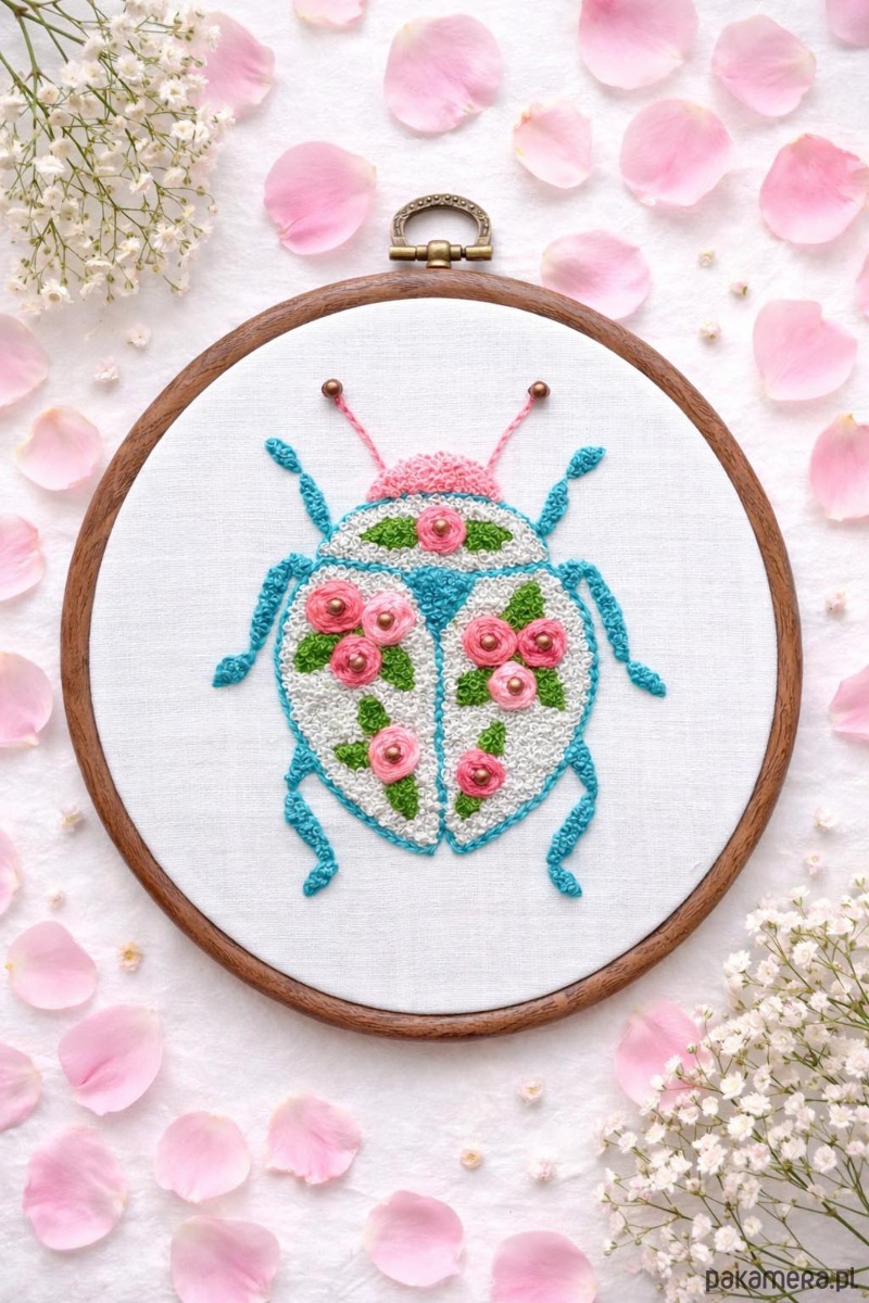 Niezwykły haft chrząszcza został zainspirowany różanym ogrodem – każdy ścieg to małe dzieło sztuki, które wprowadza do wnętrza harmonię i spokój. Umieszczony w eleganckim tamborku, może zawisnąć na ścianie, przypominając Ci codziennie o pięknie natury i drobnych radościach.