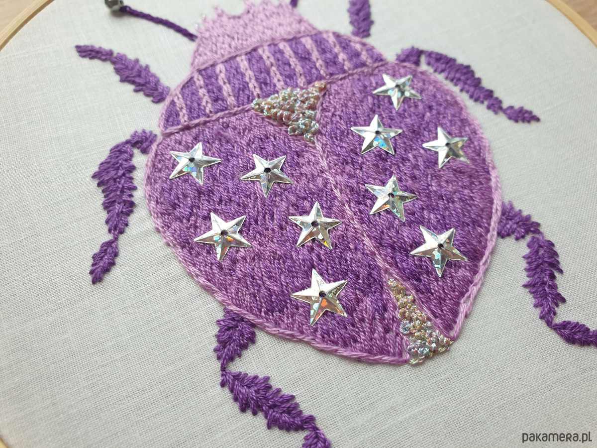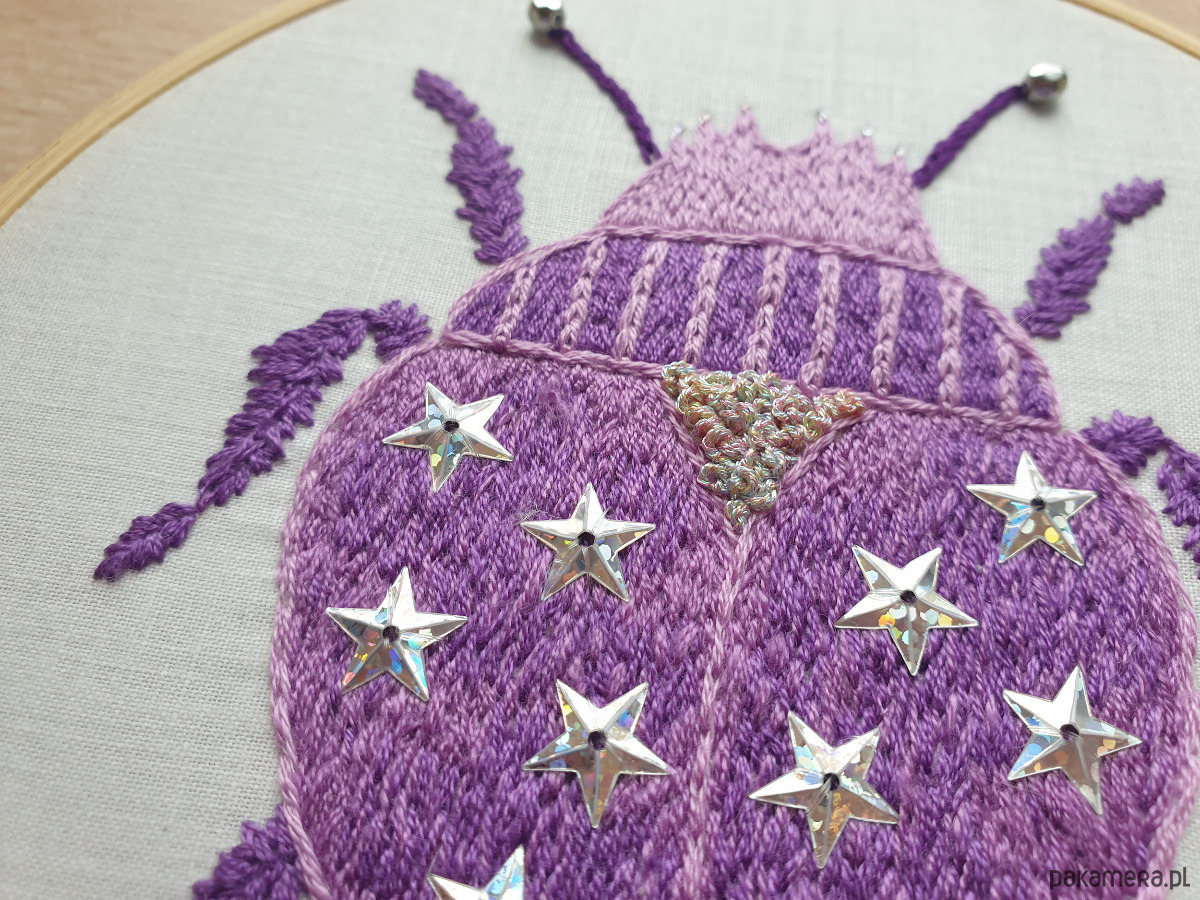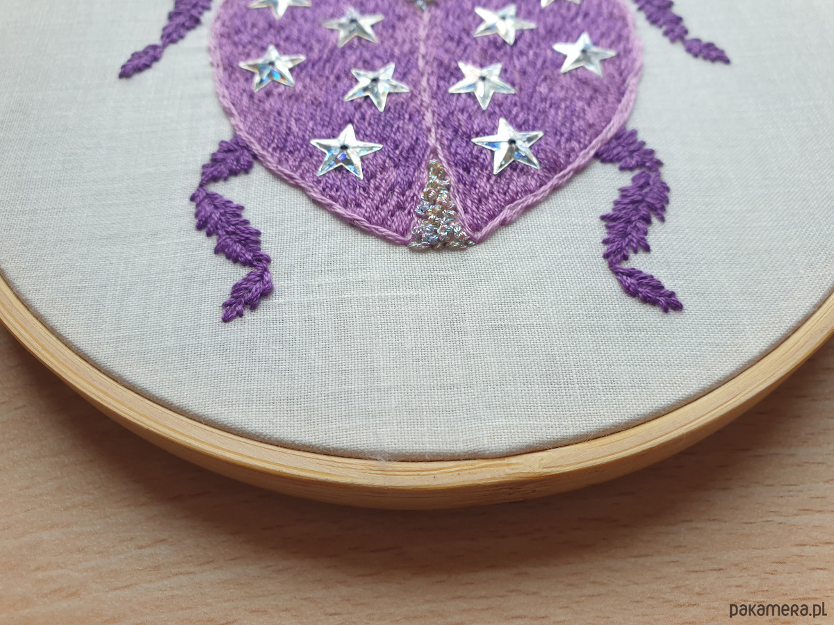 Ten wyjątkowy haft przedstawiający fioletowego chrząszcza ozdobionego gwiazdkami łączy w sobie naturę i nutę baśniowej tajemnicy. Każdy ścieg został wykonany ręcznie z dbałością o najmniejszy detal, tworząc harmonijną kompozycję pełną spokoju i subtelnego blasku.
