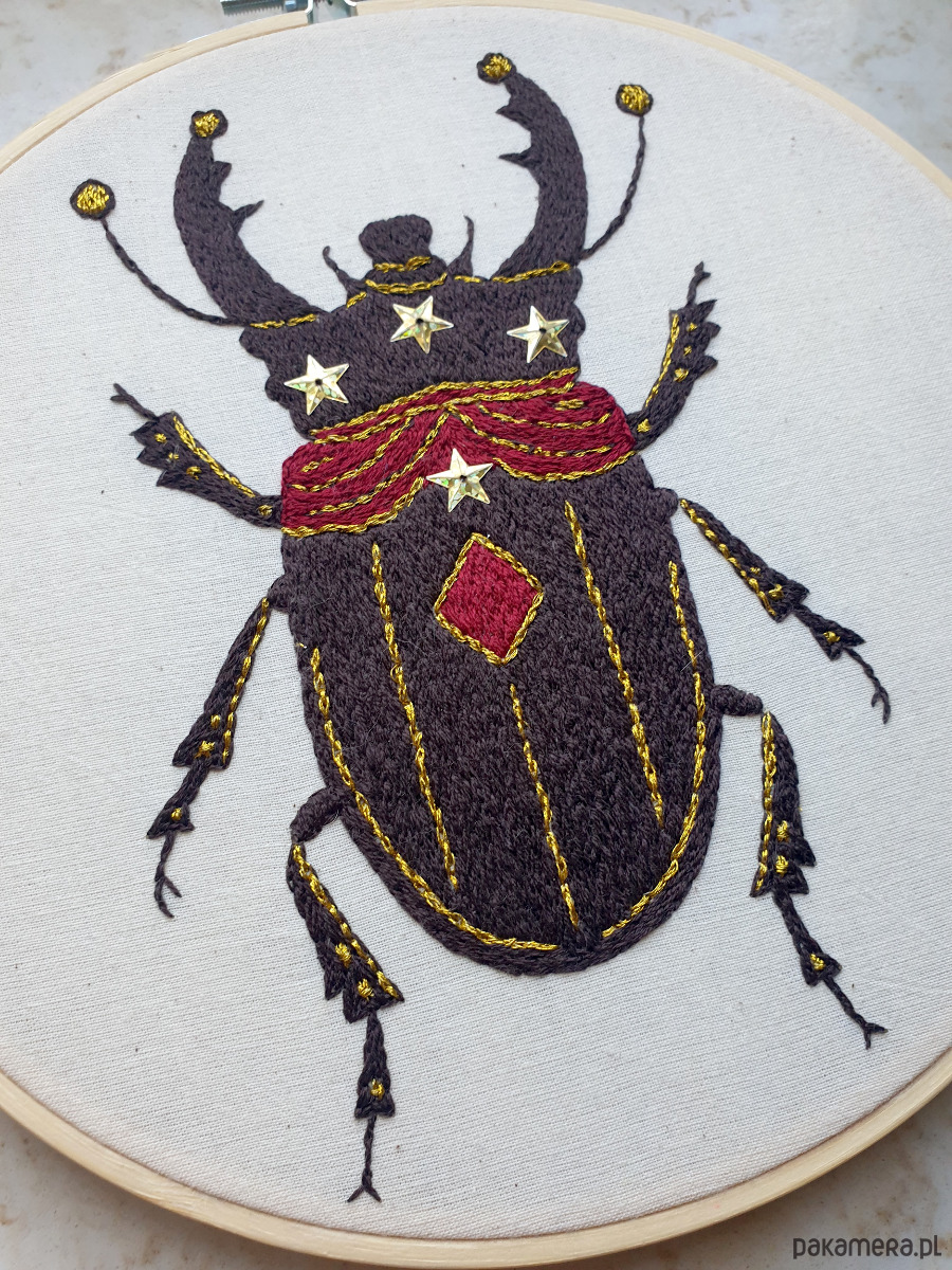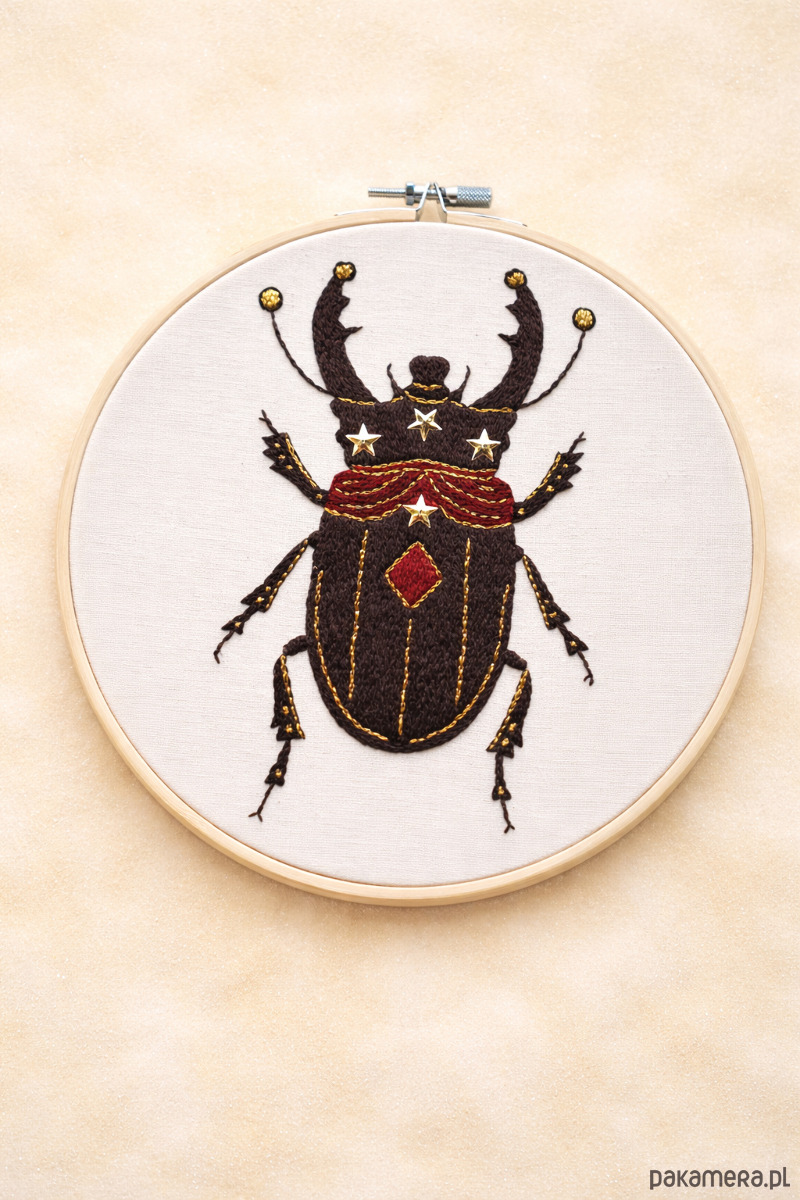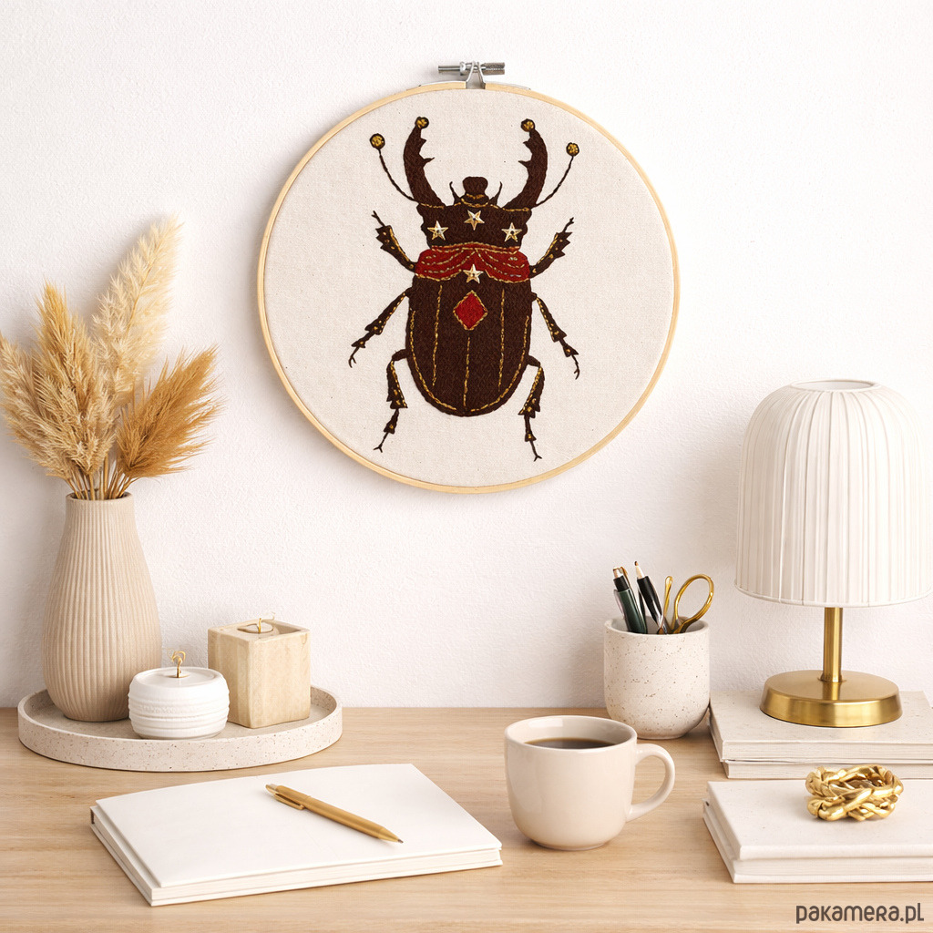 Ręcznie haftowany chrząszcz w cyrkowym, lekko teatralnym stylu to dekoracja, obok której trudno przejść obojętnie. Intensywne kolory, ornamenty i ilustracyjna forma naturalnie przyciągają wzrok i dodają wnętrzu charakteru.