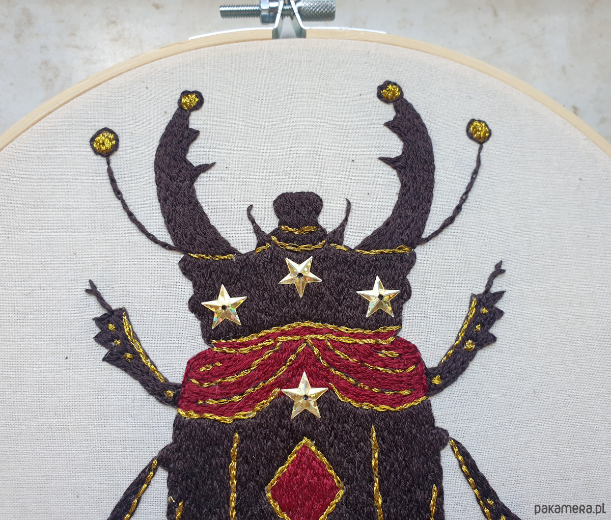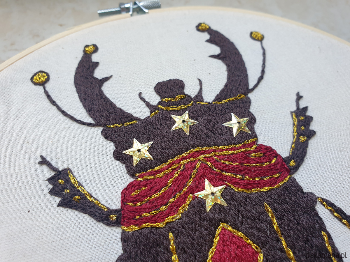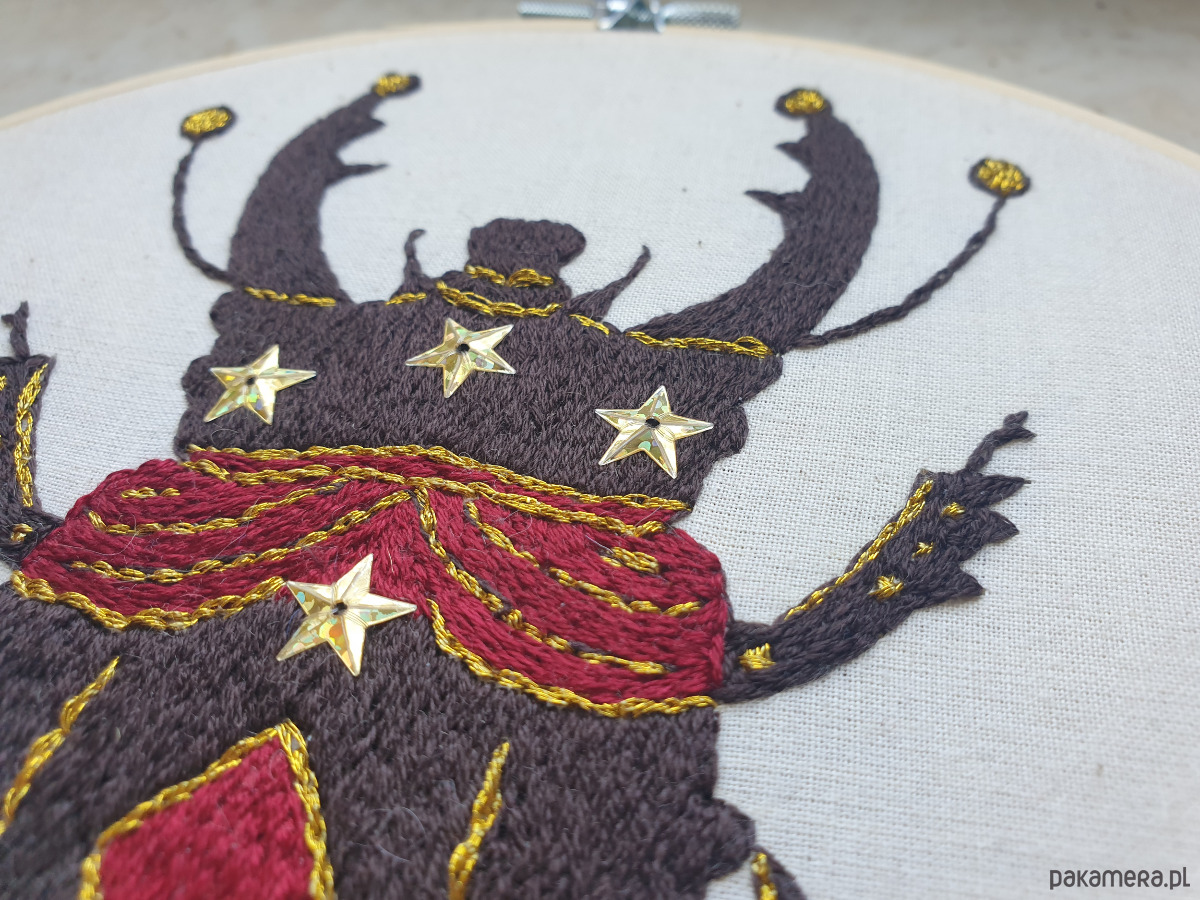 Ręcznie haftowany chrząszcz w cyrkowym, lekko teatralnym stylu to dekoracja, obok której trudno przejść obojętnie. Intensywne kolory, ornamenty i ilustracyjna forma naturalnie przyciągają wzrok i dodają wnętrzu charakteru.