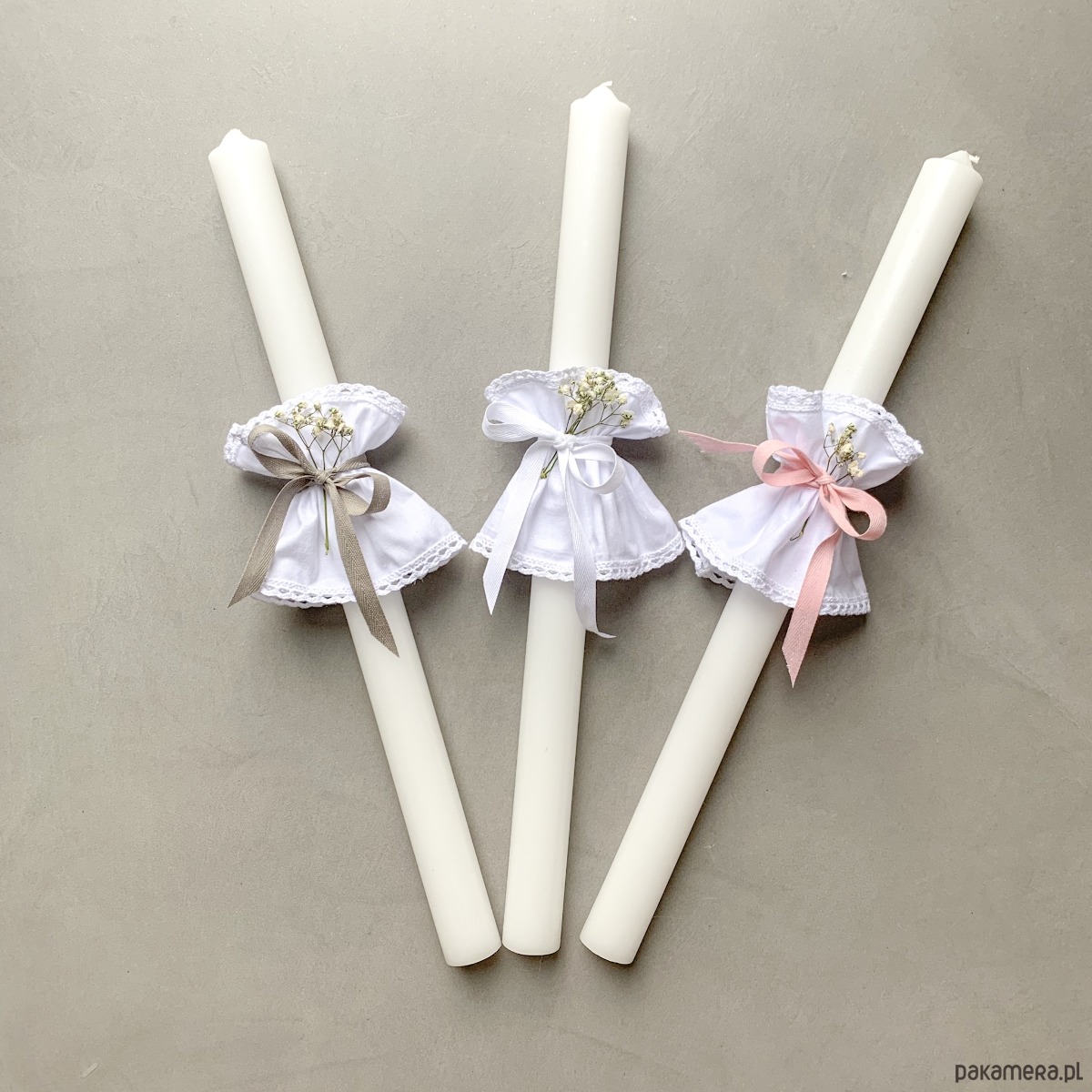 Biała gładka świeca przybrana jest uszytą z białej bawełny profitką, wykończoną bawełnianą koronką. Całość związana bawełnianą wstążeczką zakończoną kokardką.