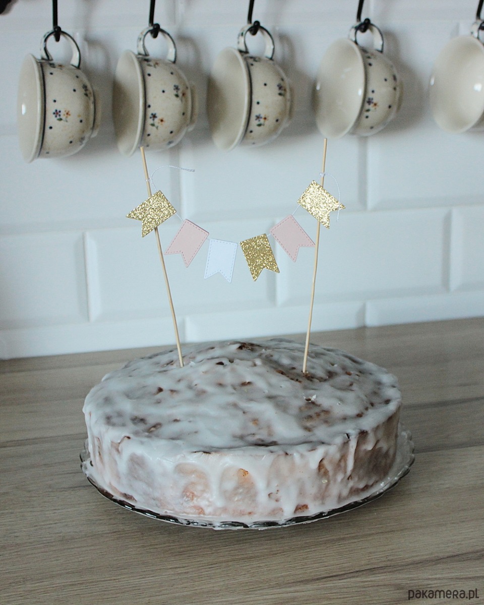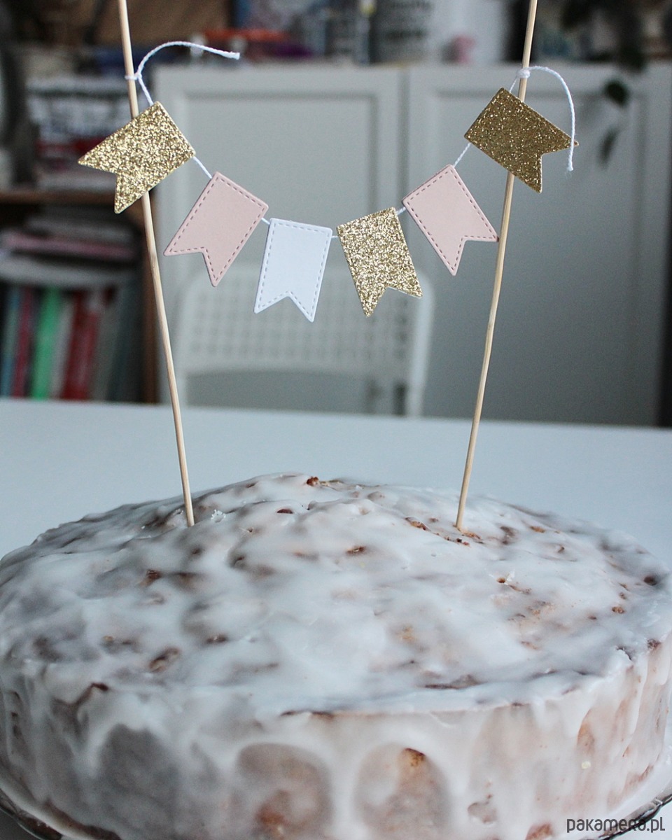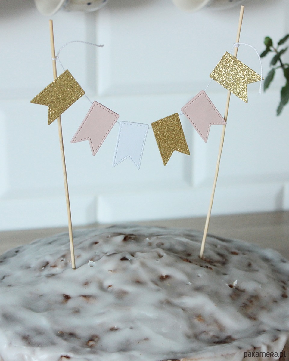 Topper na tort z biało-złoto-różowymi chorągiewkami. Idealny jako ozdoba do ciasta na każdą okazję.