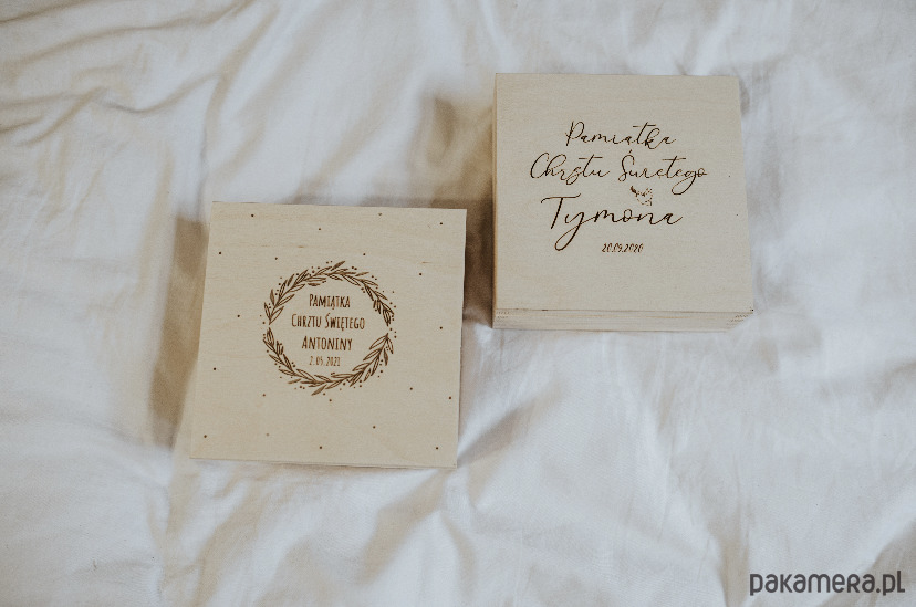 Grawerowane pudełko dostępne jest w 2 wariantach graficznych. Prosimy o wybór wariantu (kropeczki lub gołąb) w uwagach do zamówienia wraz z imieniem dziecka oraz datą uroczystości.