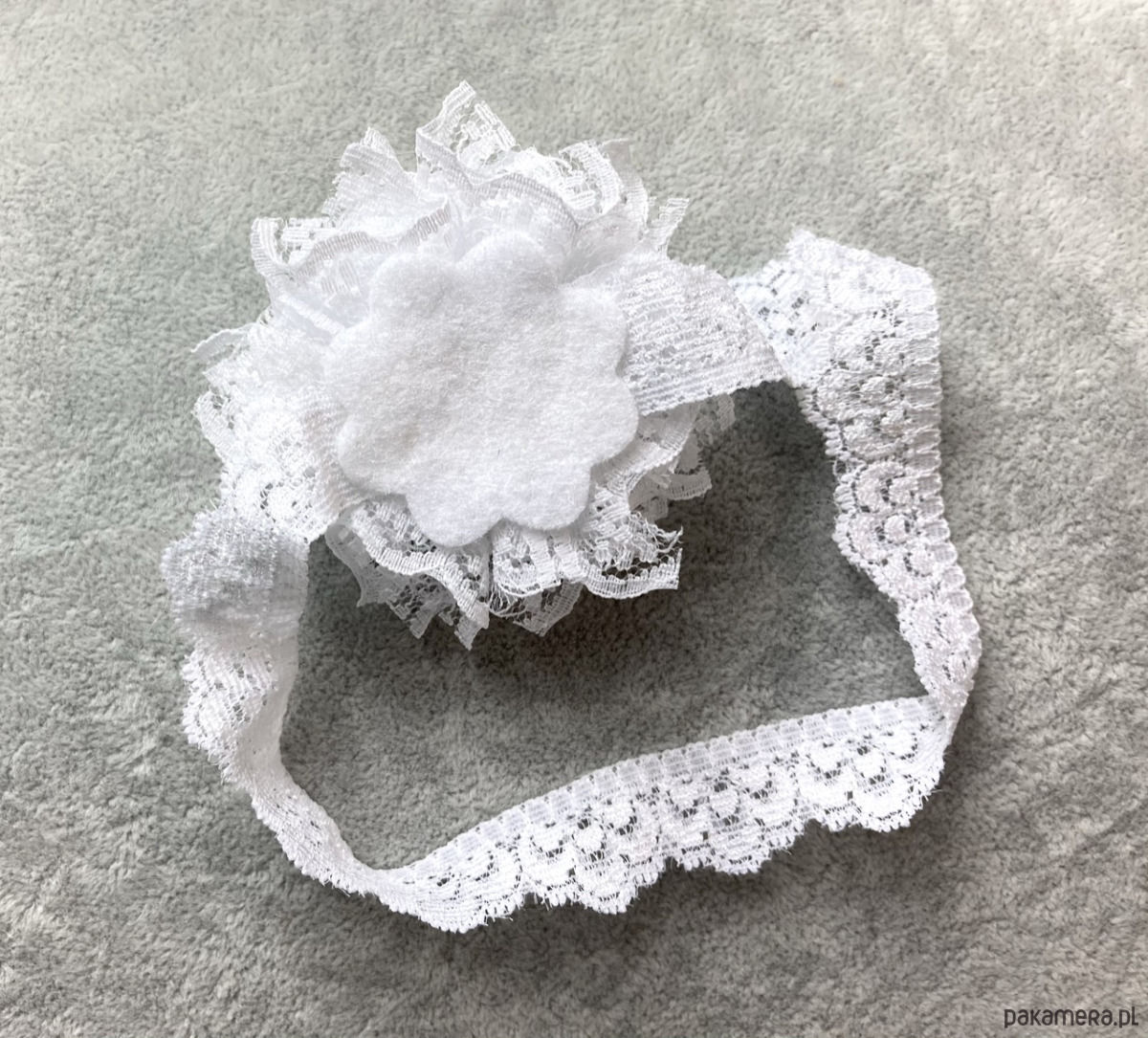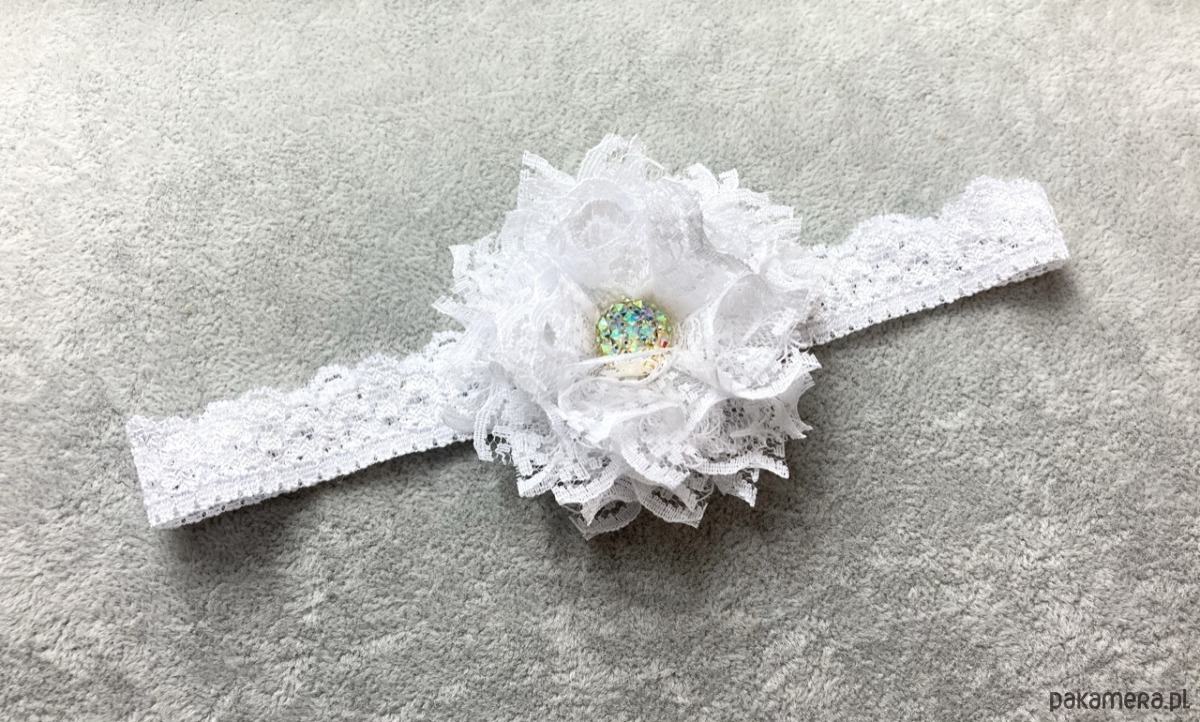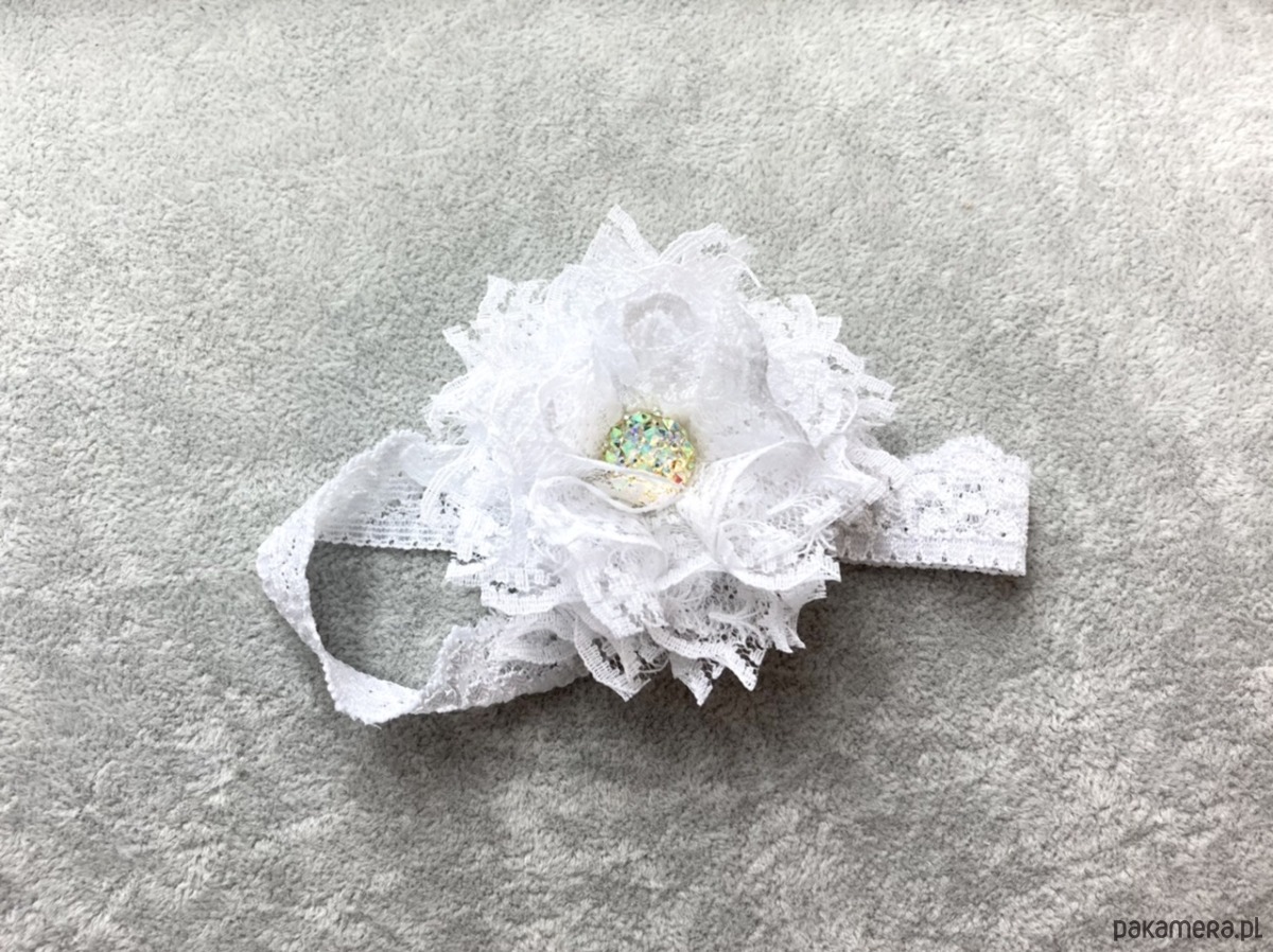 Opaska na włosy dla dziewczynki, koloru białego z piękną elastyczną koronkową gumeczką w kolorze białym, na obwód główki od 30-40 cm. Od spodu kwiatek i gumeczka podklejony delikatnym filcem.
