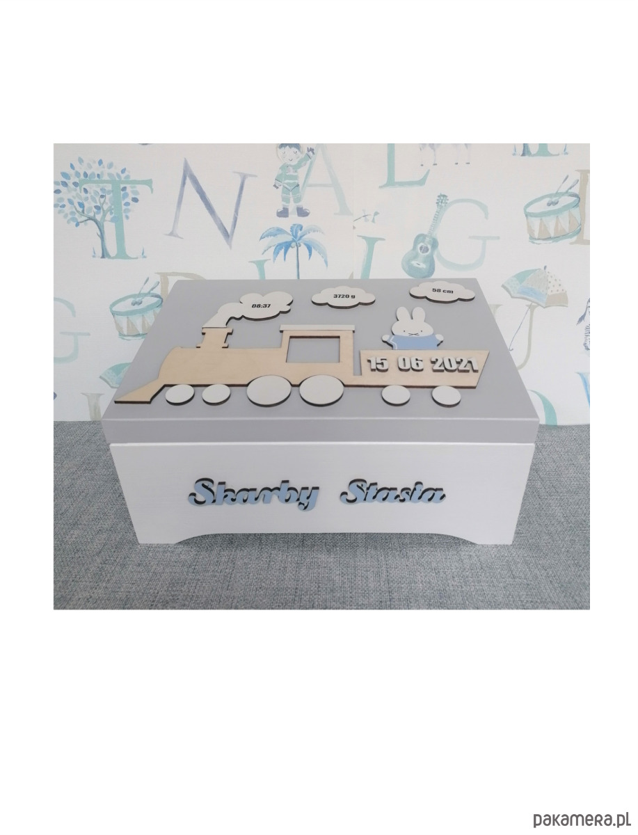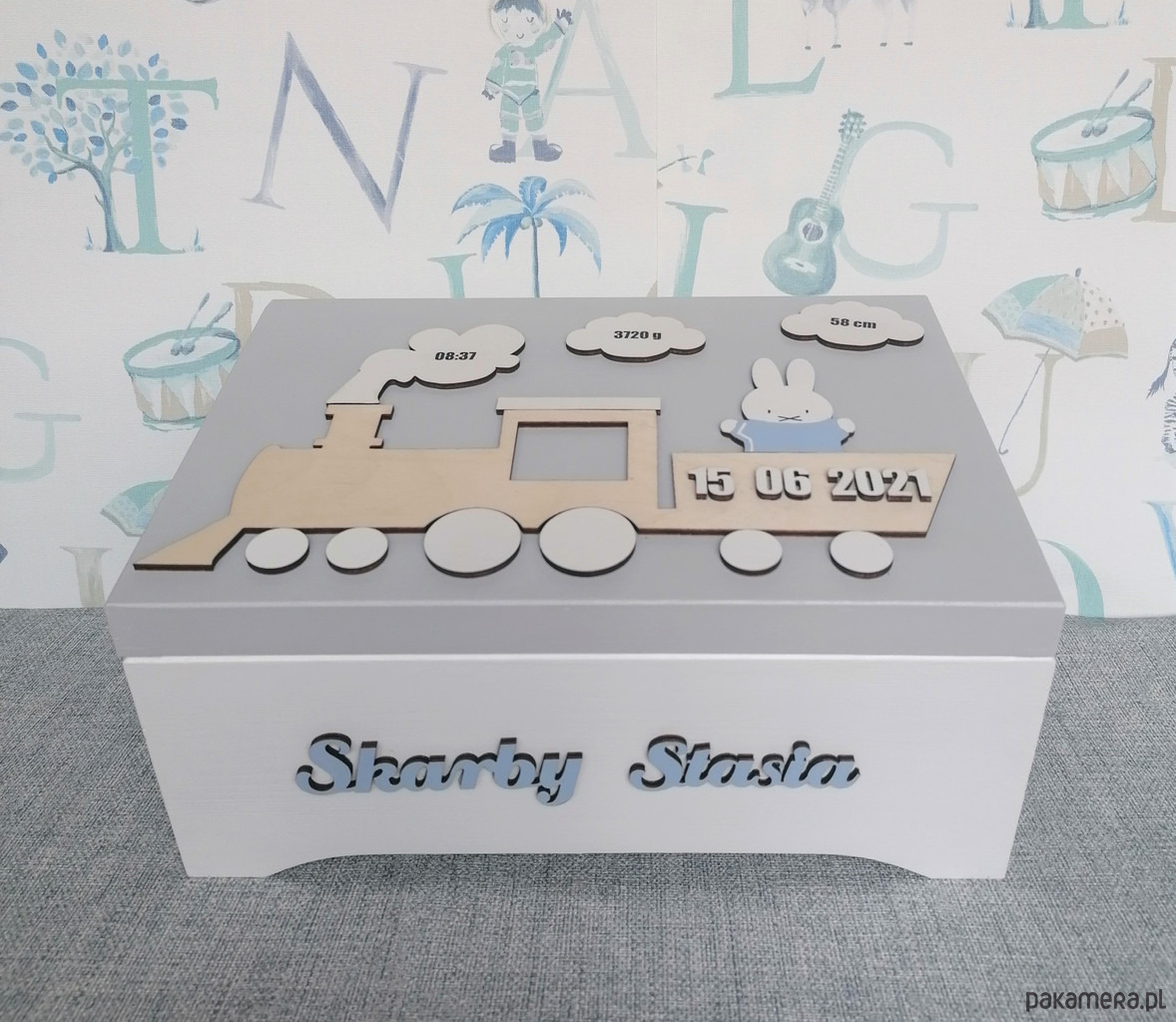 Na wieczku pudełka, które zostało pomalowane na jasno szary kolor znajduje się pociąg oraz metryczka z podstawowymi danymi dziecka, które umieszczone zostały na białych chmurach.