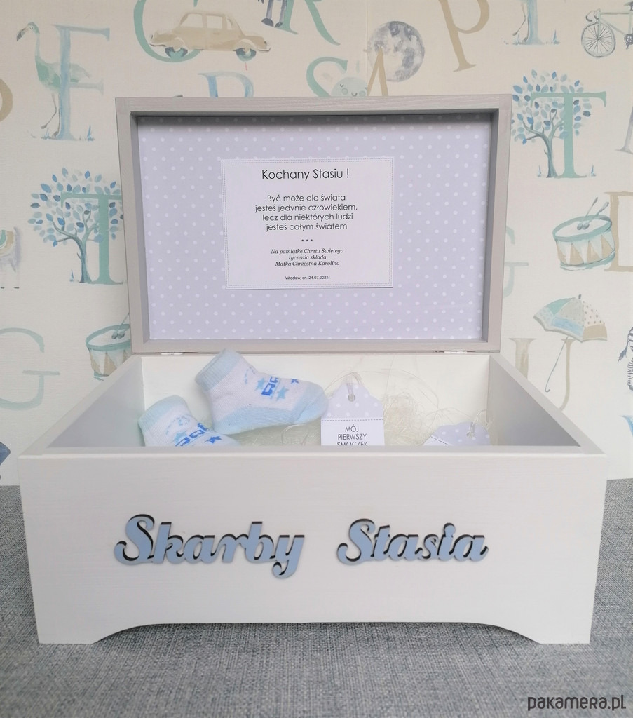 Ściany pudełka są w kolorze białym i widniej na nich napis Skarby Stasia. Oczywiście w tym miejscu wpiszemy skazane przez ciebie przy zamawianiu imię.