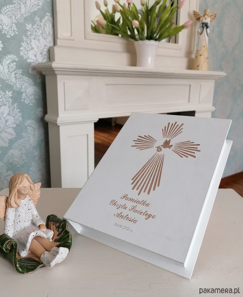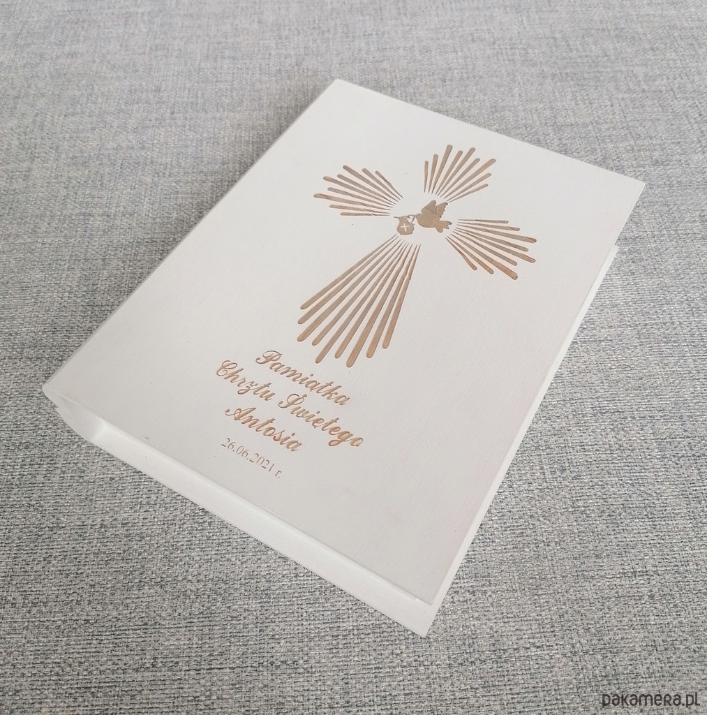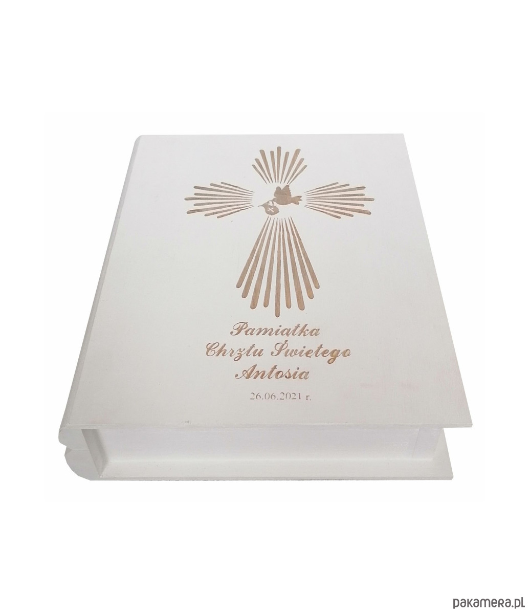 Pudełko w całości pomalowane zostało na biały kolor a jego elementem dekoracyjnym jest grawer przestawiający Krzyż oraz napis Pamiątka Chrztu Świętego.