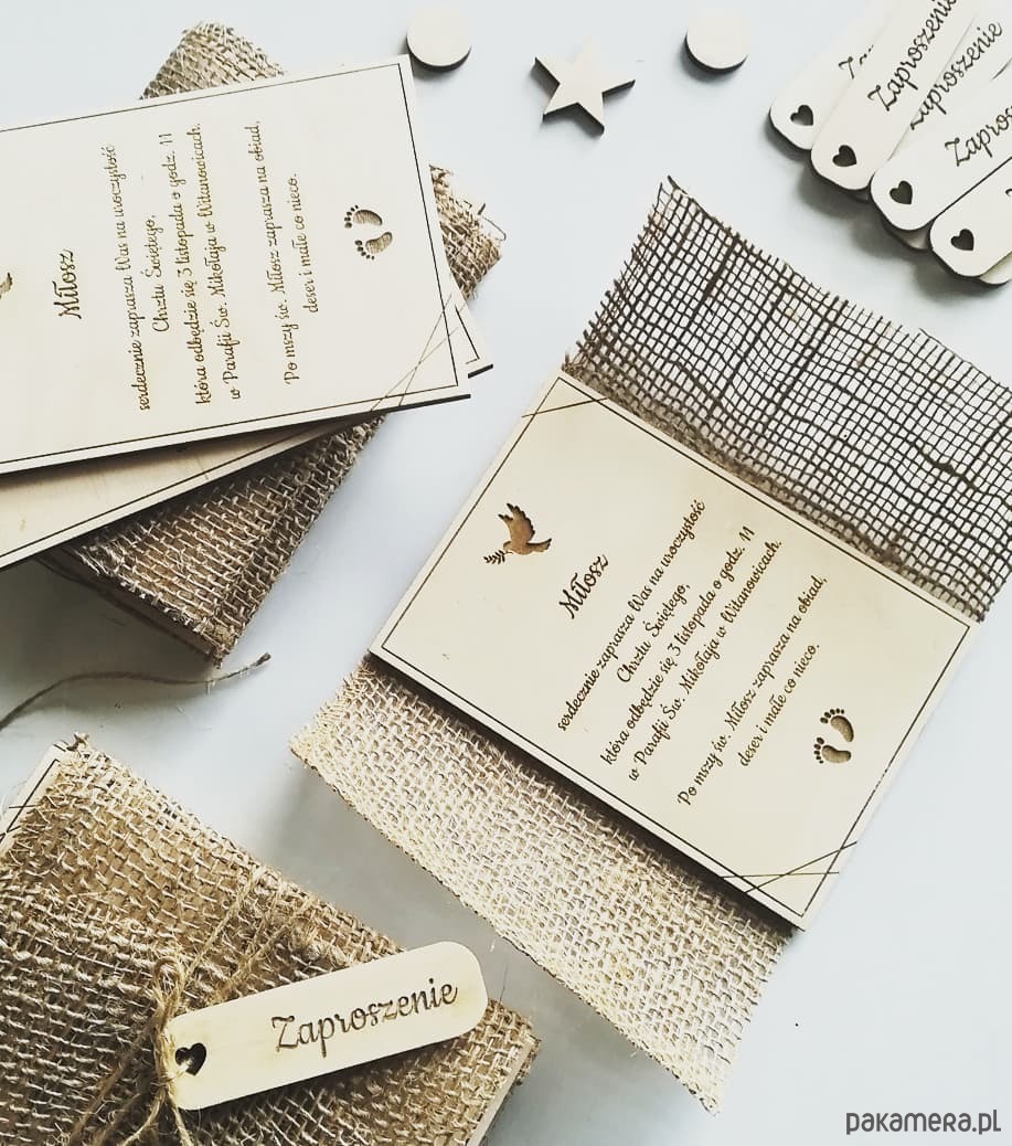 Zaproszenie ma wymiar 10x15 cm, wykonane z jasnej sklejki gr 3 mm.