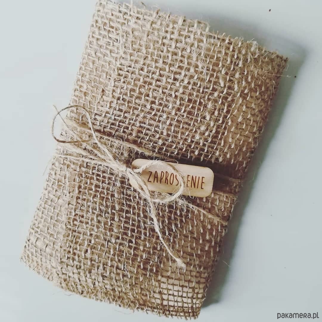 Wyjątkowe drewniane zaproszenie owinięte jutą i sznurkiem wraz z zawieszką z napisem ZAPROSZENIE.