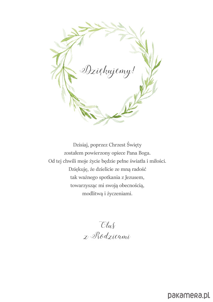 Wyjątkowe podziękowanie na chrzest z delikatnym motywem wieńca laurowego. Akwarelowa ilustracja w połączeniu z pięknym, drzewnym papierem z wyczuciem targanym na brzegach niczym papier czerpany, doskonale podkreśli ważne wydarzenie z życia rodziny.