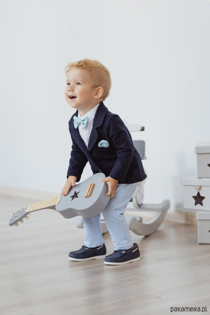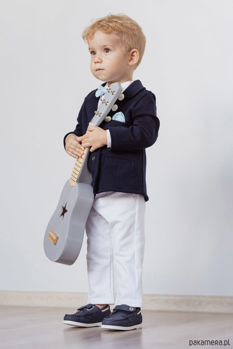 Marynarka wykonana została z dzianiny przyjemnej w dotyku, lekko się rozciąga co daje duży komfort podczas jej noszenia. Taliowana przez co bardzo dobrze się układa. Marynarka ma pasujące do całości dodatki w postaci poszetki i muszki dodające stylu i unikatowości. Marynarka w kolorze granatowym z niebieskimi dodatki to idealna kompozycja na chrzest.