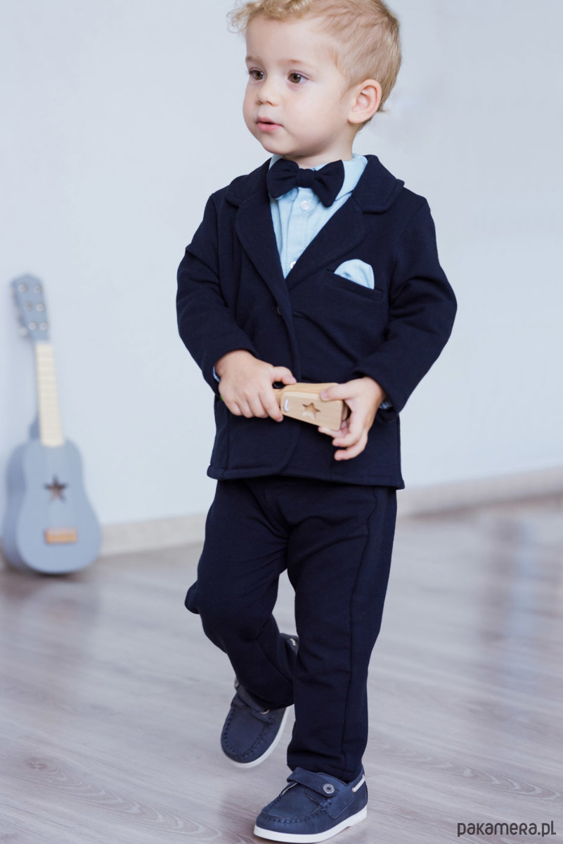Garnitur składa się z marynarki, spodni, koszuli body i muszki.