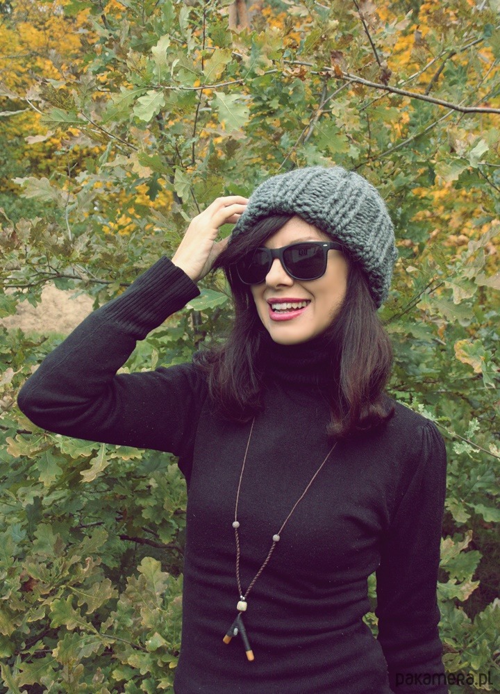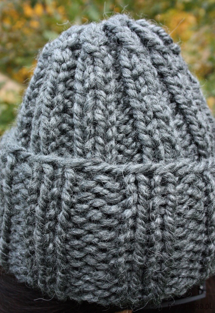Ręcznie wykonana gruba, mięsista czapka w kolorze szarym.