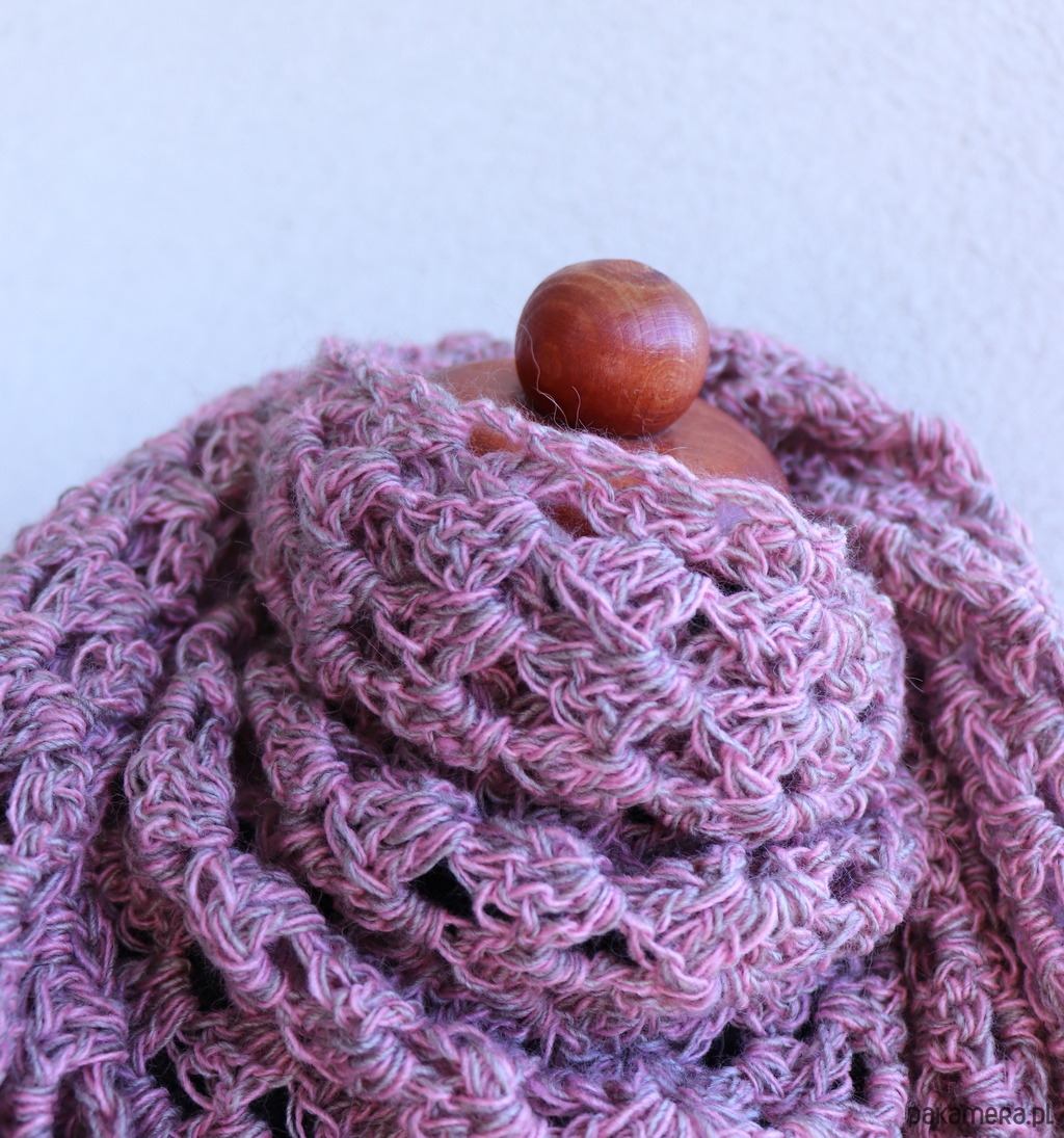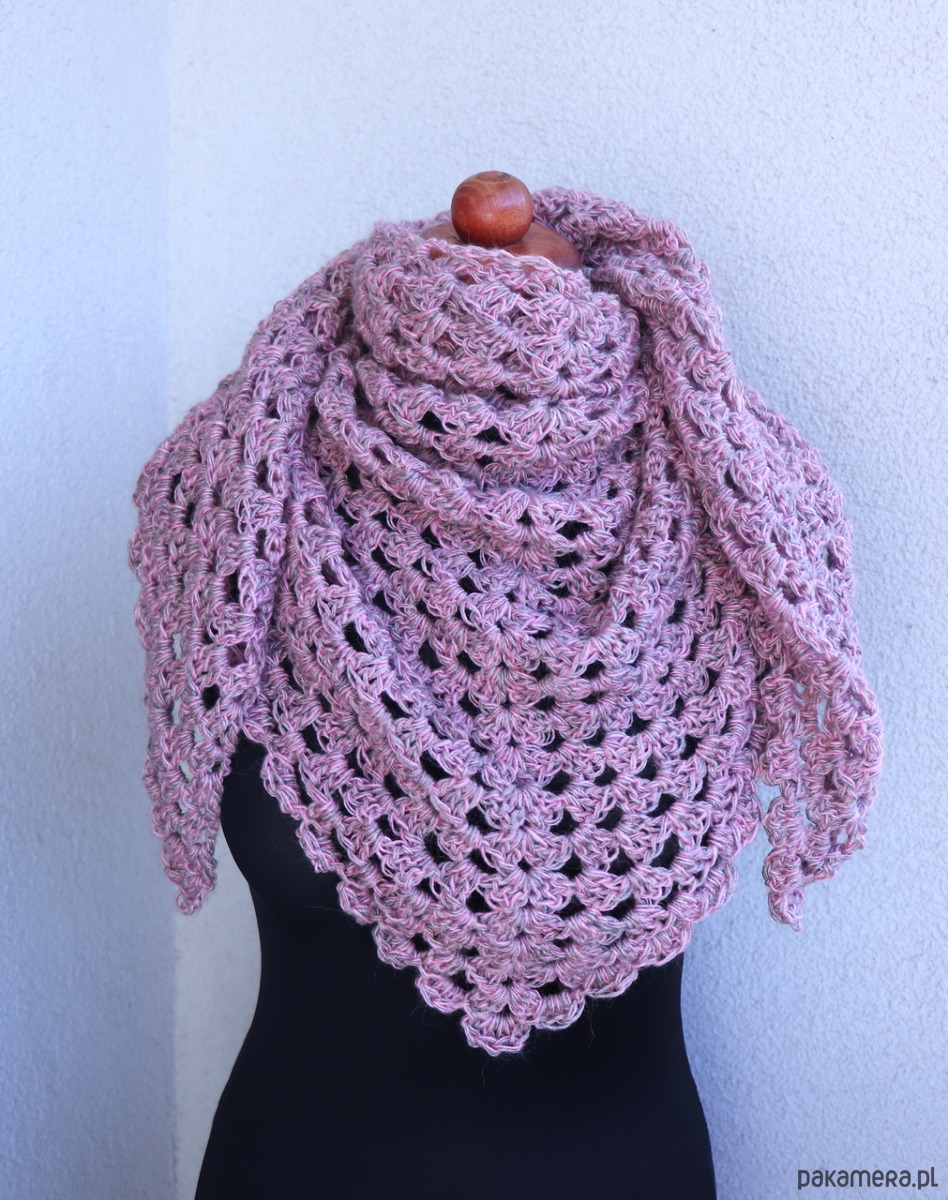 Chusta - apaszka zrobiona na szydełku z cieniutkiej akrylowej włóczki w kolorze beżowym i jasnoróżowym.