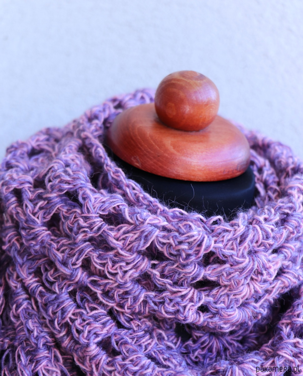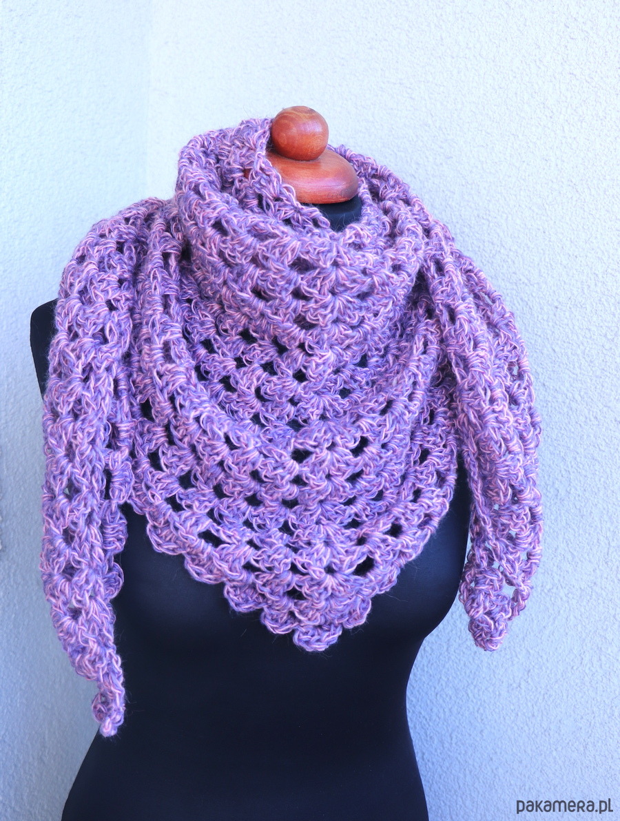 Chusta - apaszka zrobiona na szydełku z cieniutkiej akrylowej włóczki w kolorze jasnofioletowym i jasnoróżowym.