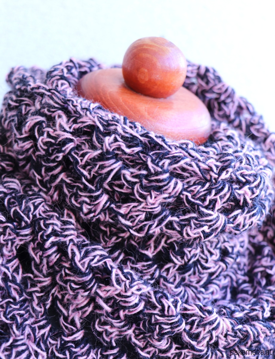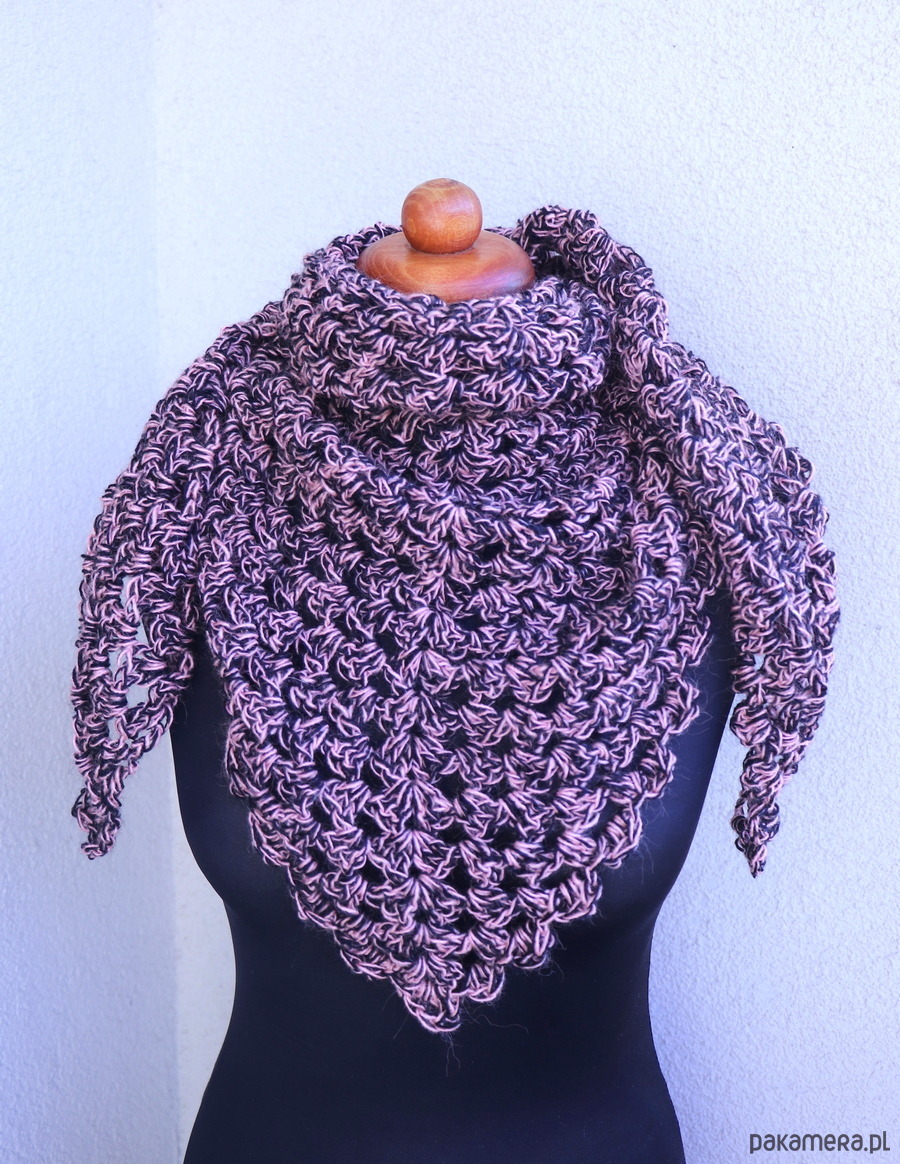 Chusta - apaszka zrobiona na szydełku z cieniutkiej akrylowej włóczki w kolorze czarnym i jasnoróżowym.