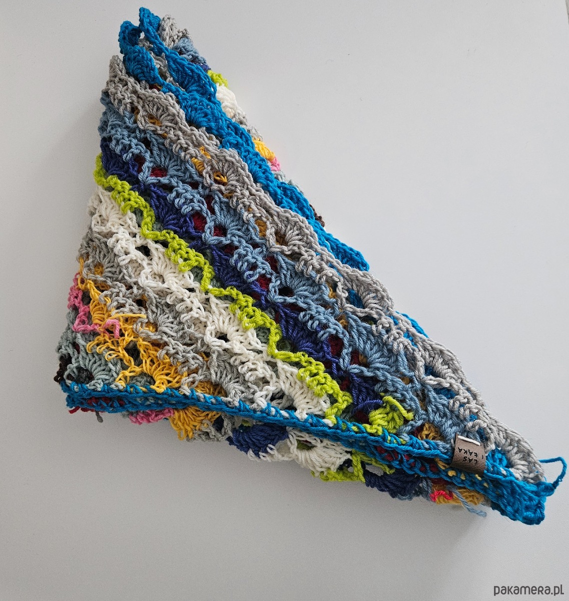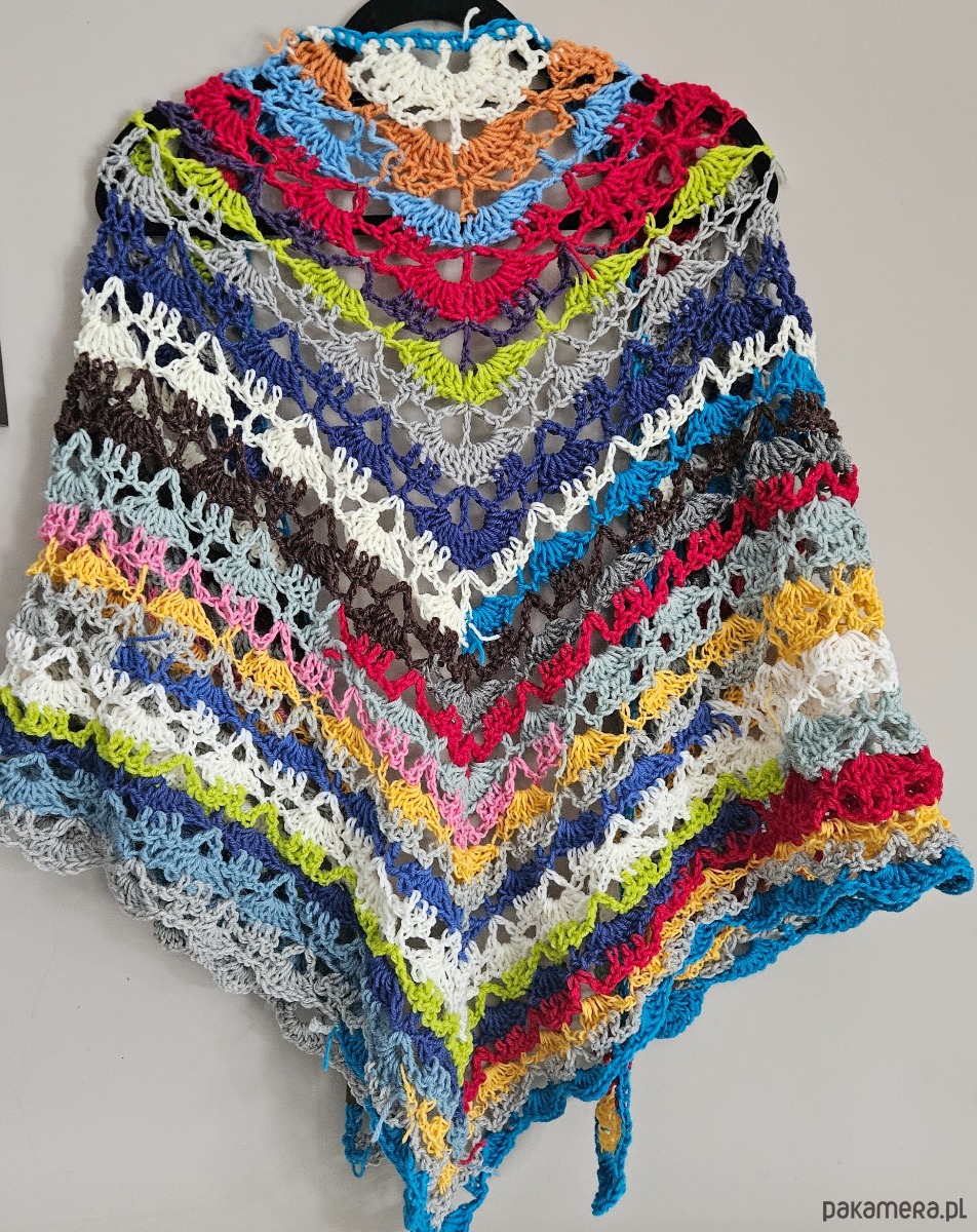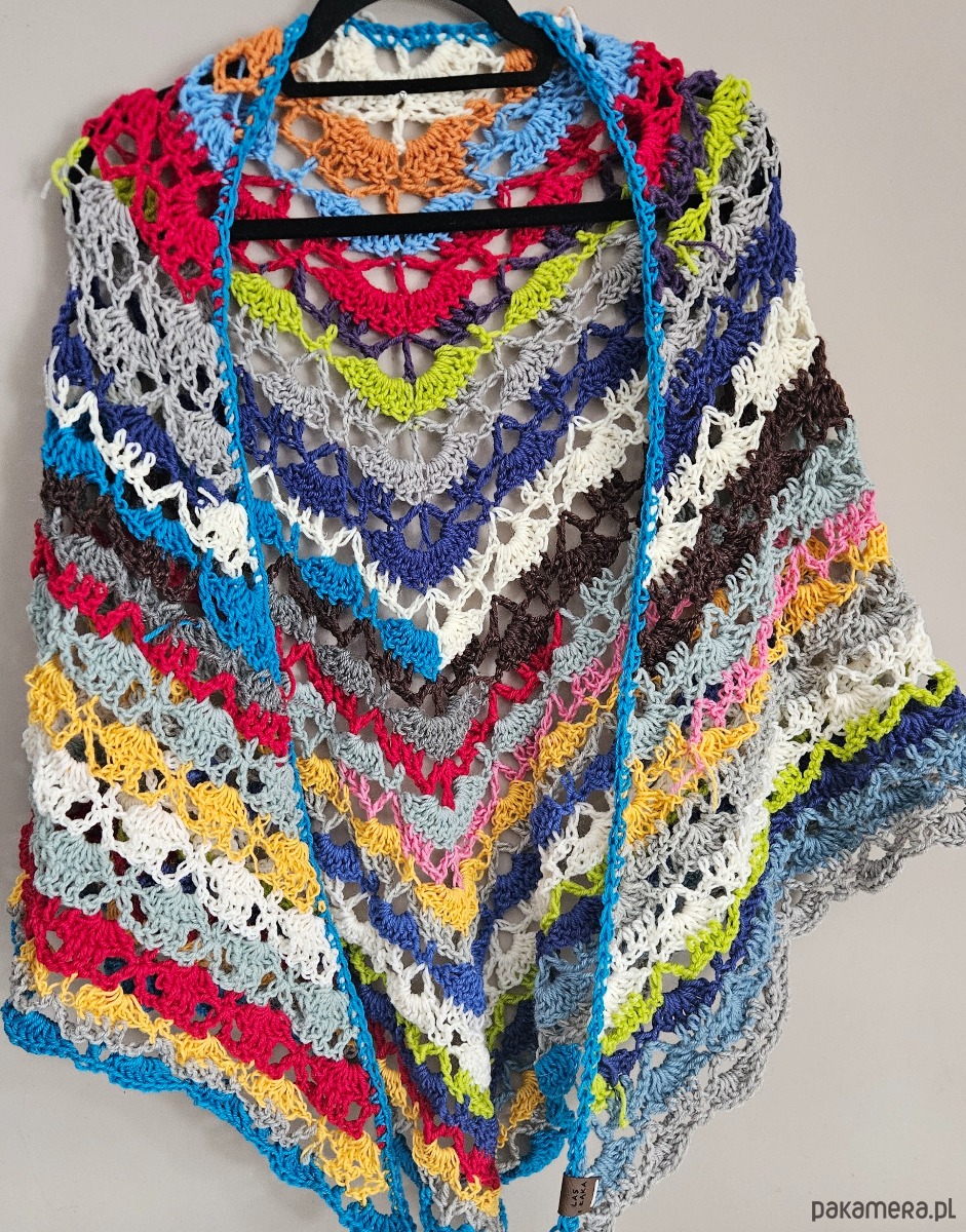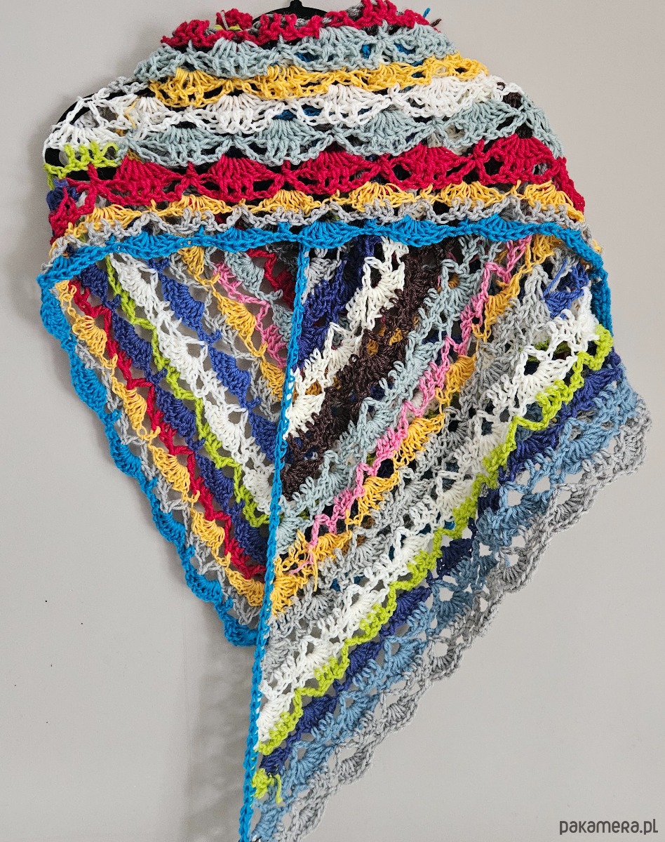Trójkątny fason pięknie układa się na ramionach, plecach lub jako otulający szal. Ażurowe wzory przeplatają się z wyrazistymi pasami kolorów – od energetycznych różów i turkusów, przez limonkę i błękit, po stonowane szarości i krem. Każdy rząd to inny rytm, inna faktura, inna historia.