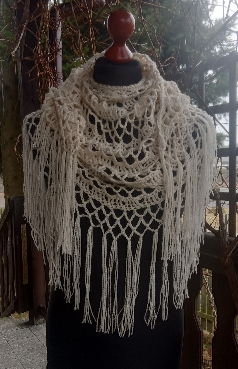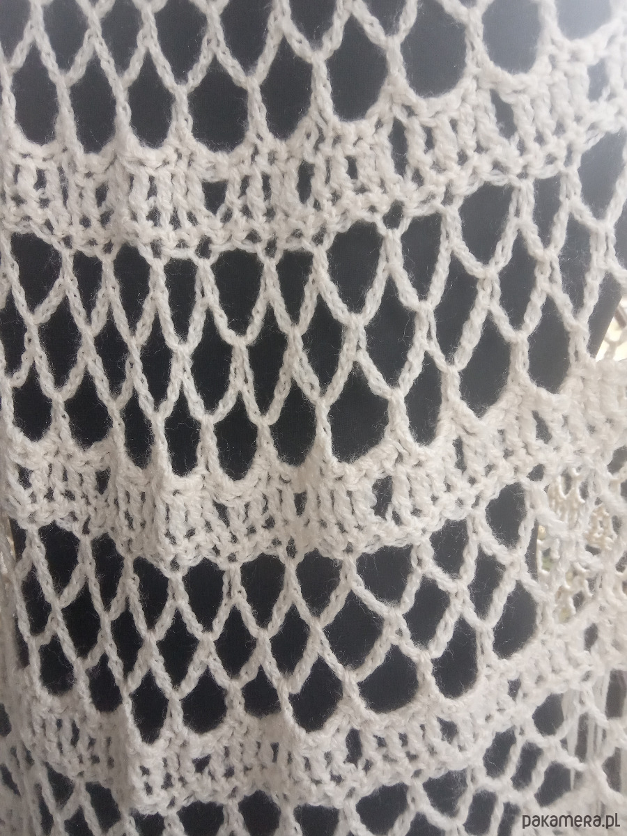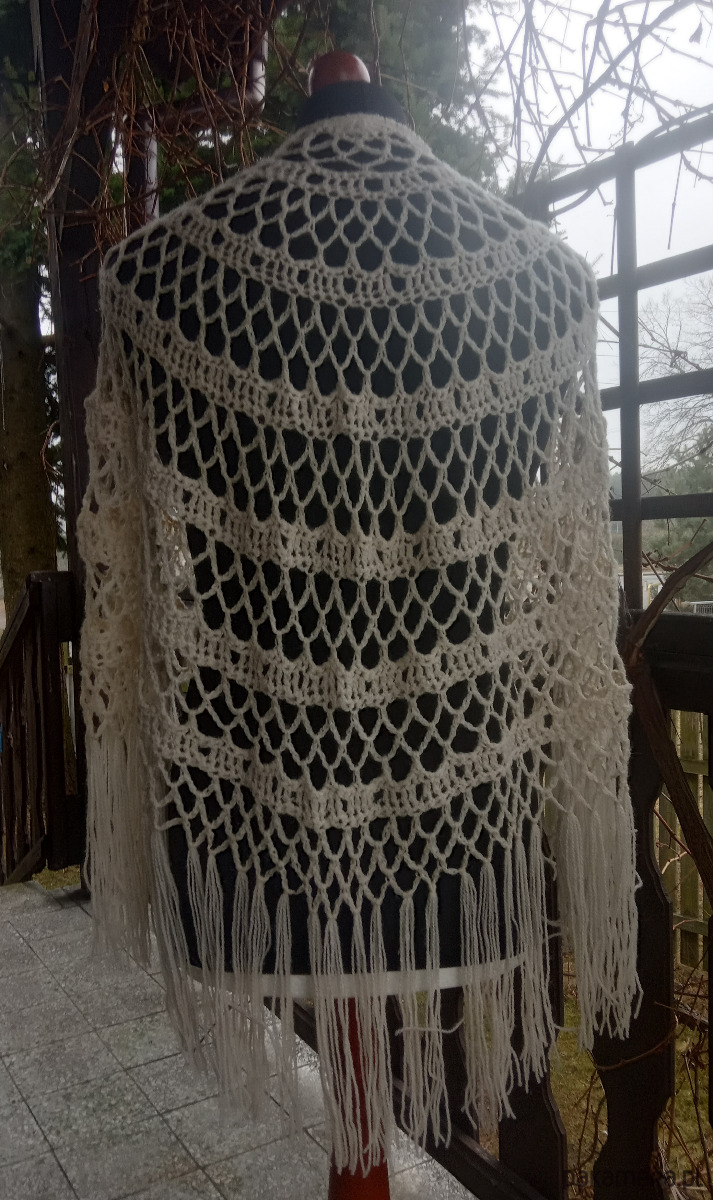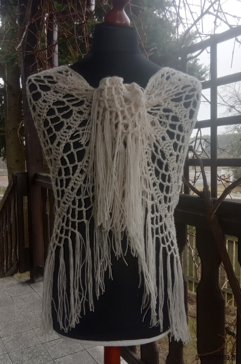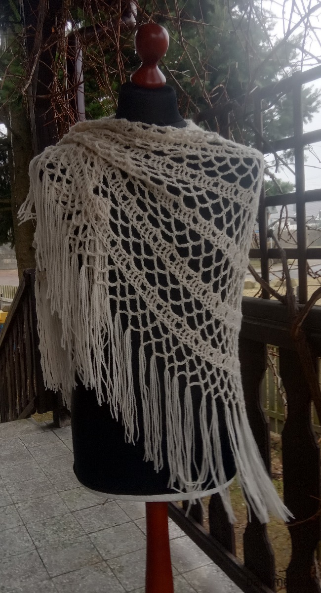Chusta wykonana w całości ręcznie z wysokogatunkowej włóczki akrylowej z delikatnym połyskiem. Wykonana w kształcie półkola pięknym koronkowym wzorem, zakończona dekoracyjnymi frędzlami.