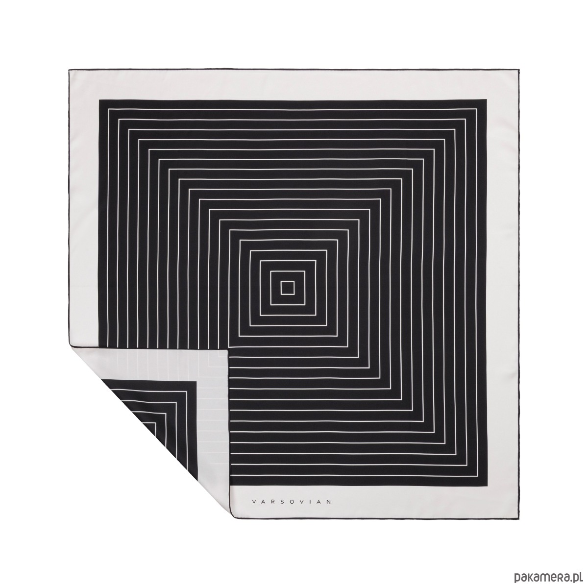 Ta apaszka to subtelna interpretacja op-artu – spokojniejsza, bardziej kontemplacyjna niż efektowna. Rytmiczne, koncentryczne linie prowadzą wzrok do środka, a jednocześnie sprawiają wrażenie, jakby kompozycja delikatnie się unosiła. To gra percepcji: czy patrzymy w głąb, czy w górę?