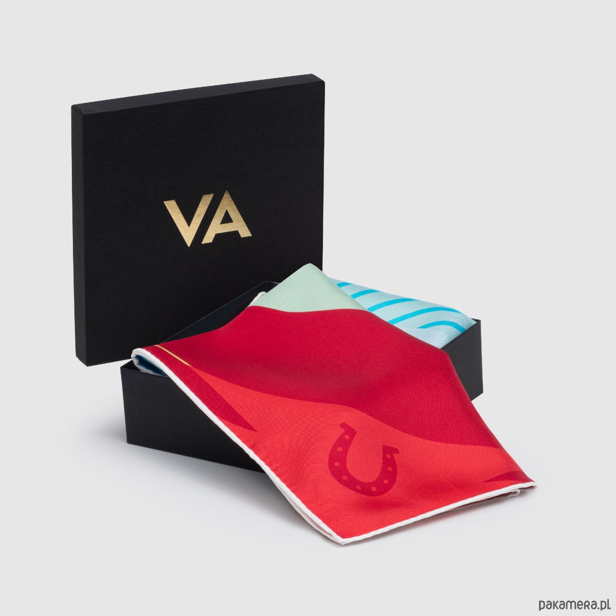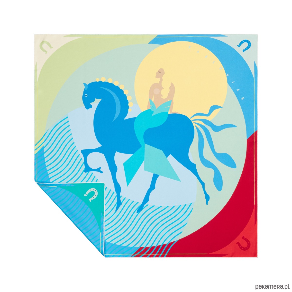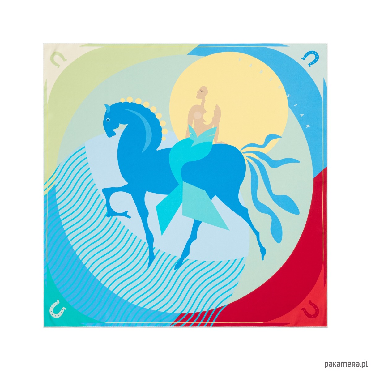 Chusta jedwabna Syrenka Warszawska na koniu Elie, ręcznie rolowana, dwustronna