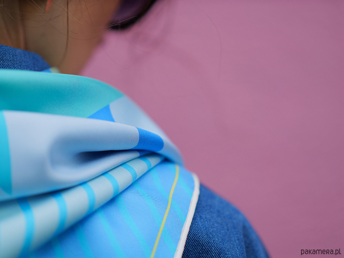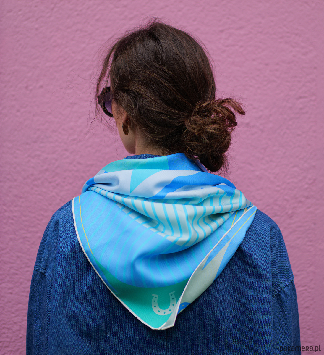 Dwustronna jedwabna chusta „Piscina a Palazzo” (90x90 cm), ręcznie rolowana, inspirowana włoskim stylem życia. Motywy turkusowych rombów, harmonijnie przeplatające się ze złotymi i beżowymi akcentami, oddają ducha ciepłego włoskiego lata. Turkus symbolizuje spokojne, błękitne morze, którego widok koi zmysły, podczas gdy złote elementy przywodzą na myśl bogactwo słońca i przepych renesansowych pałaców. Beżowe akcenty wprowadzają subtelną elegancję, kojarząc się z ciepłym piaskiem w promieniach zachodzącego słońca.