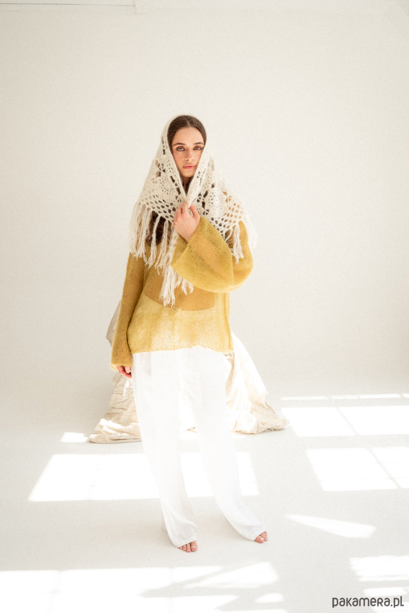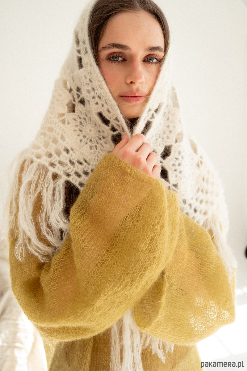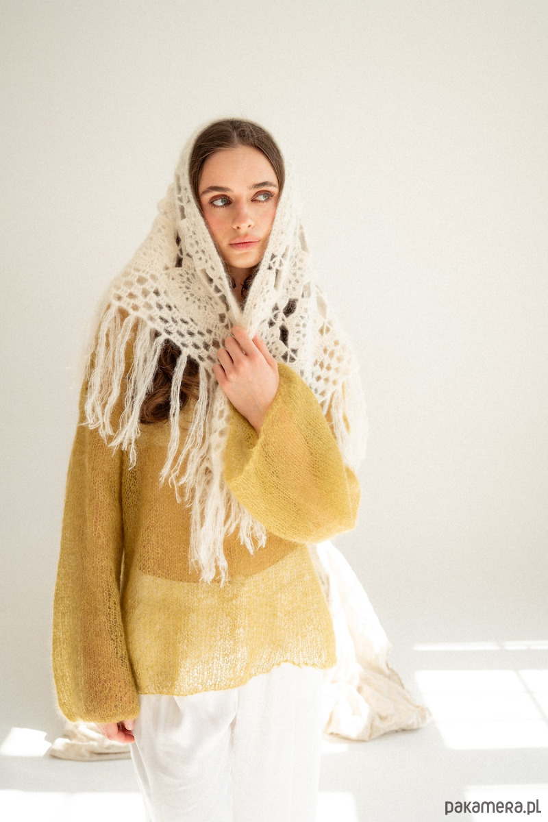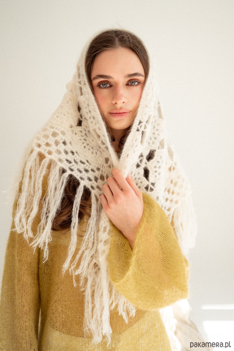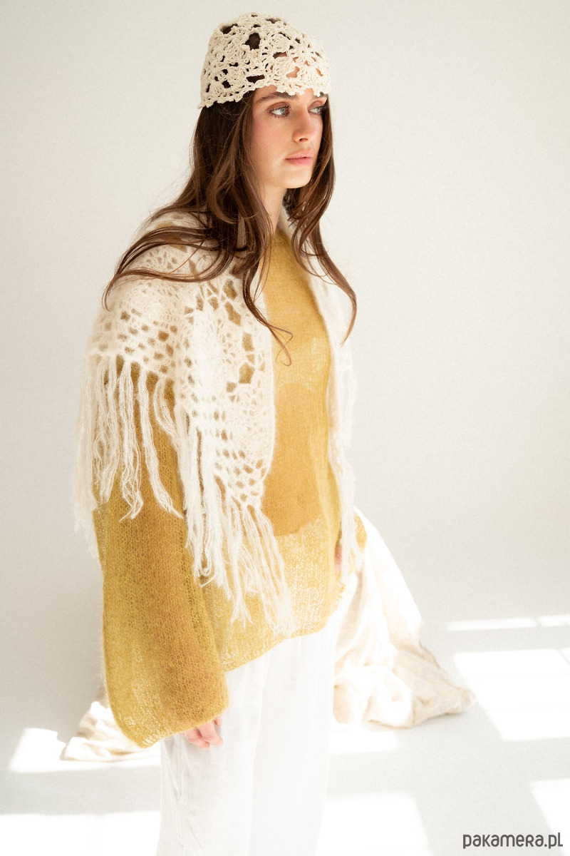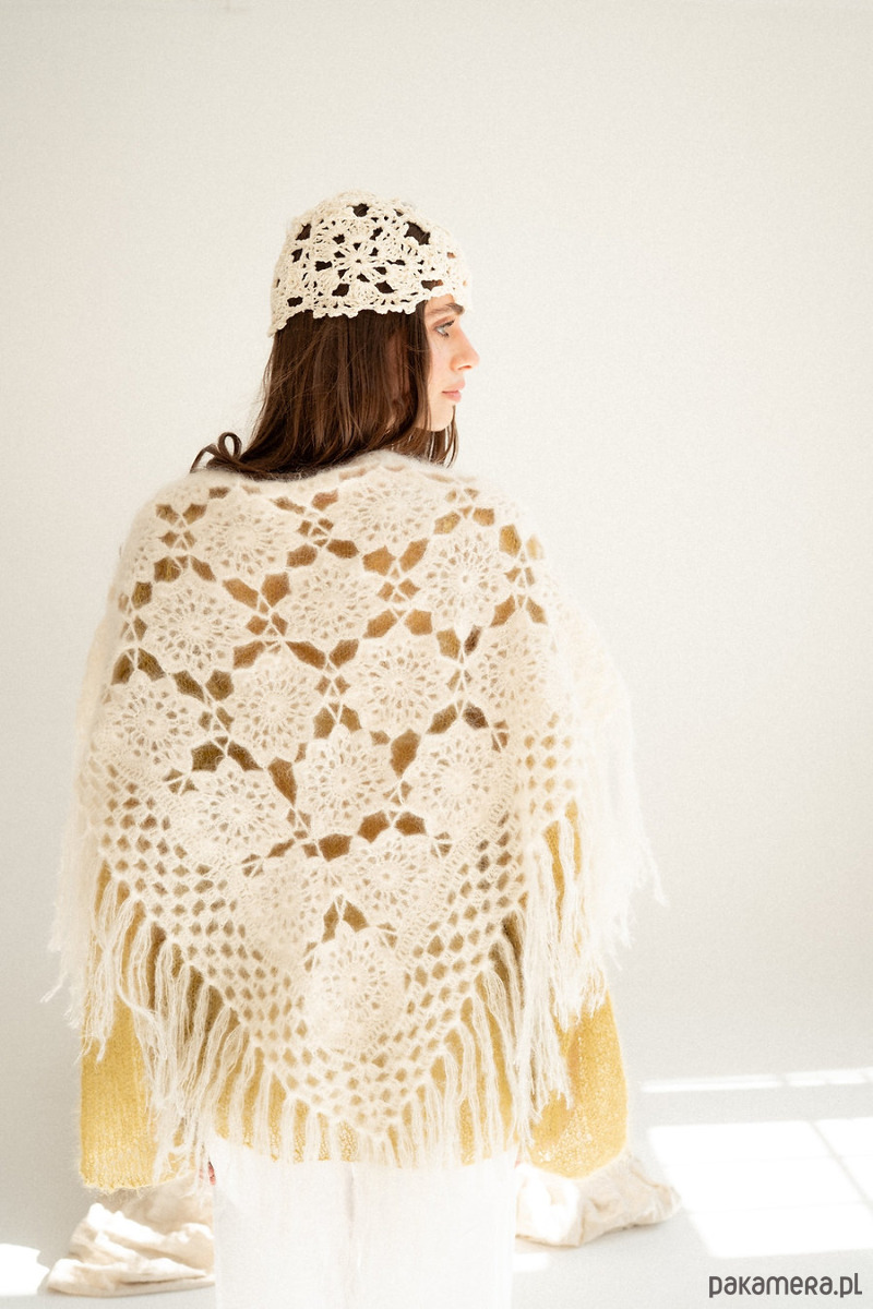 Ręcznie szydełkowana chusta z moheru i jedwabiu w przepięknym wzorze. Chuste tą można nosić na głowie na kilka sposobów, można ją również przewiązać na spodniach, narzucić na ramiona na sweter, kurtkę, marynarkę czy letnią sukienka bądź wykorzystać jako szal pod szyje. Jeden produkt a cała masa zastosowań. Chusta wykończona jest frędzlami które dodają jej stylu i modowego vibe'u.