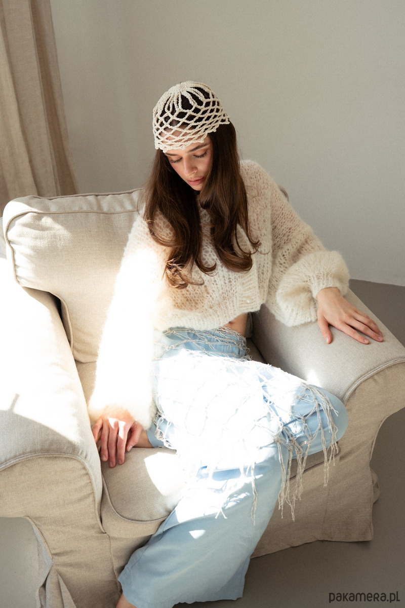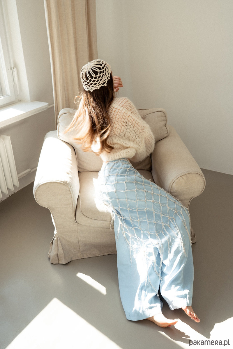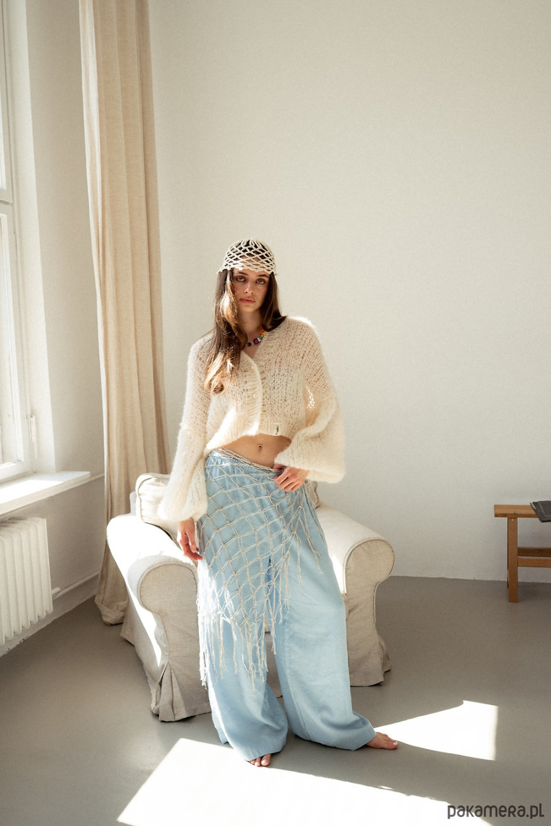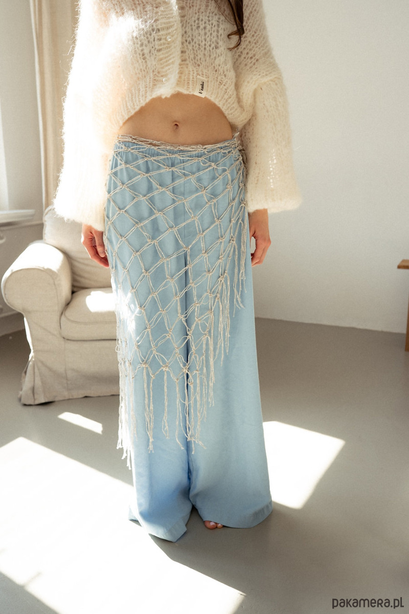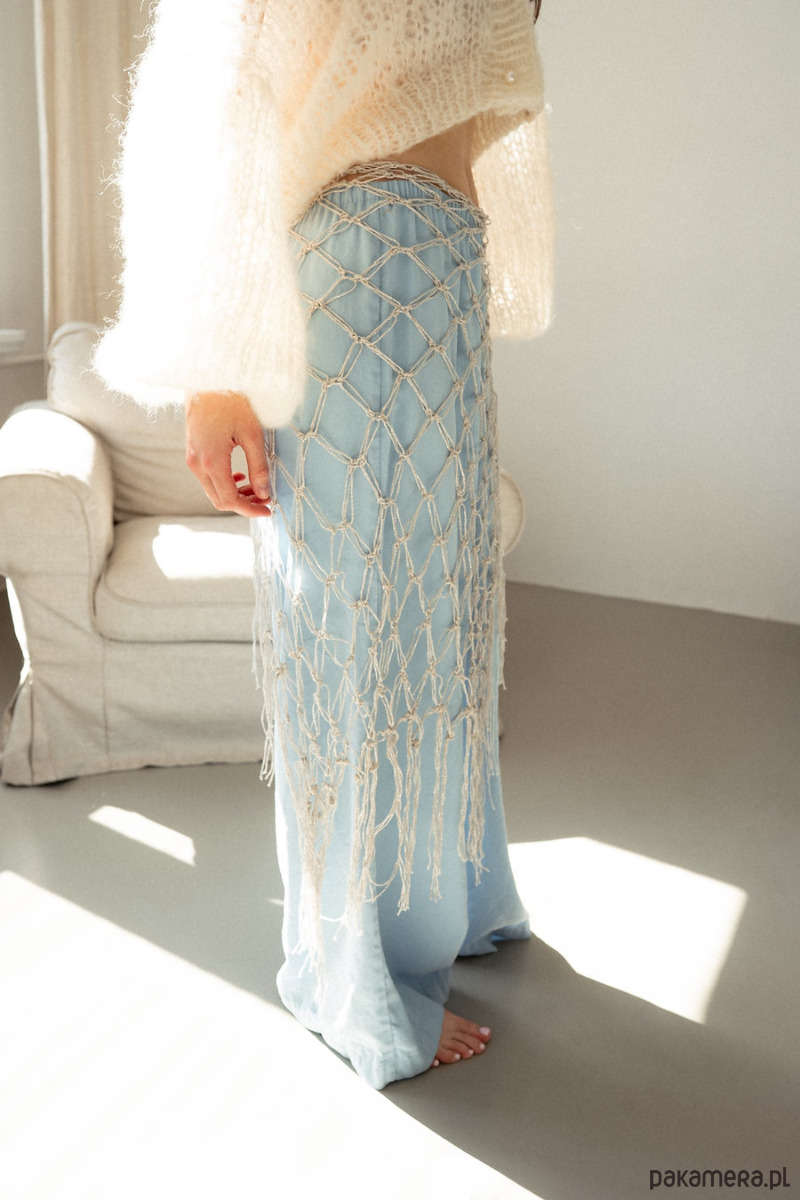 Ręcznie szydełkowana chusta w piękny siateczkowy wzór wykończona frędzlami. Chusta wykonana została z mieniącej się srebrzystej bawełnianej nitki. Możesz nosić ją na kilka sposobów, przewiąż na spodniach, narzucić na ramiona na sweter, kurtkę, marynarkę czy letnią sukienkę.. Chusta wykończona jest frędzlami które dodają jej stylu i modowego vibe'u.
