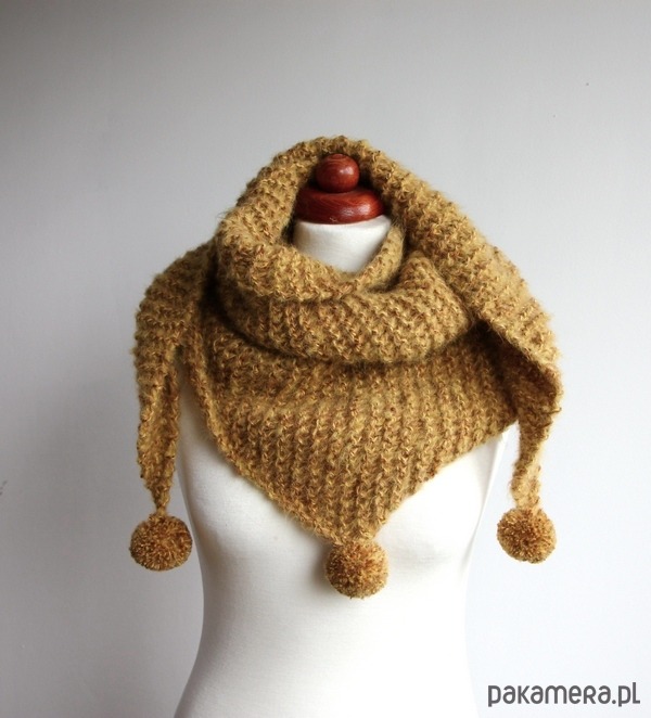 Uroku dodają trzy pomponiki wykonane z tej samej przędzy co chusta.