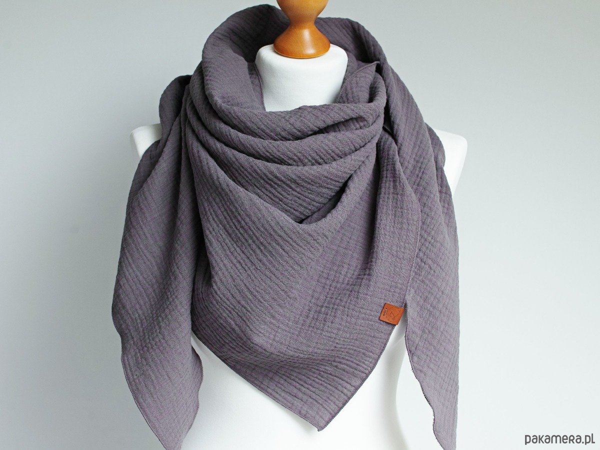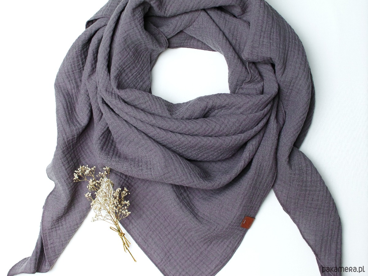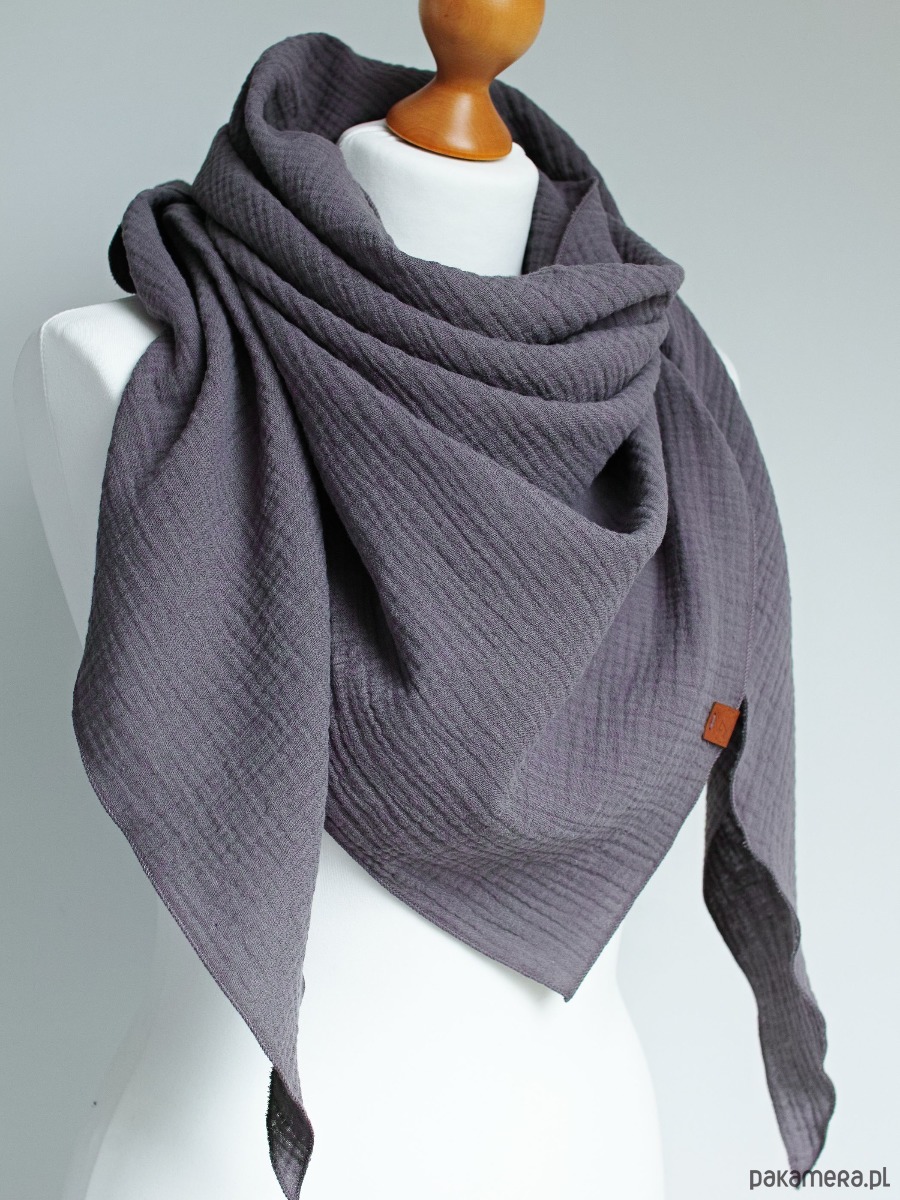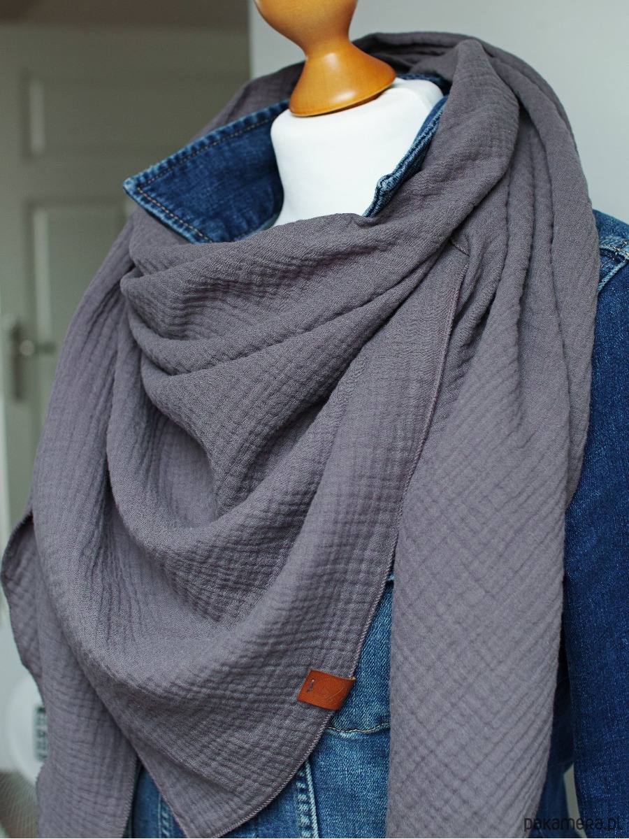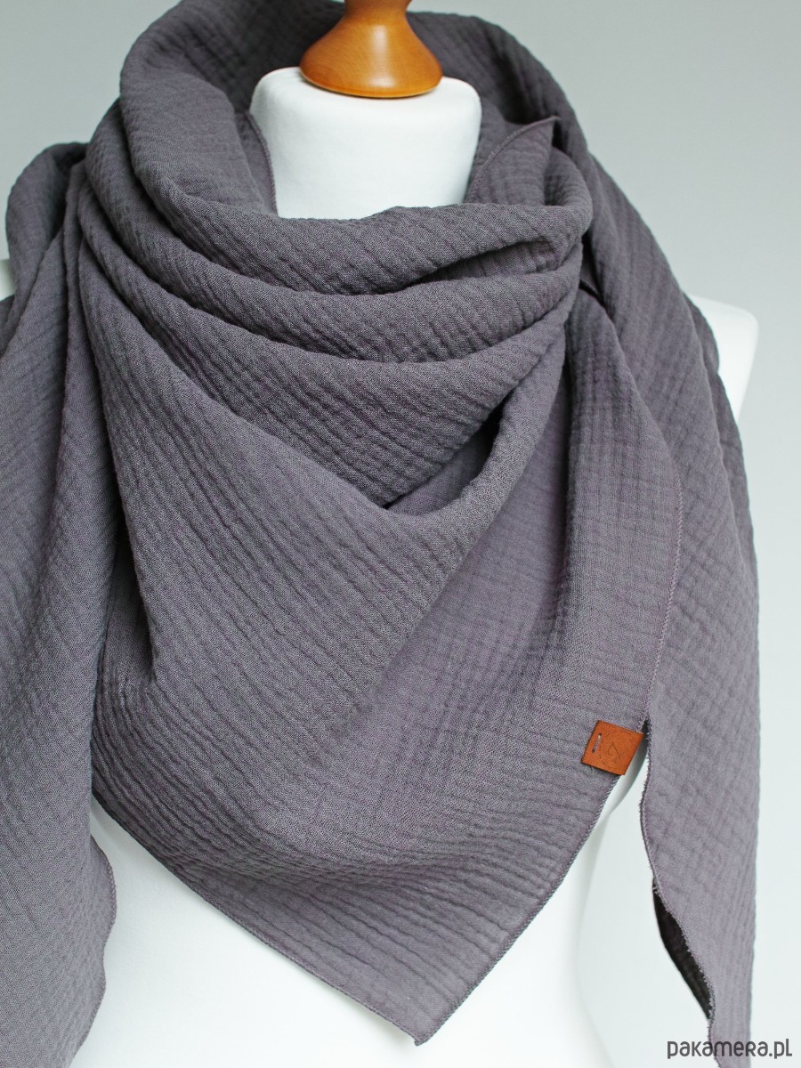 Miękka i bardzo przyjemna w dotyku chusta damska w kolorze grafitowym. Chusta została uszyta z delikatnej tkaniny bawełnianej - muślinu, który jest bardzo przyjemny dla skóry.