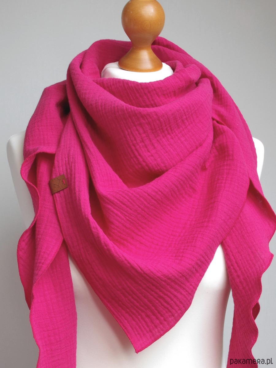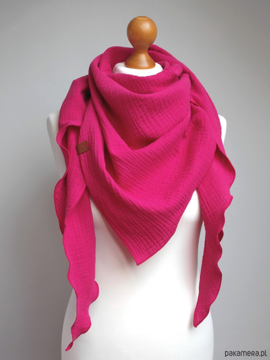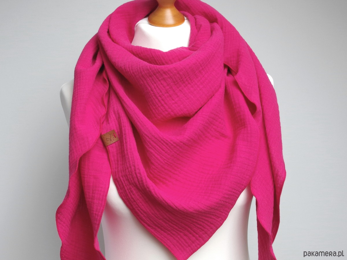 Miękka i bardzo przyjemna w dotyku chusta damska w kolorze różowym. Chusta została uszyta z delikatnej tkaniny bawełnianej - muślinu, który jest bardzo przyjemny dla skóry.