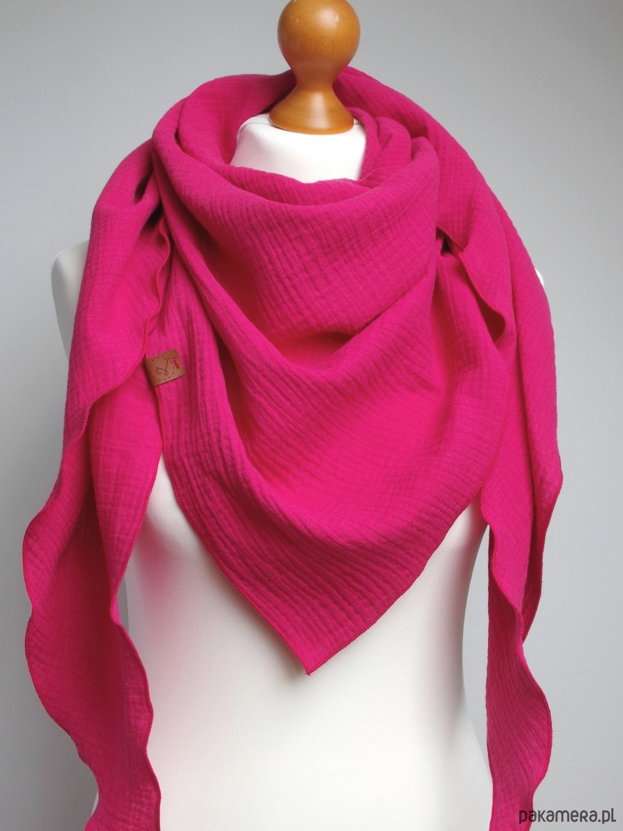Miękka i bardzo przyjemna w dotyku chusta damska w kolorze różowym. Chusta została uszyta z delikatnej tkaniny bawełnianej - muślinu, który jest bardzo przyjemny dla skóry.