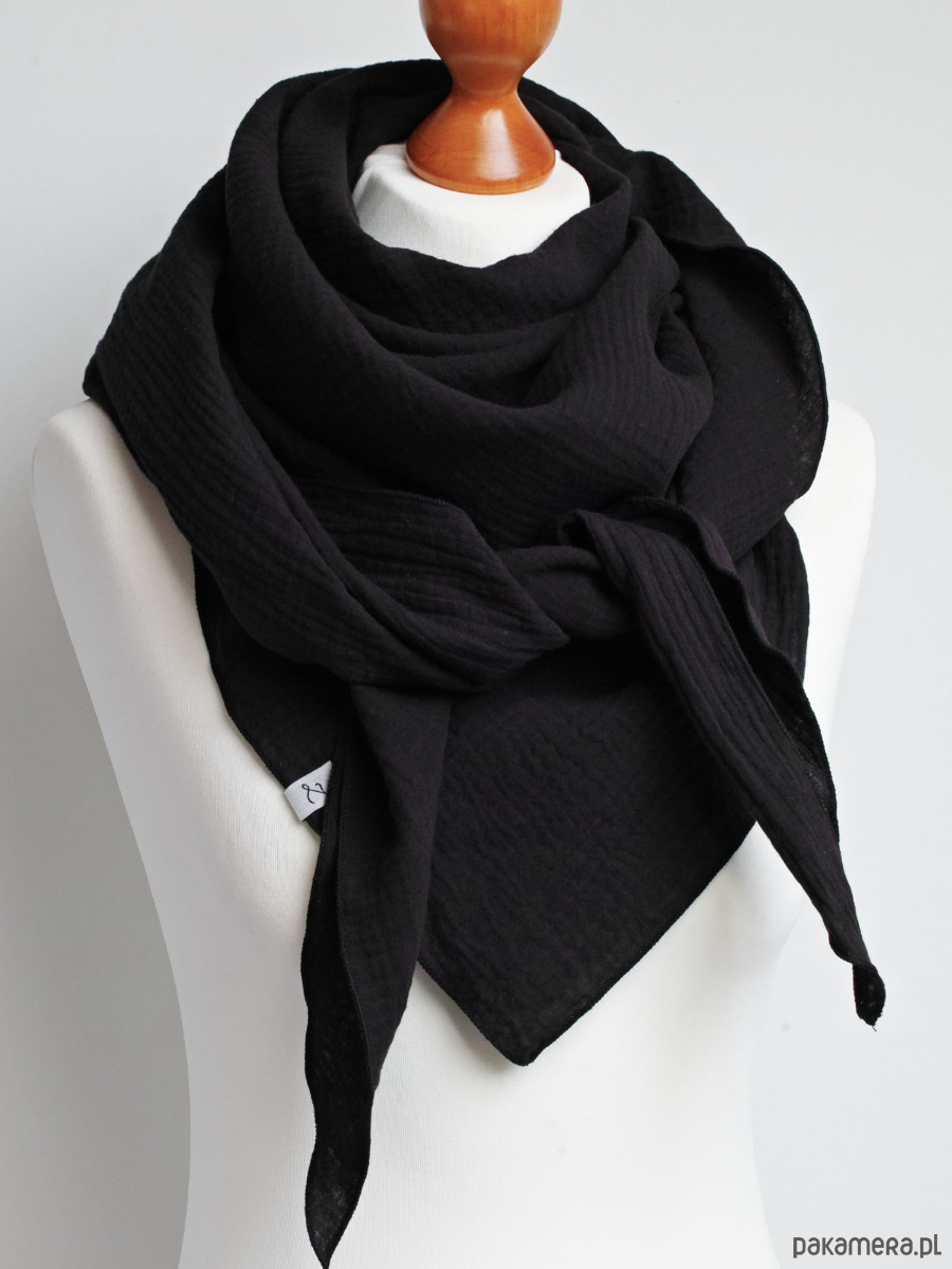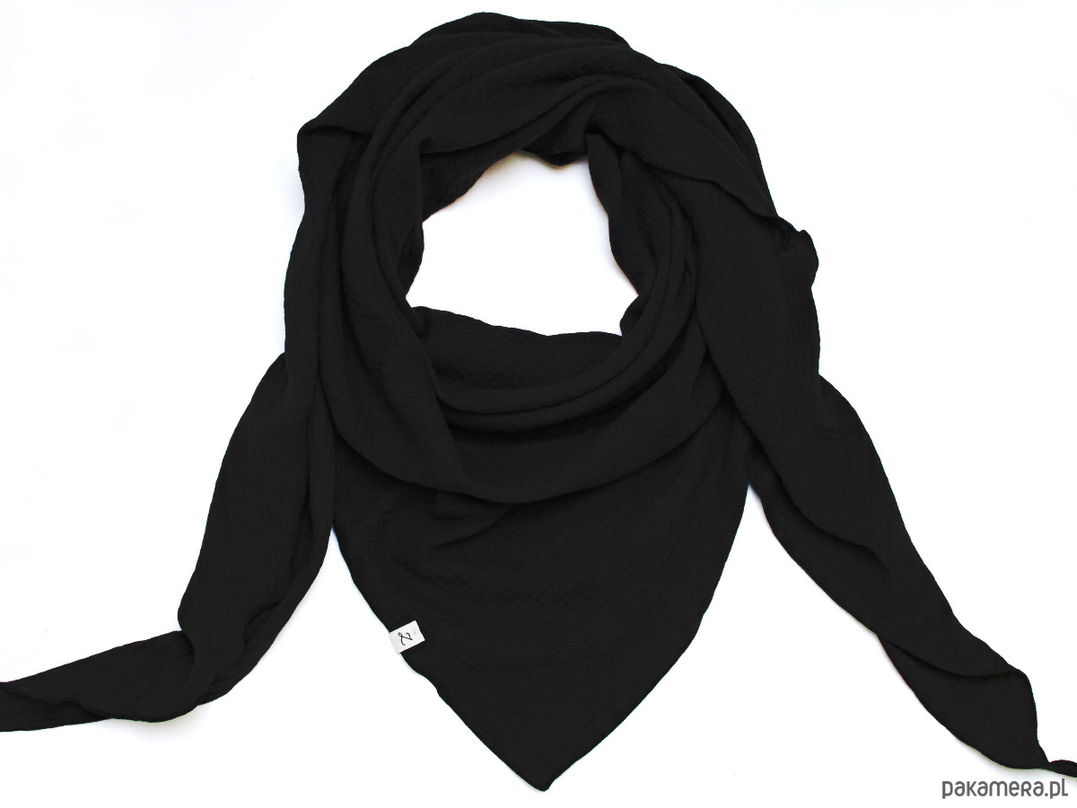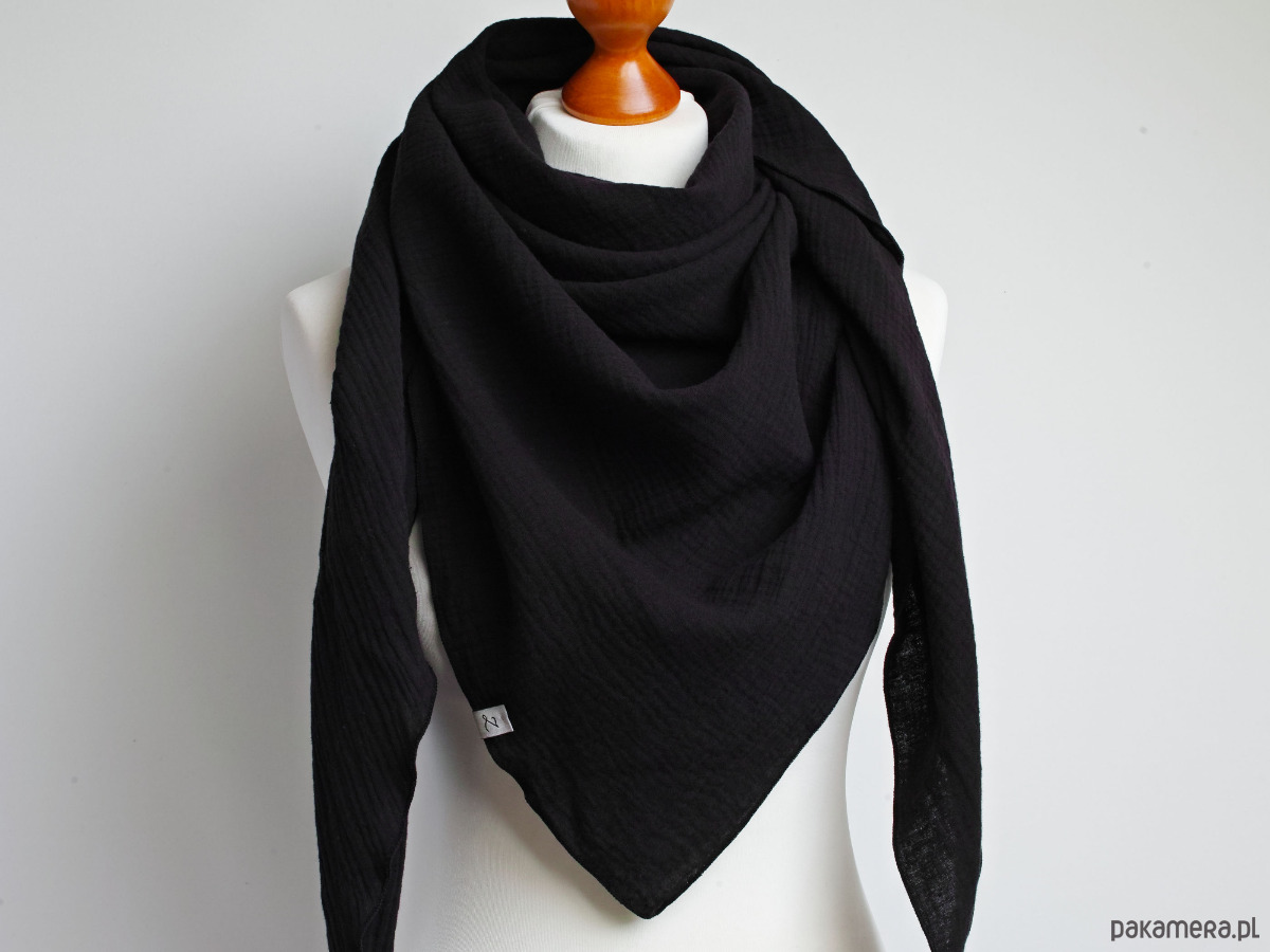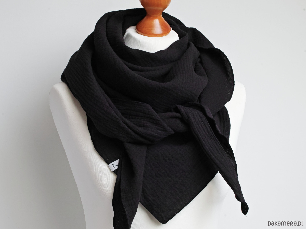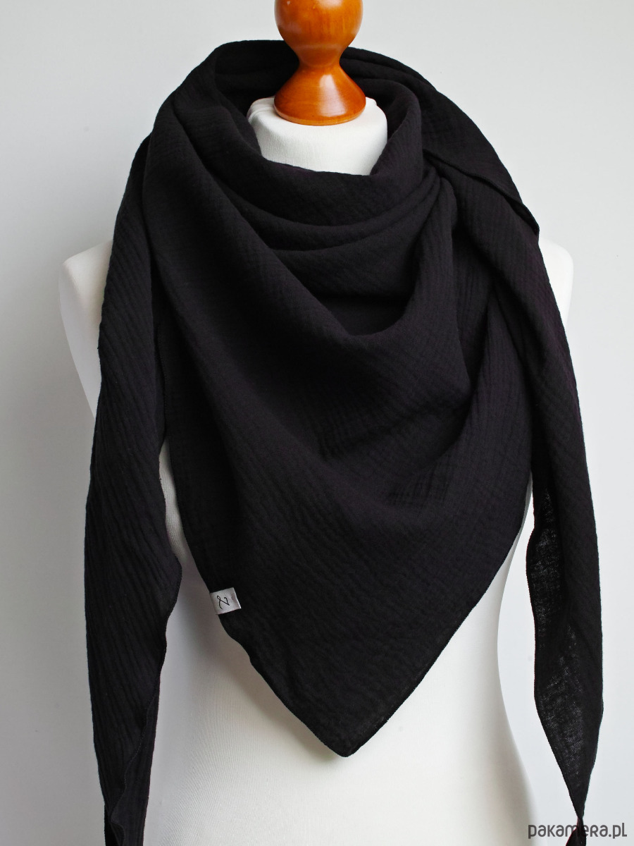 Miękka i bardzo przyjemna w dotyku chusta damska w kolorze CZARNYM. Chusta została uszyta z delikatnej tkaniny bawełnianej - muślinu, który jest bardzo wygodny w noszeniu.