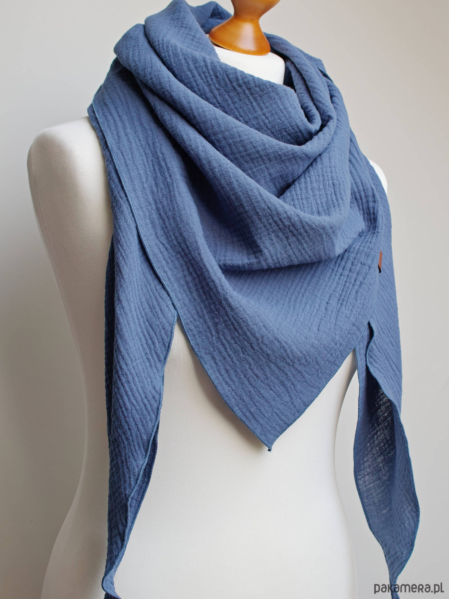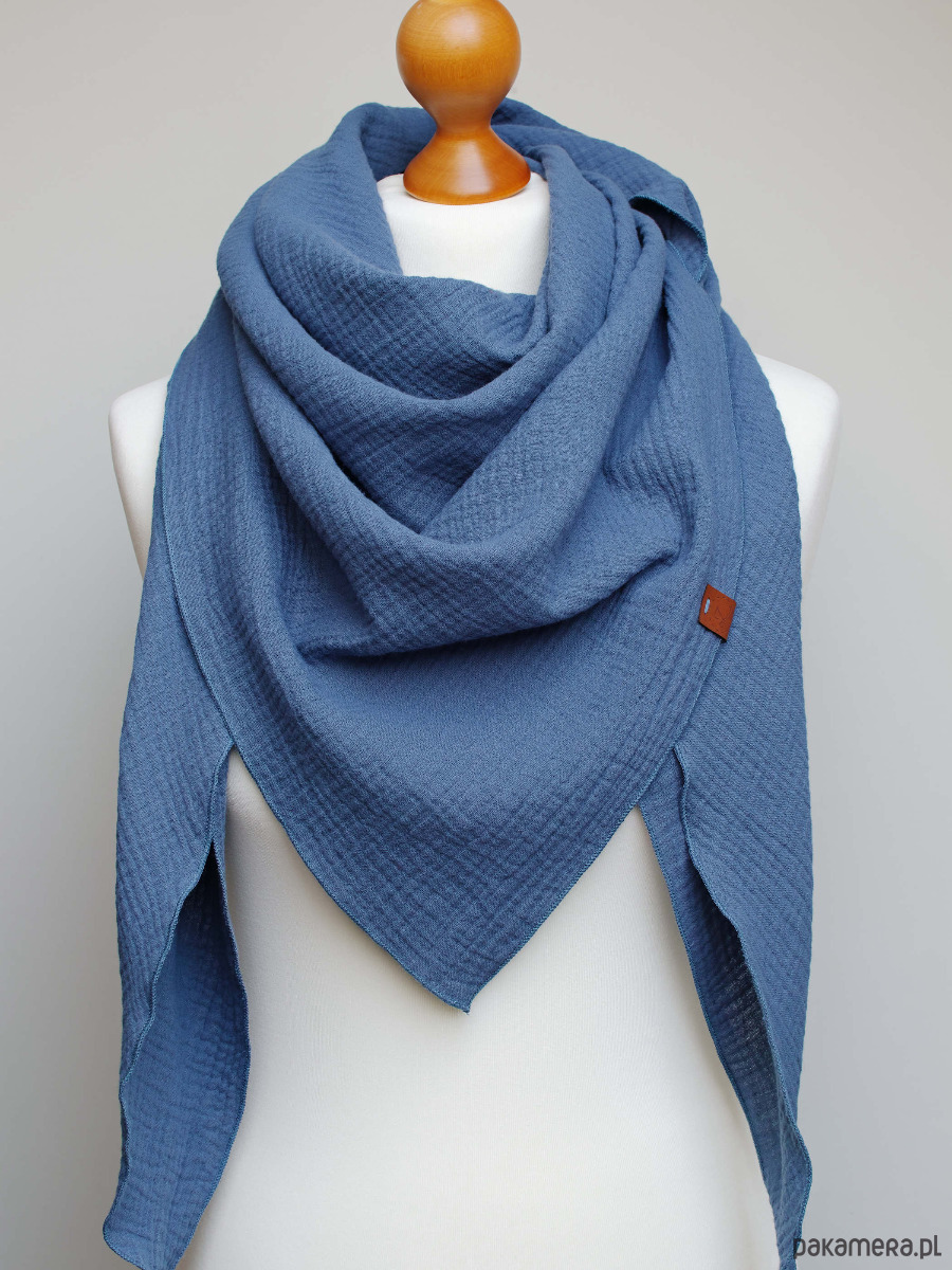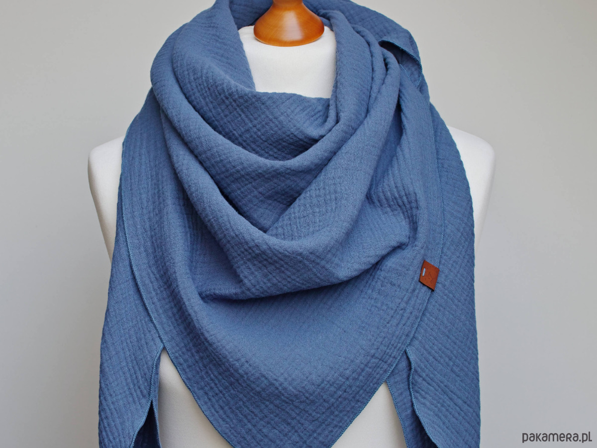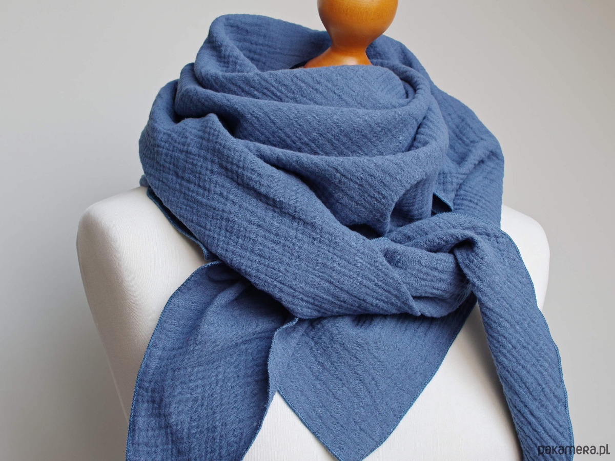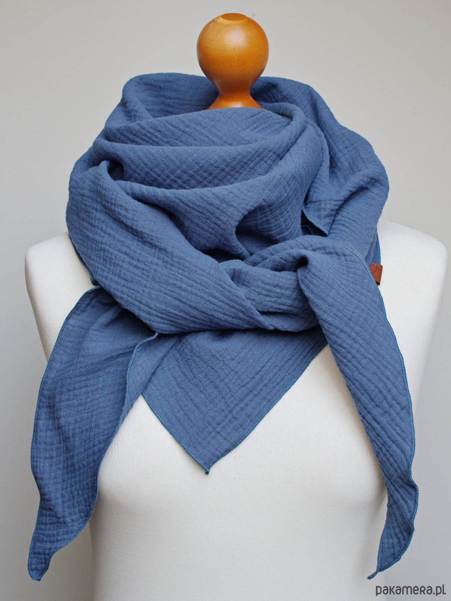 Miękka i bardzo przyjemna w dotyku chusta damska w kolorze niebieskim. Chusta została uszyta z delikatnej tkaniny bawełnianej - muślinu, który jest bardzo przyjemny dla skóry.