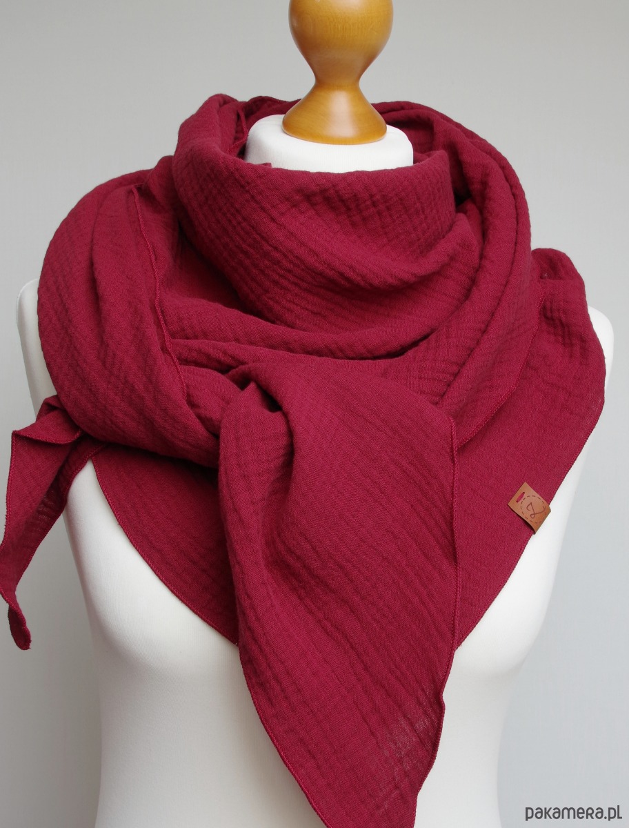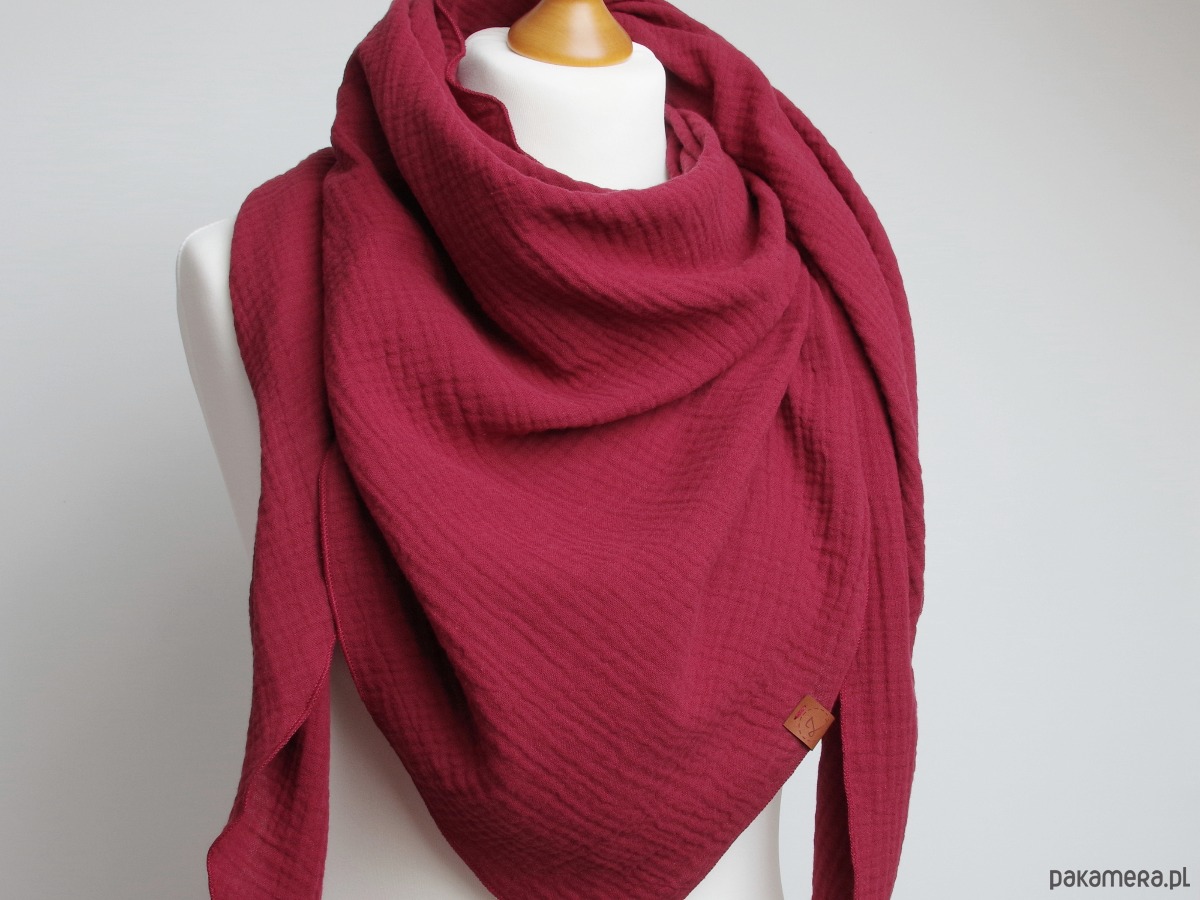 Miękka i bardzo przyjemna w dotyku chusta damska w kolorze bordowym. Chusta została uszyta z delikatnej tkaniny bawełnianej - muślinu, który jest bardzo przyjemny dla skóry.