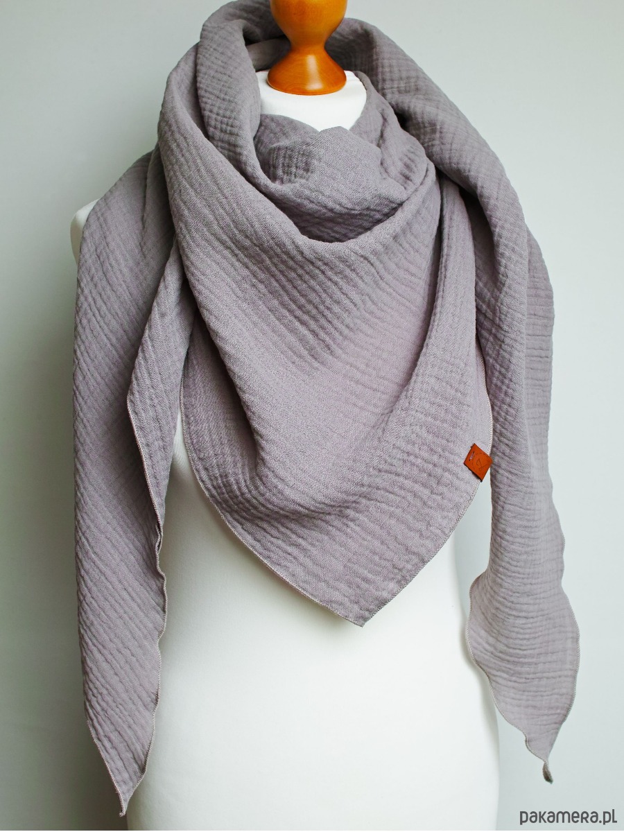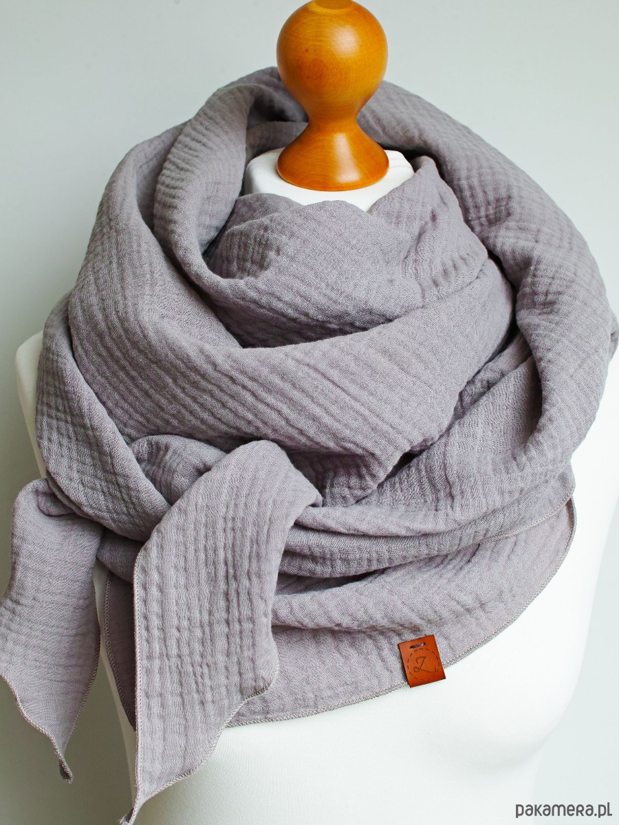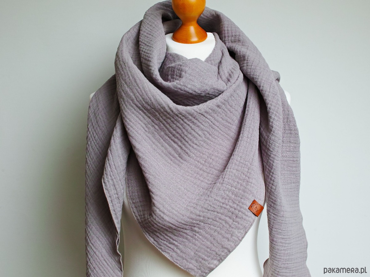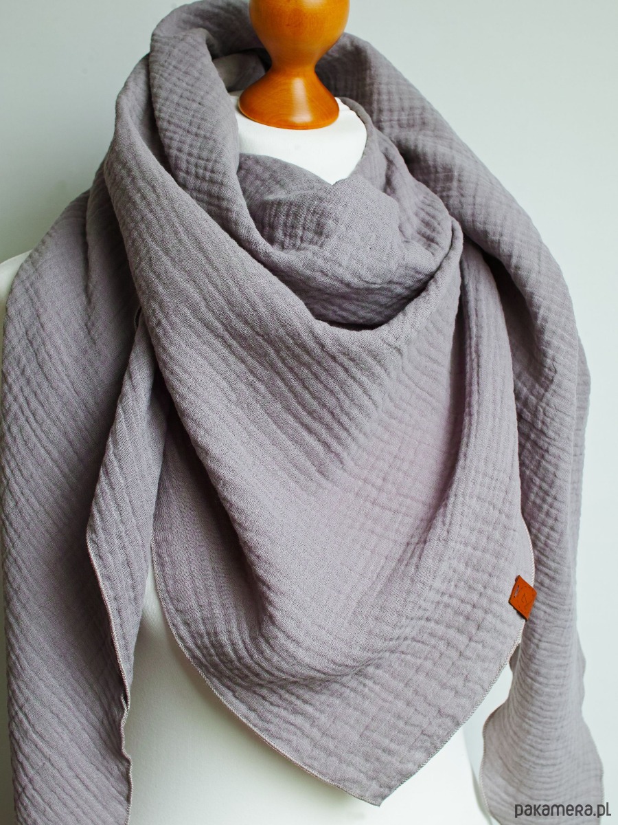 Miękka i bardzo przyjemna w dotyku chusta damska w kolorze szarym. Chusta została uszyta z delikatnej tkaniny bawełnianej - muślinu, która jest bardzo przyjemny dla skóry.
