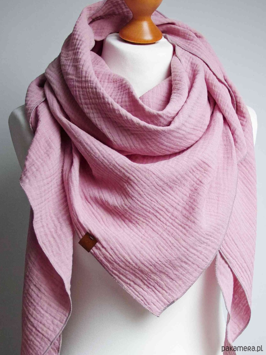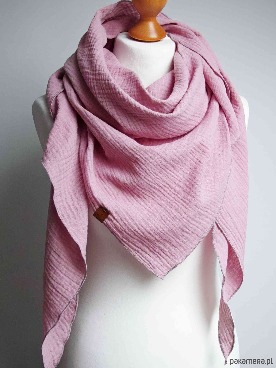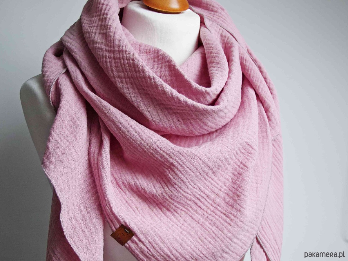 Miękka i bardzo przyjemna w dotyku chusta damska w kolorze pudrowego różu. Chusta została uszyta z delikatnej tkaniny bawełnianej - muślinu, który jest bardzo przyjemny dla skóry, delikatny i miękki.