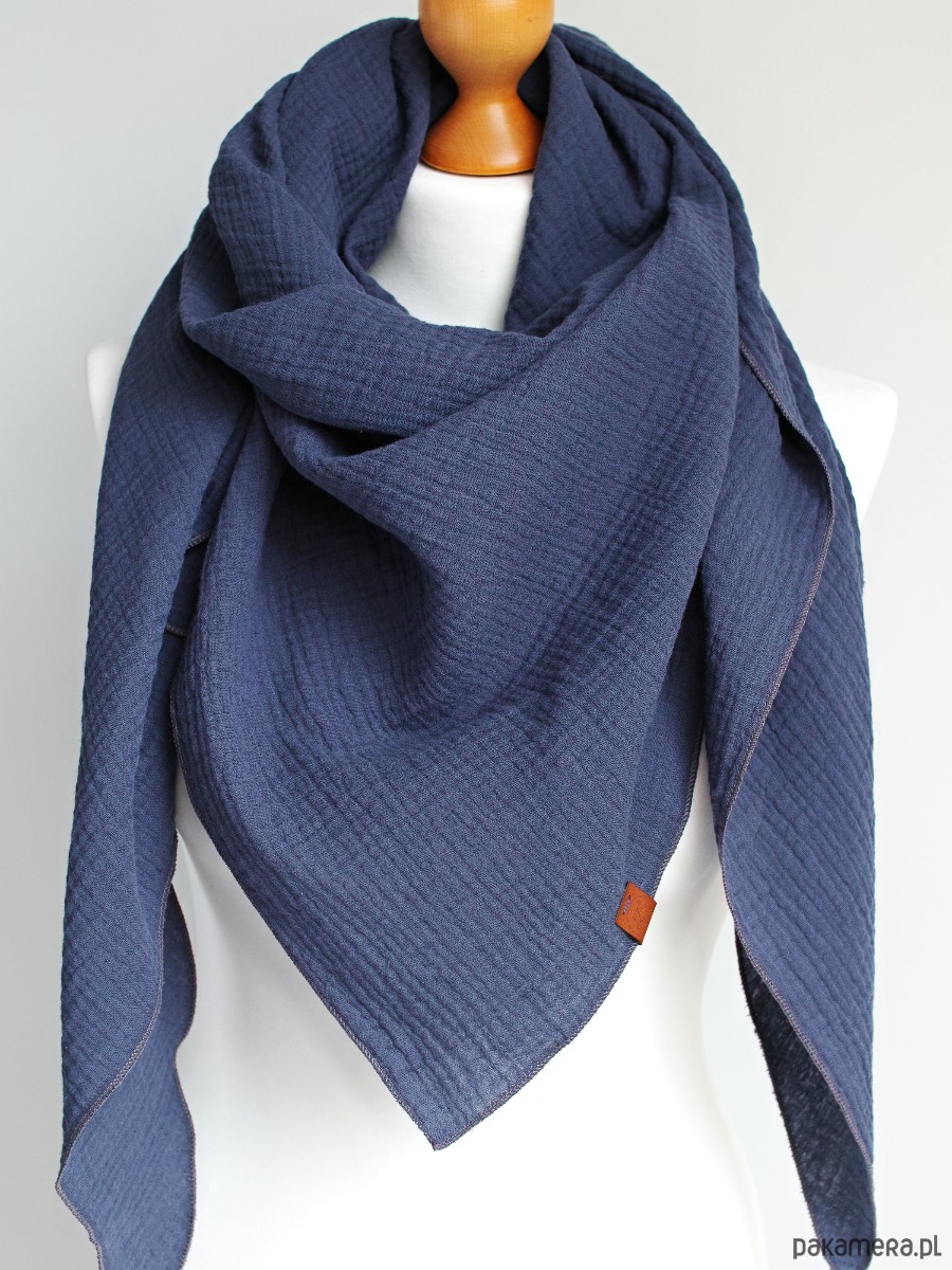 Miękka i bardzo przyjemna w dotyku chusta damska w kolorze granatowym/jeansowym. Chusta została uszyta z delikatnej tkaniny bawełnianej - muślinu, który jest bardzo przyjemny dla skóry.