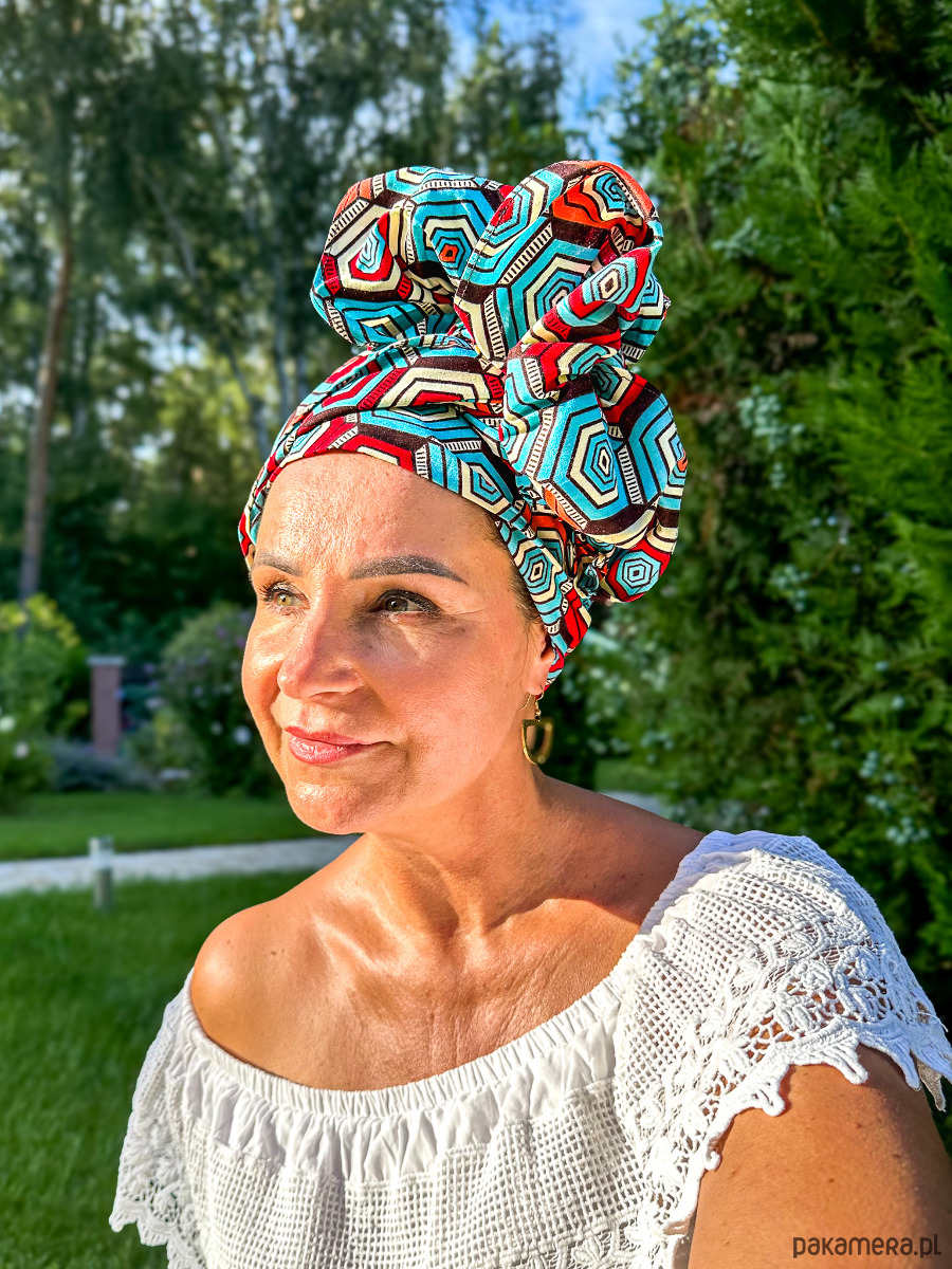 Chusta na afrykański Arykański Turban wykonany z materiału 100% bawełny o mocnym splocie, barwionym metodą wax printing. Dzięki najwyższej gatunkowo tkaninie produkt jest niezwykle wytrzymały i sprawdzi się o każdej porze roku. Materiał we wzory afrykańskie!