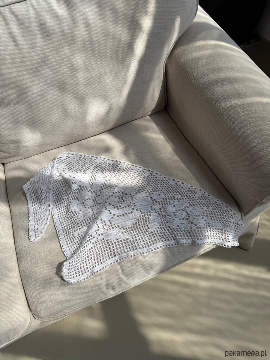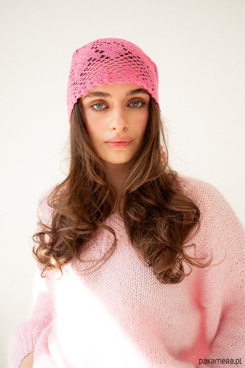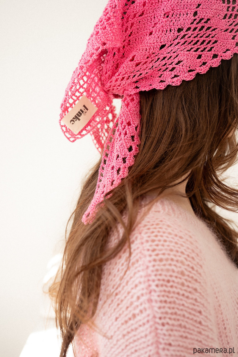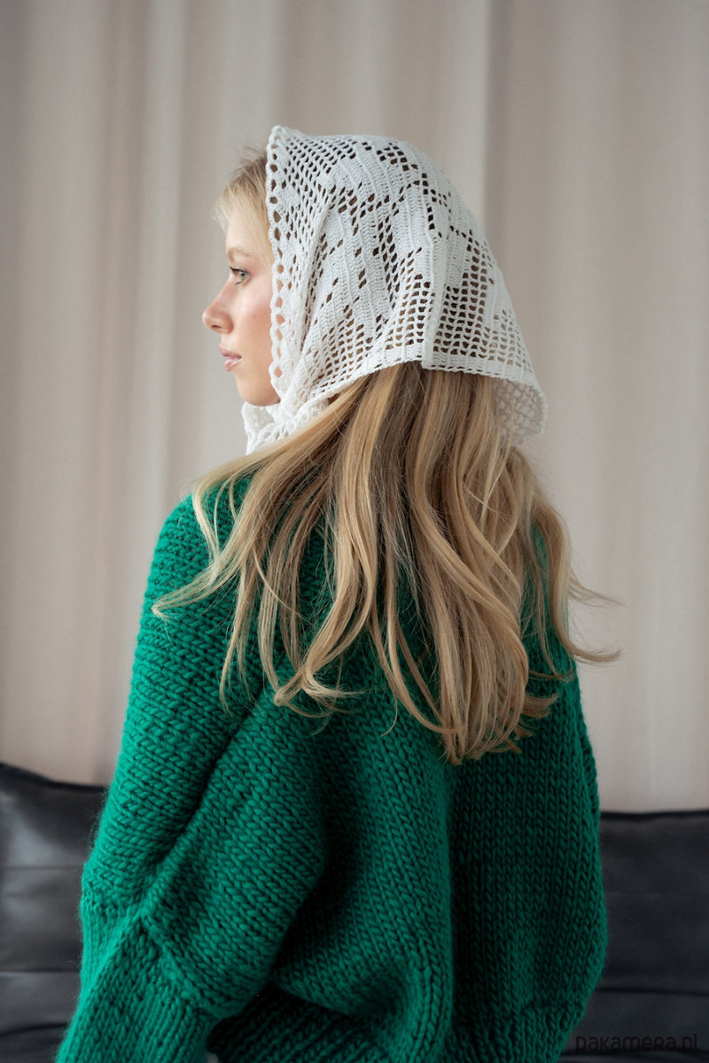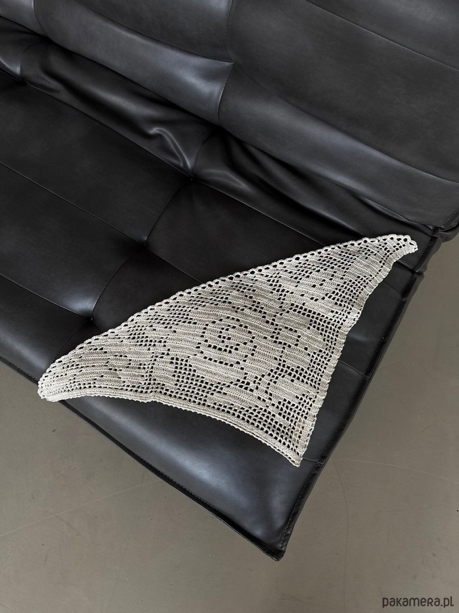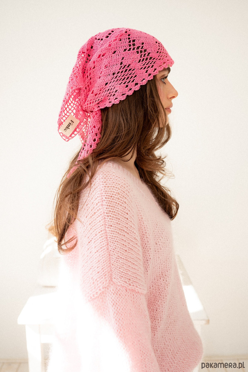 Ręcznie szydełkowana chusta / bandana z bawełny w przepięknym wzorze róż. Chustę tę można nosic na głowie na kilka sposobów, mozna ją wykorzystać jako top, przewiązać na spodniach, narzucić na ramiona, użyć jako chusty pod szyje czy ozdobnie zawiązać przy torebce. Jeden produkt a cała masa zastosowań. Dzieki bawełnie chusta jest delikatna, lekka, przewiewna i bardzo miła dla skóry.