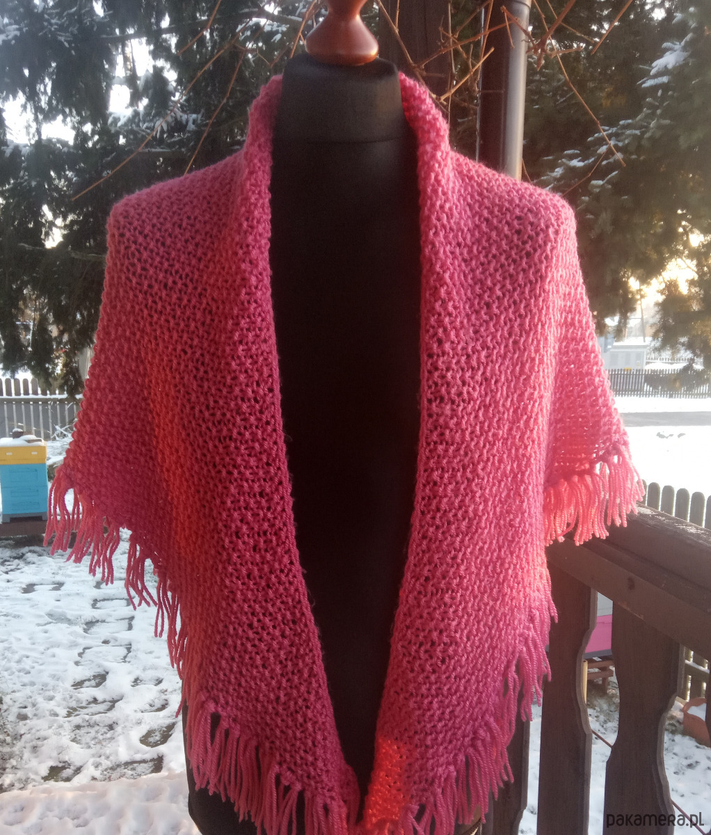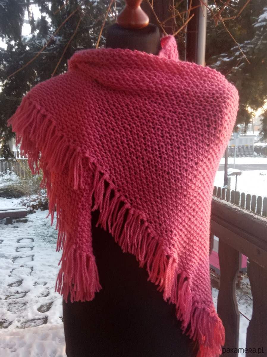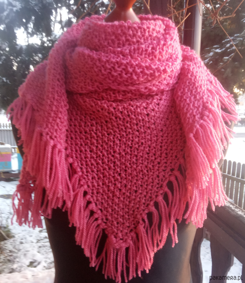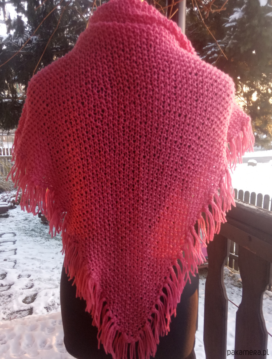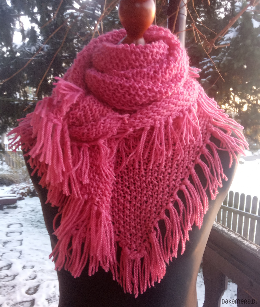 Chusta wykonana w całości ręcznie na drutach z bardzo dobrej jakościowo włóczki akrylowej, zakończona puszystymi i dekoracyjnymi frędzlami. Jest bardzo miła w dotyku, lekka i rozciągliwa. Zastosowany wzór (tzw, ryż) sprawia, że chusta jest klasyczna i ponadczasowa. Ciepło otuli i doda uroku jesienno - zimowej stylizacji.