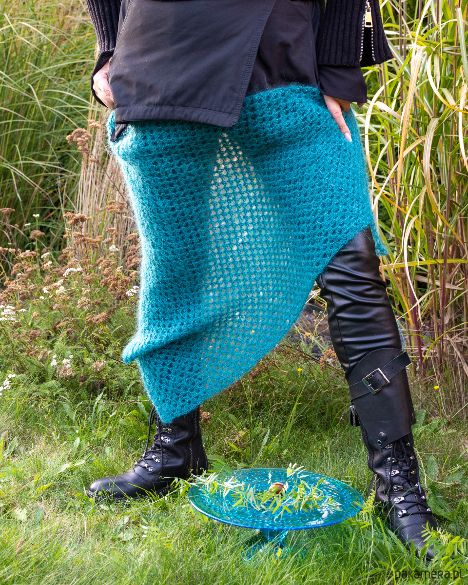 Wykonana z luksusowej przędzy o wyjątkowo cienkiej strukturze, moher z jedwabiem, w ażurowy wzór, który przypomina delikatny splot pajęczej nici. Każdy rząd to harmonijna gra oczek i przestrzeni, tworząca niepowtarzalny, lekki ażur.